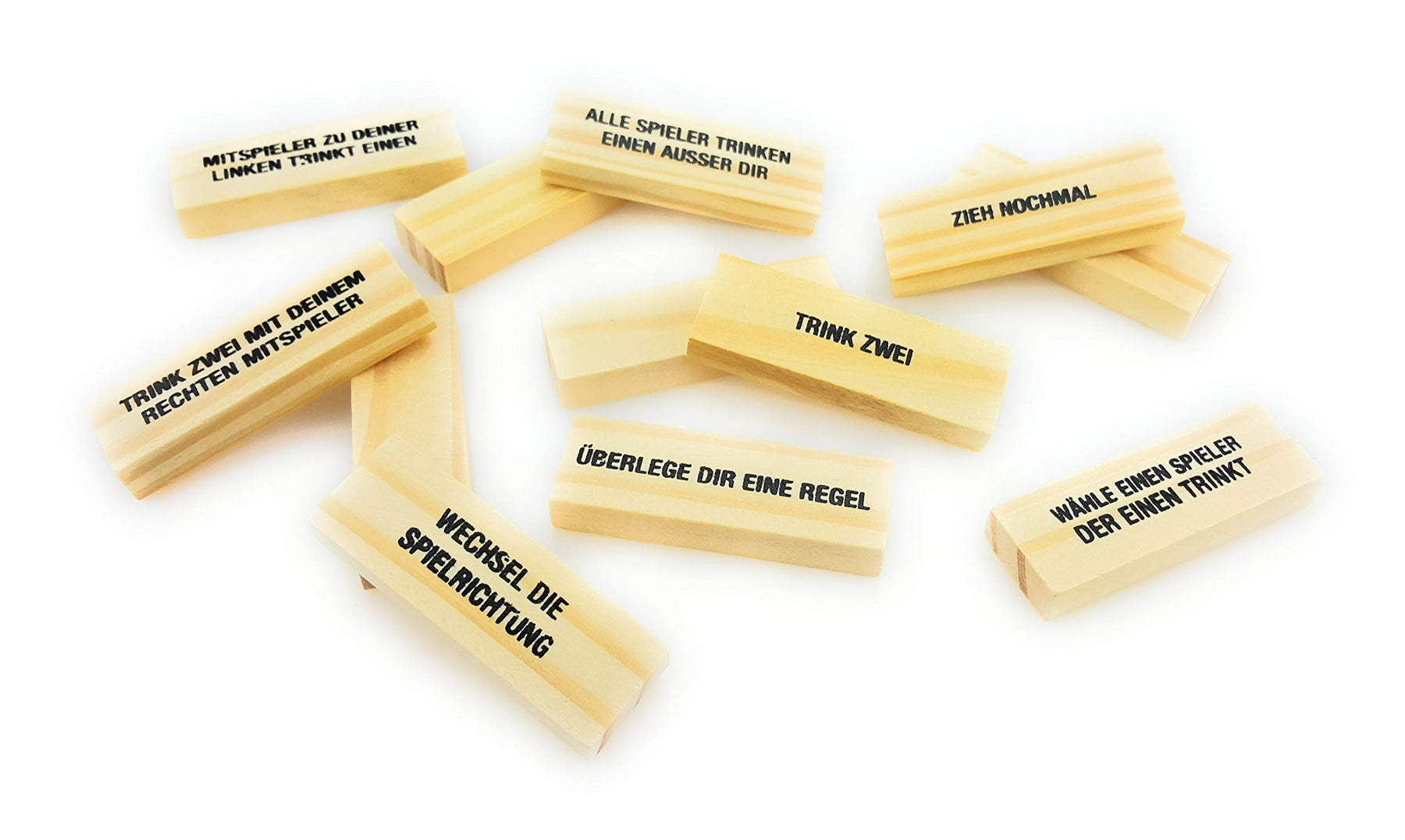 • Das Spiel ist für zwei bis vier Spieler gedacht. Wird ein beschrifteter Holzklotz herausgezogen, so muss die Aufgabe ausgeführt werden. Zieht ein Spieler einen nicht bedruckten Klotz, so hat er Glück gehabt.