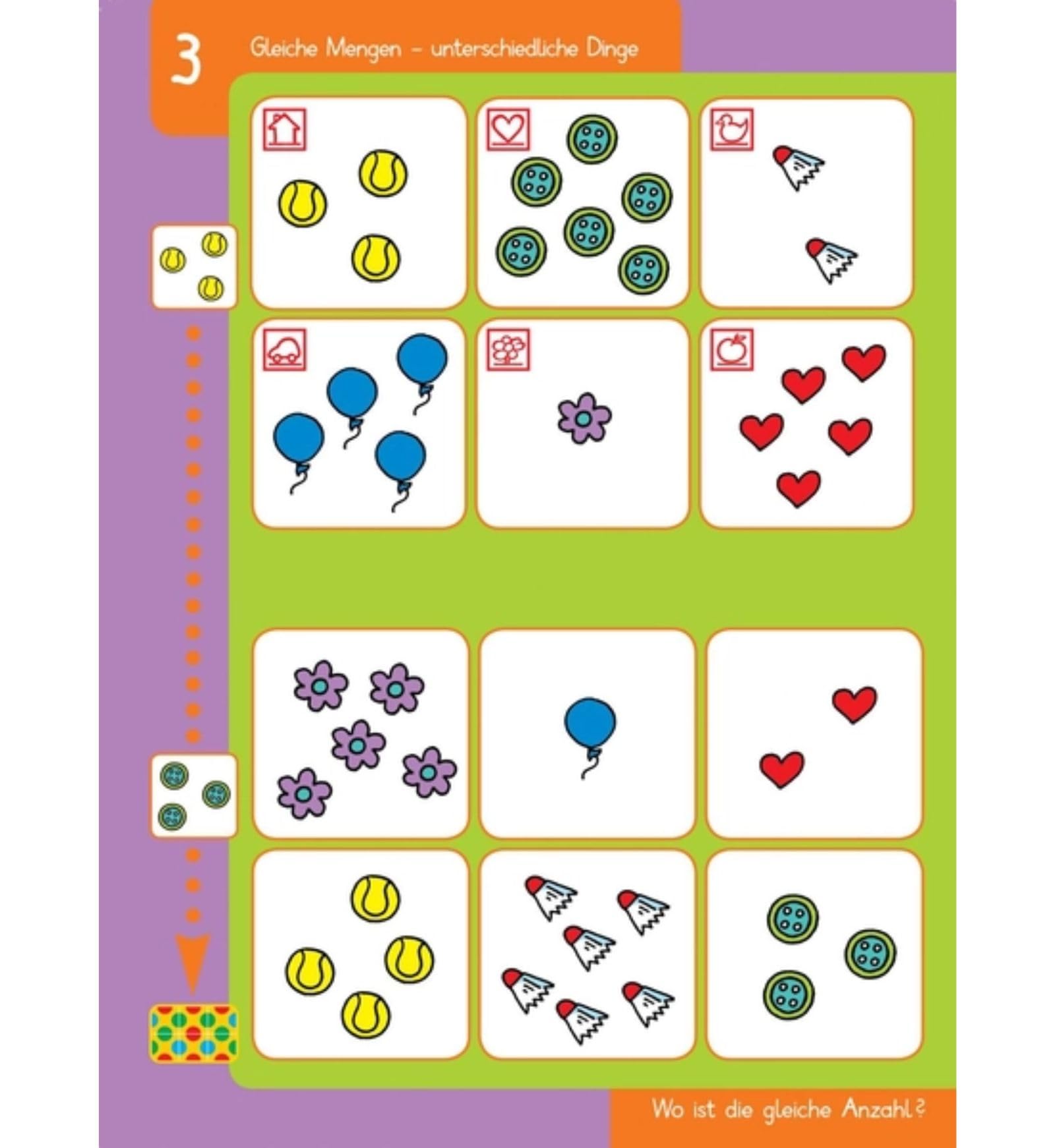 INHALT Gleiche Mengen, gleiche Dinge Gleiche Mengen, unterschiedliche Dinge Die größere Menge derselben Dinge ? Wo ist eins mehr von derselben Sorte? Die kleinere Menge derselben Dinge ? Wo ist eins weniger von derselben Sorte? Mengen vergleichen ? Finde die größere Menge Mengen vergleichen ? Finde die kleinere Menge Gleiche Würfelpunkte Mengen und Würfelpunkte Würfelpunkte und Mengen