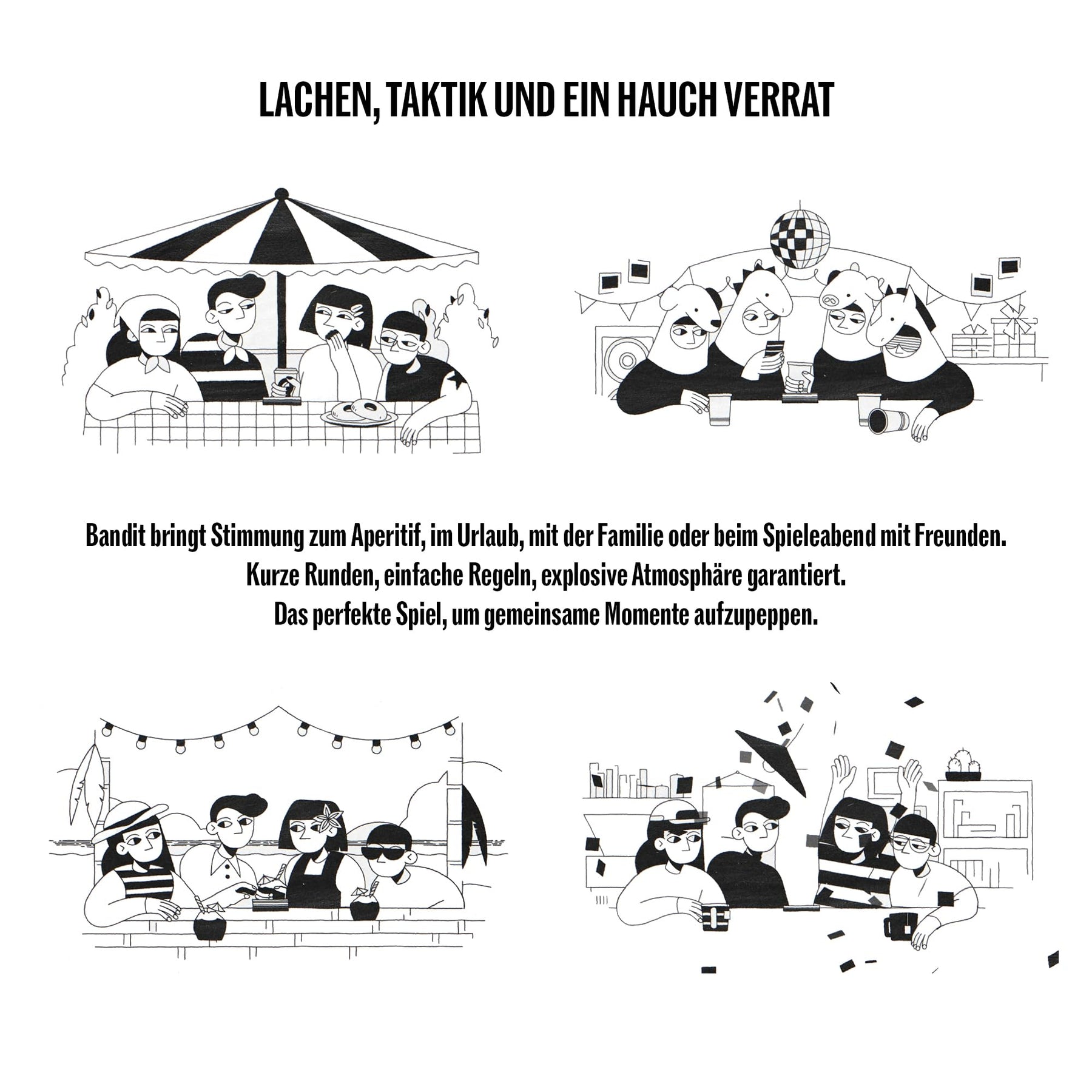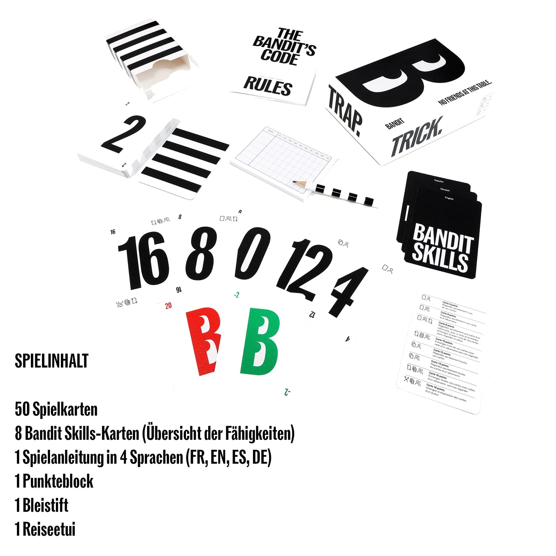 • Kompaktes Format, einfache Regeln, hohe Wiederspielbarkeit: BANDIT ist in zwei Minuten erklärt und passt in jede Tasche. Mit Reise-Etui und Aktionskarten ist es ein ideales Reisespiel, das durch seine Vielfalt immer wieder neue Spielerlebnisse schafft.