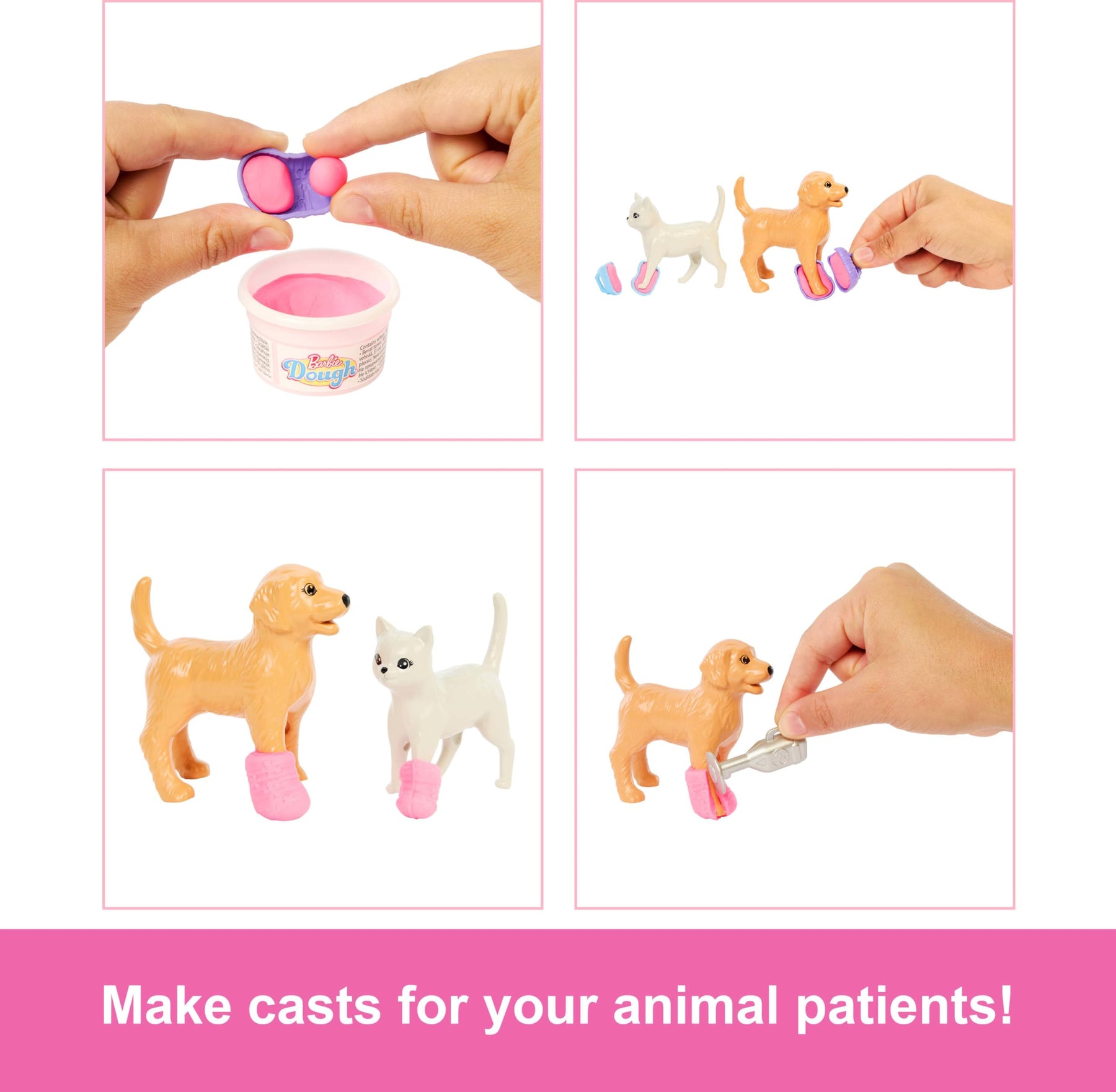 • Wenn die Tierärztin feststellt, dass sich ein Patienten das Bein gebrochen hat, kann sie mit der Knetmasse und den Gipsformen einen rosa Gipsverband herstellen.