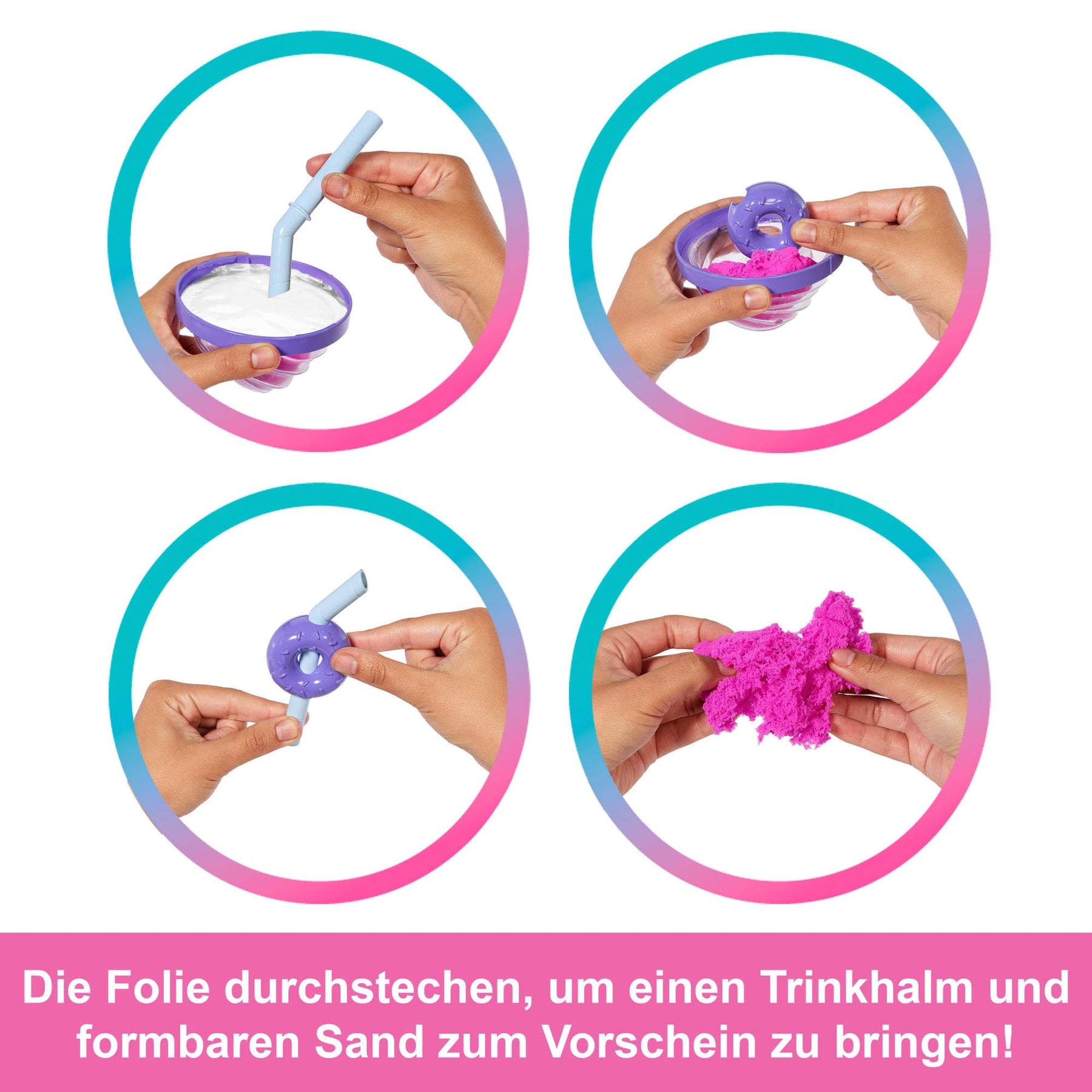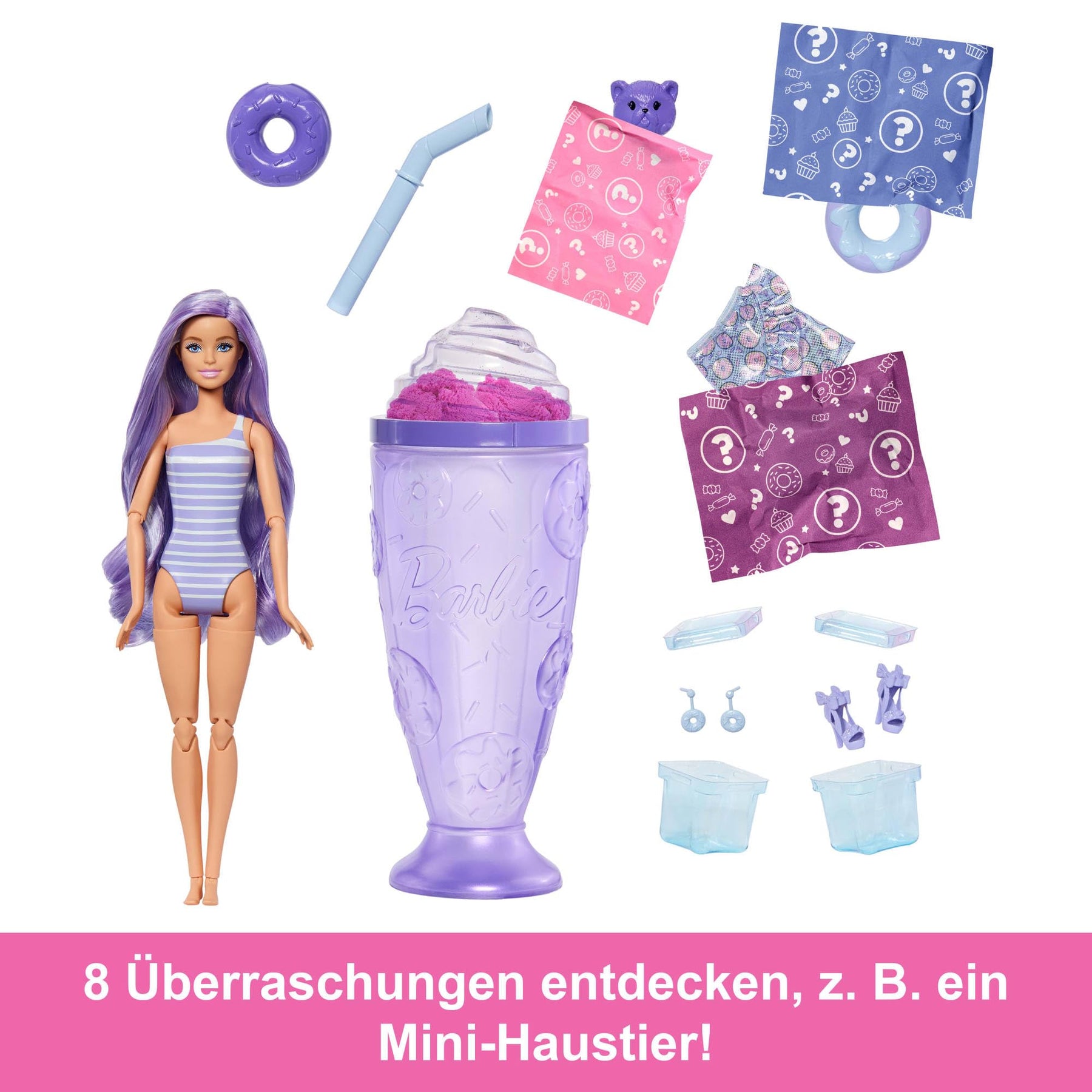 Die Puppen der Barbie Pop Reveal Treat-Serie sprechen die Sinne an. Innen warten acht Überraschungen in einem von Süßigkeiten inspirierten Becher! Wird der Deckel mit dem Sahnehäubchen abgeschraubt, kommt formbarer Sand zum Vorschein, und die Folie kann für Squishy-Spaß mit dem Trinkhalm durchstochen werden. Wird die Folie vom Becher abgezogen, kommen eine nach Süßigkeiten duftende Barbie-Puppe und sechs weitere Überraschungen zum Vorschein! Welche Puppe wird es sein? Es gibt die Puppen Donut Dreams, Cool Cupcake und Sweet Swirl. Beim weiteren Auspacken lassen sich zwei wiederverwendbare Eiswürfel entdecken, die passende Ohrringe und ein Paar Schuhe oder Stiefel enthalten. Die Überraschungstüten verbergen einen bunten Rock, ein duftendes Squishy-Haustier und ein passendes Haustierbettchen. Für noch mehr Wow-Momente sorgen die Farbwechsel im Gesicht der Barbie-Puppe! Für tollen Sammelspaß! Alle Puppen separat erhältlich. Die Puppen können nicht von allein stehen. Abweichungen in Farbe und Gestaltung vorbehalten.