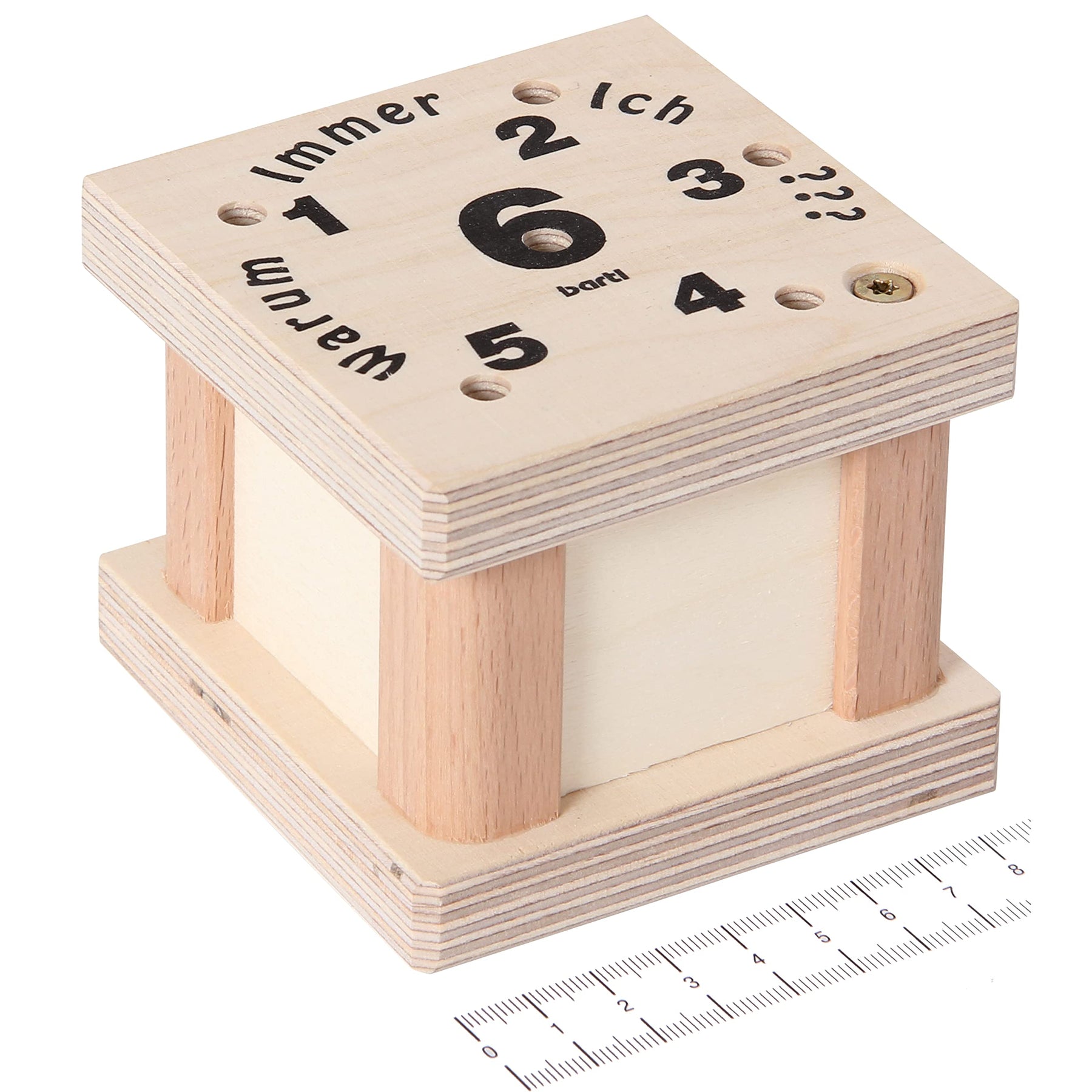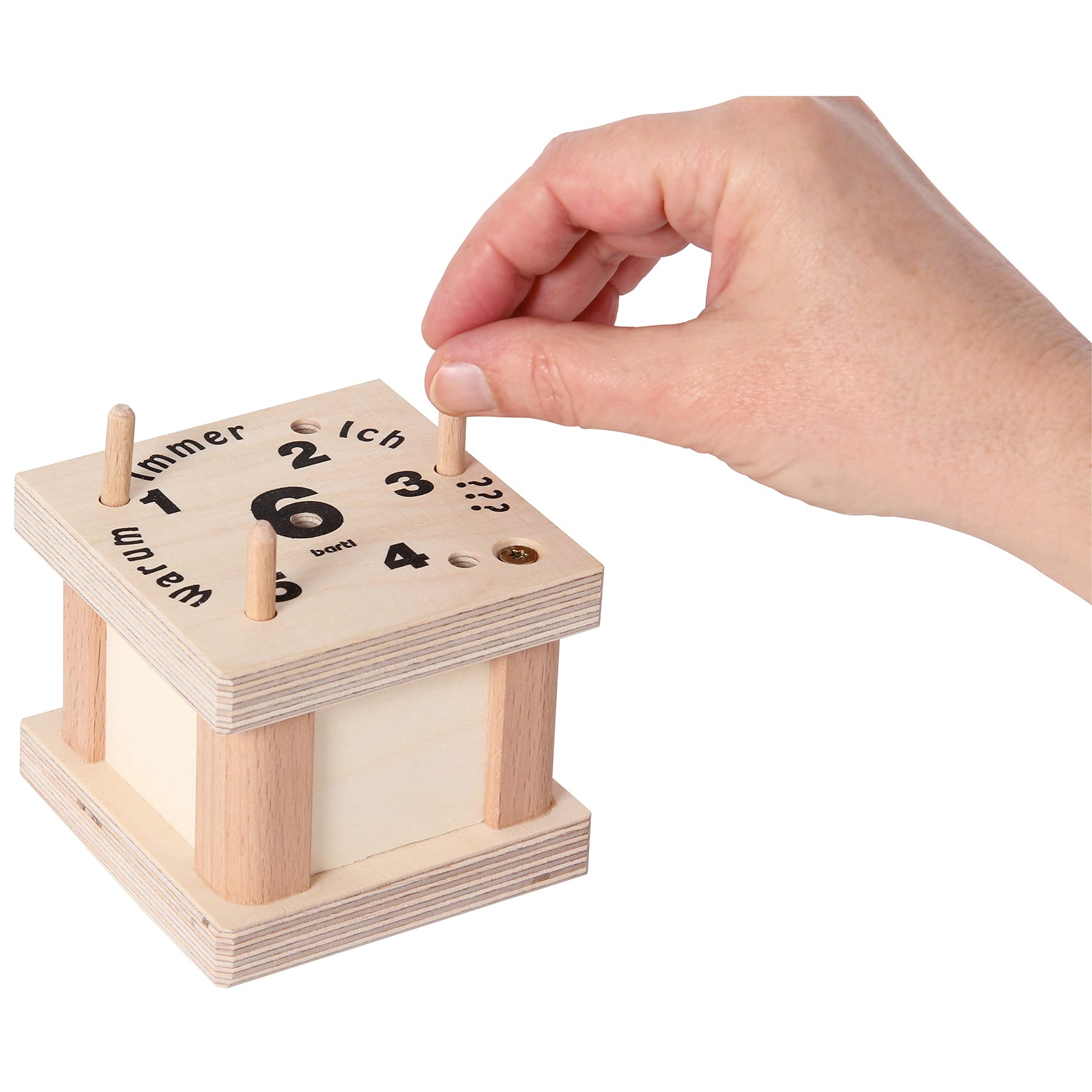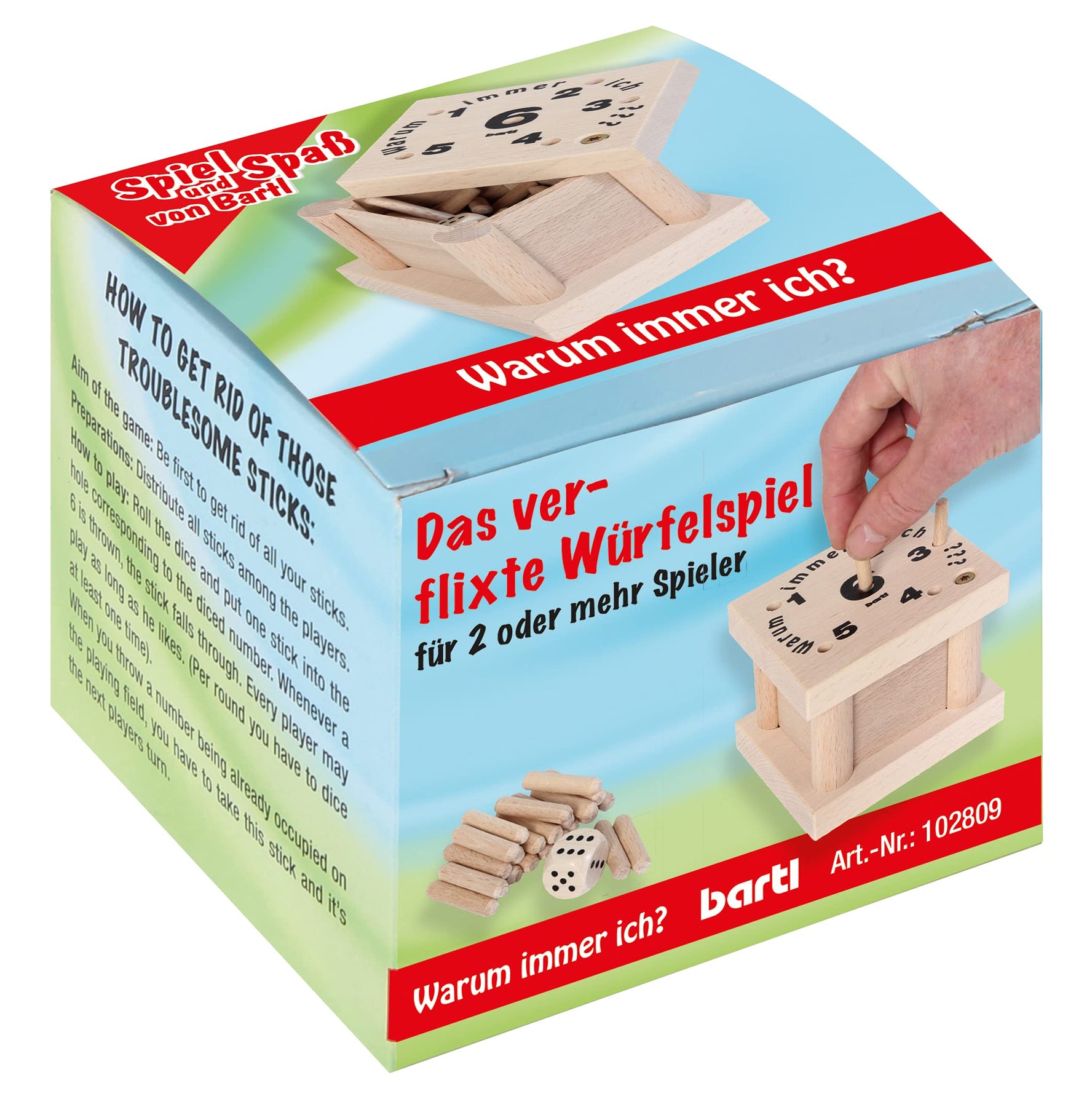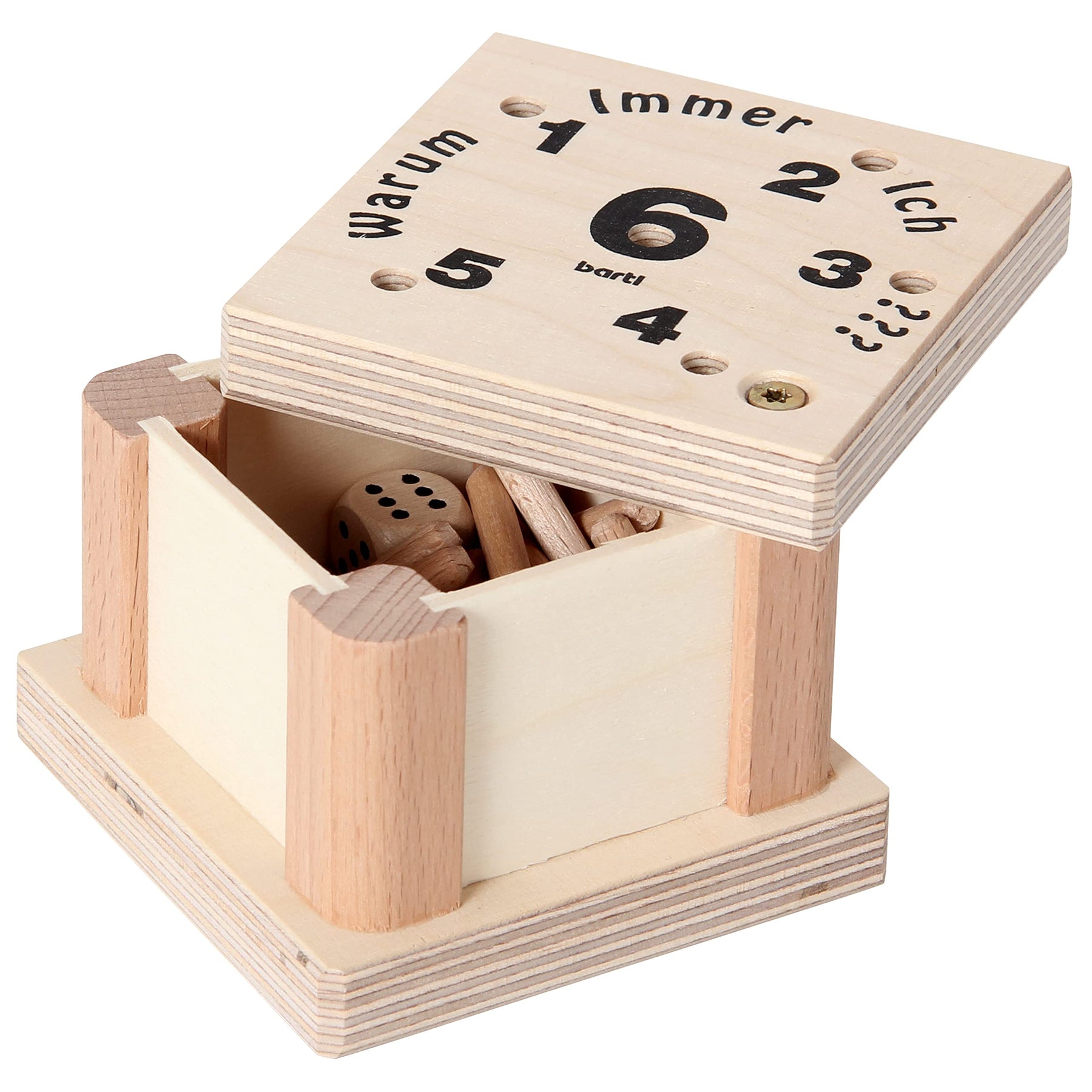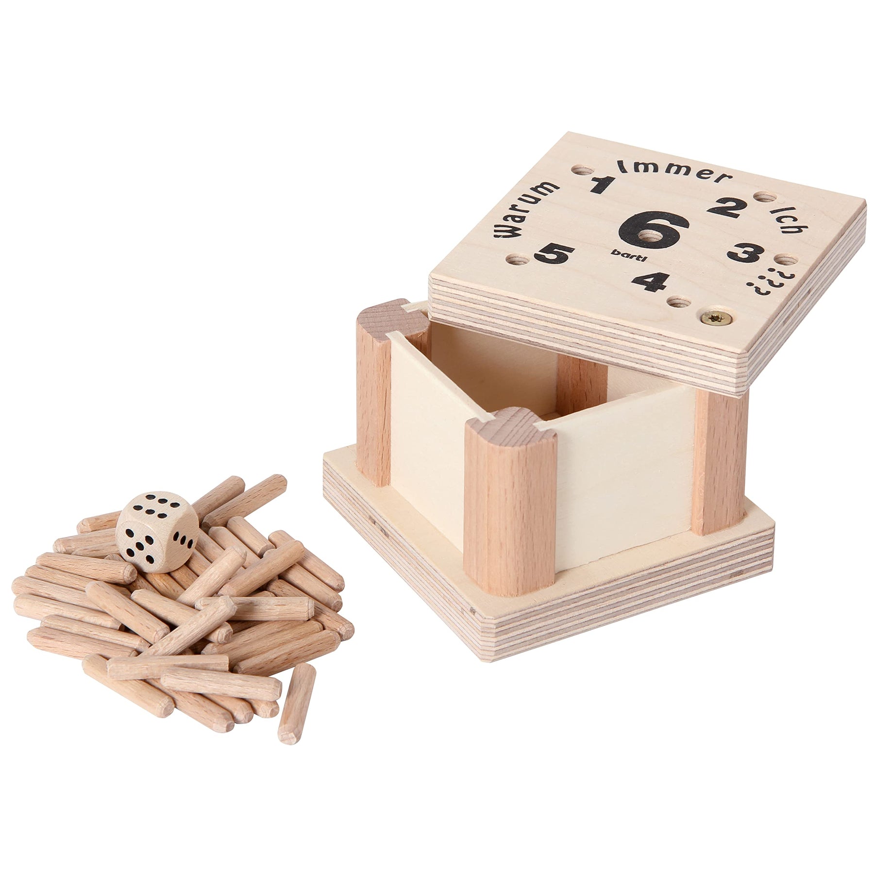 Beliebtes Würfelspiel für zwei und mehr Personen jeden Alters. So geht es: Alle Holzstäbe werden an die Spieler verteilt. Würfelnd werden die Felder des Spielbretts entsprechend der Augenzahlen besetzt. Bei 6 fällt das Stäbchen durch. Ist ein Feld bereits besetzt, muss der Spieler den Stab nehmen, und der Nächste ist dran. Wer keine Holzstäbe mehr hat, gewinnt. Und bald werden Sie wissen, warum das Spiel Warum immer ich? heißt!