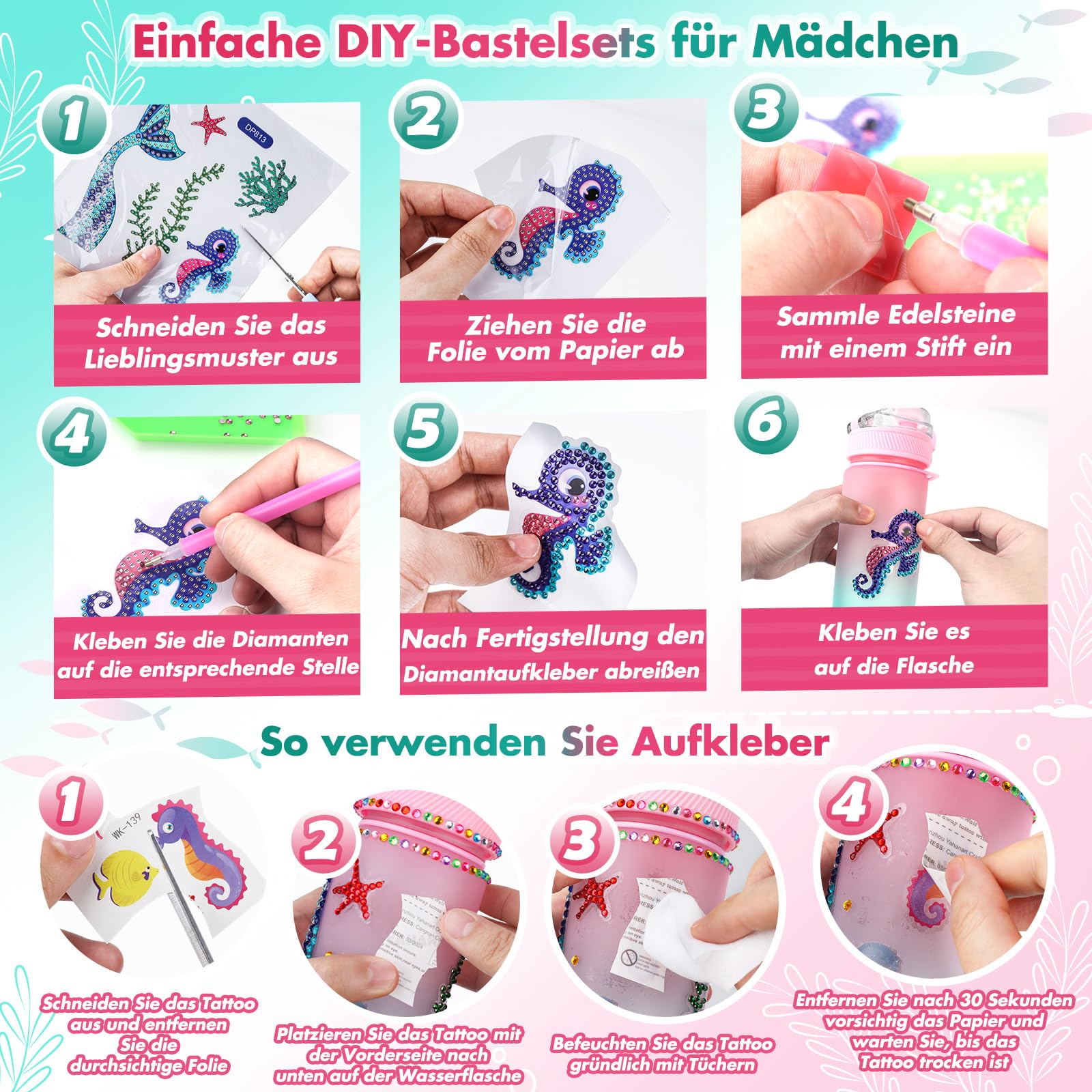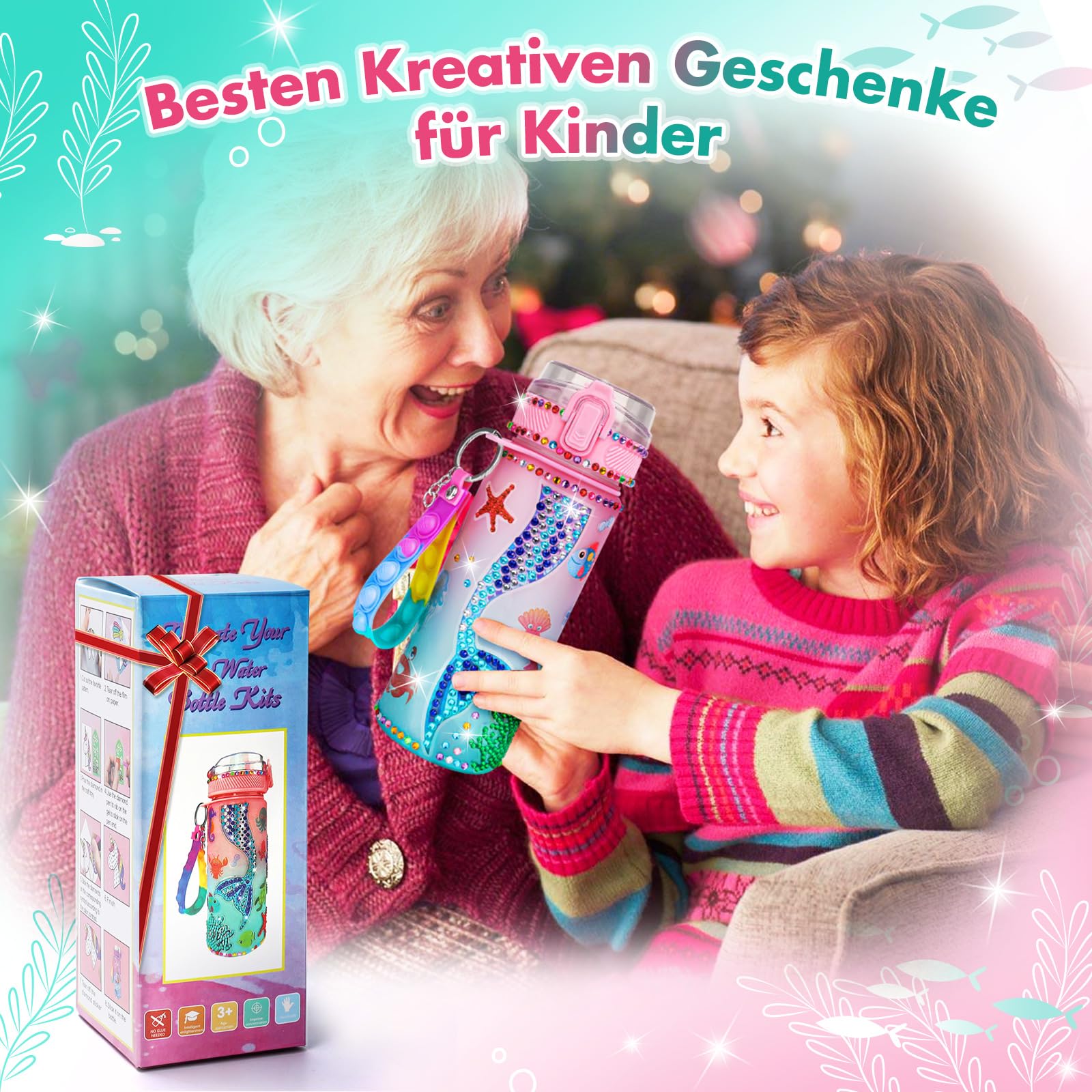- 💓[Super Lustiges & Praktisches Bastel Set]💓 - Trinkflasche mädchen ist perfekt für den Einsatz zu Hause Schule Büro Reisen Camping und mehr. Ob drinnen oder draußen, Kinder tragen immer Wasserflaschen bei sich, mit denen sie sich in Trinkwasser verlieben! DIY-Bastelsets eignen sich als Belohnung oder Geschenk für Mädchen 4-12 Jahren, die Einhörner und Meerjungfrauen mögen. Diamantkunst und Aufkleber können auch zum Dekorieren von Notizbüchern, Rucksäcken, Federmäppchen, Koffern und anderem.