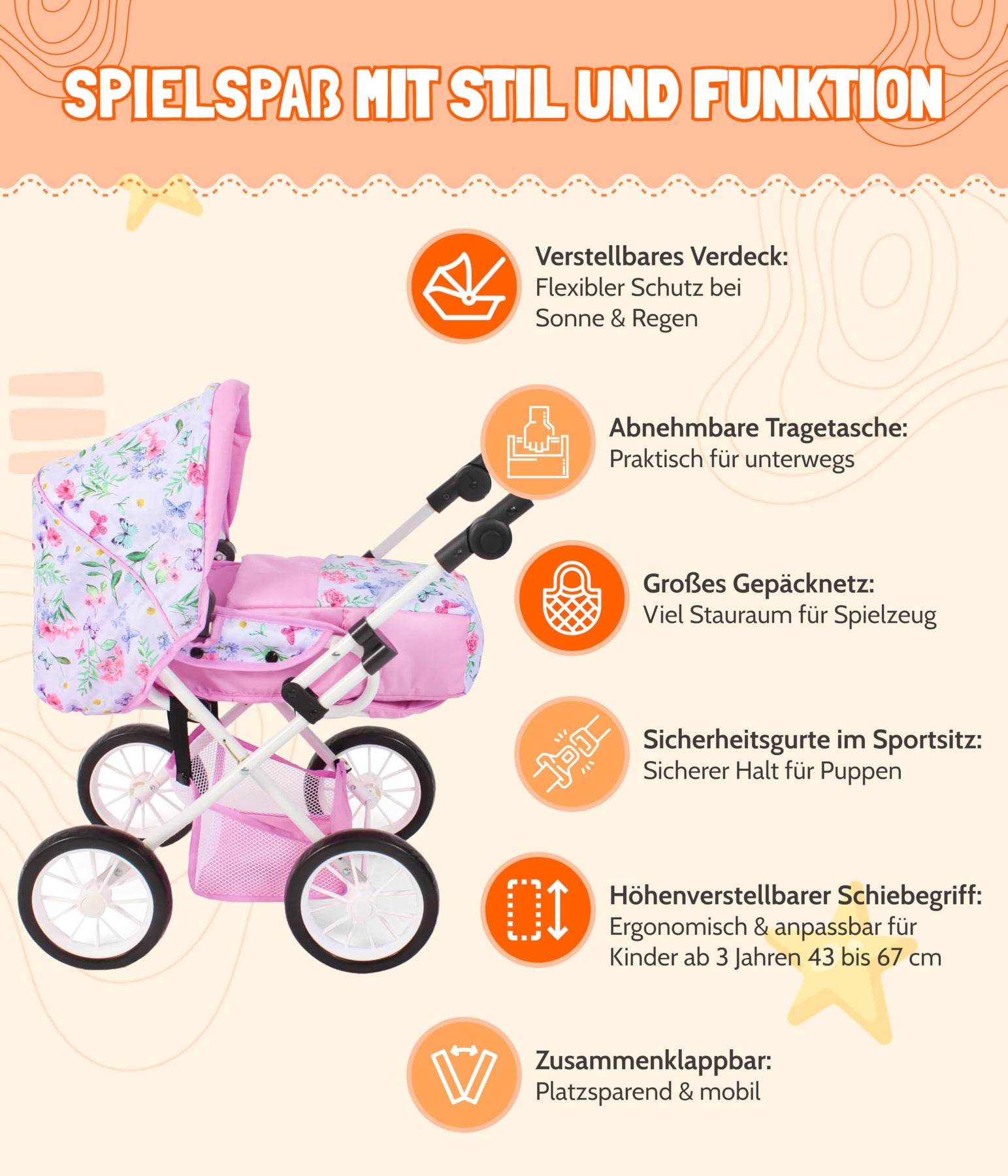 • 💼 PRAKTISCHES ZUBEHÖR: Herausnehmbare Tragetasche und praktisches Gepäcknetz für einfaches Mitführen von Puppenzubehör.