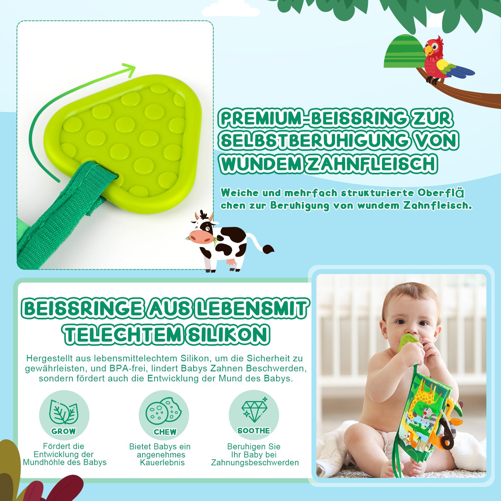 - 【Sicherer BPA-freier Beißring für Babys】Dieses Babybuch verfügt über einen sicheren und BPA-freien Beißring. Die weiche, flexible, strukturierte Oberfläche des Beißrings lindert Zahnfleischschmerzen und fördert die Mundentwicklung bei Babys. Dieser Beißring bietet Spaß und interaktive Interaktion für Ihr Baby. Es hilft Ihrem Baby beim Zahnen, indem es Ängste reduziert, eine positive orale Entwicklung fördert und das empfindliche, wunde Zahnfleisch Ihres Babys beim Spielen massiert.