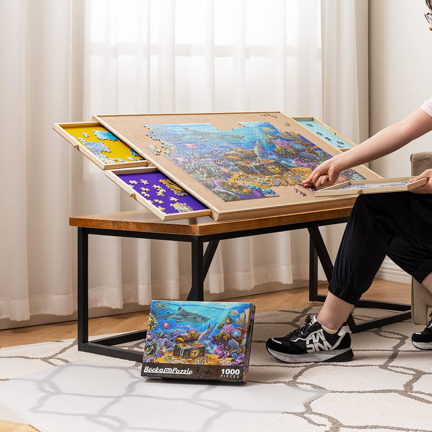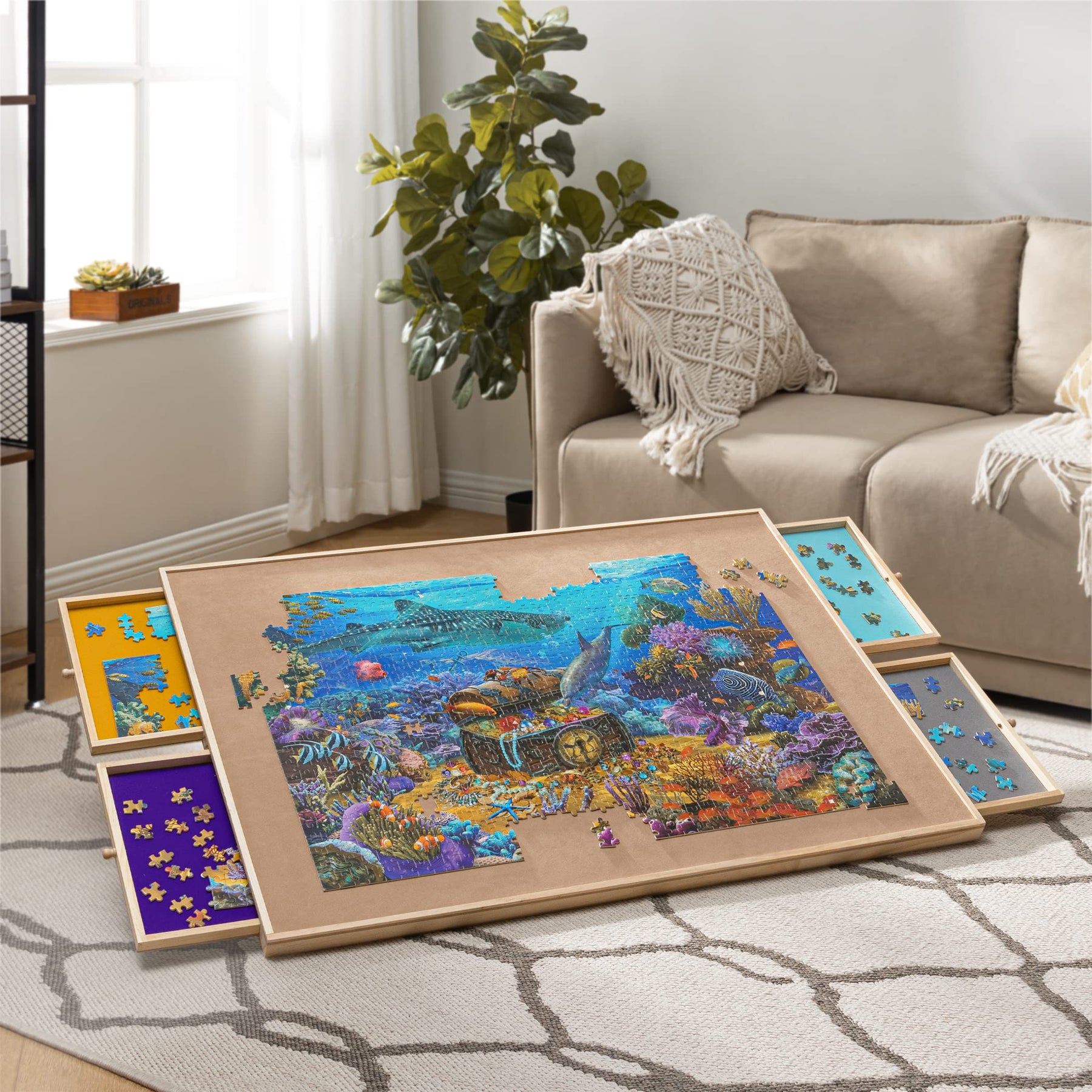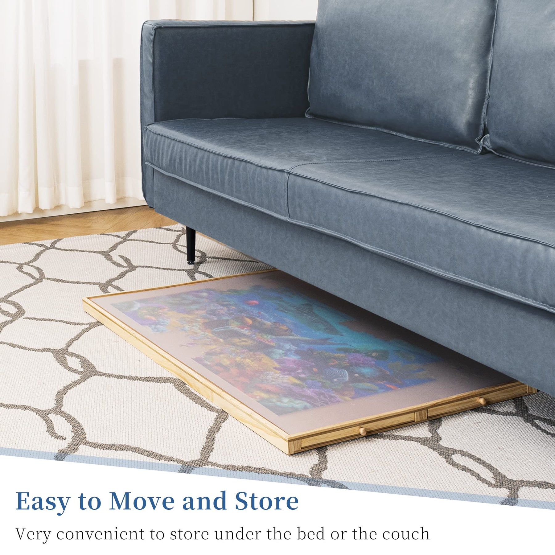 - Easy To Transport & Storage - You may have your puzzle fun anywhere you like as it is lightweight enough to be effortlessly moved around. Whenever you need extra space or want to have dinner, just cover the tabletop with the PP cover, close the drawers, and put the puzzle table under the couch or bed. Safe and space-saving storage can be achieved in seconds.