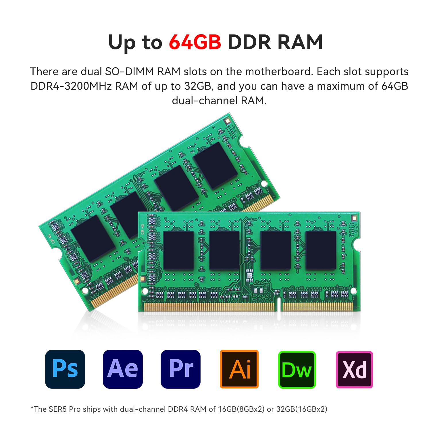 - 🔥【Large Storage & Scalability】 Beelink SER5 Mini PC kommt mit Dual Channel 32GB DDR4, unterstützt bis zu 64GB(2*32G). 1TB M.2 2280 PCIe3.0 SSD mit einer Lesegeschwindigkeit von 3000MB/S, unterstützt SSD-Upgrade auf 2TB (ausgeschlossen).