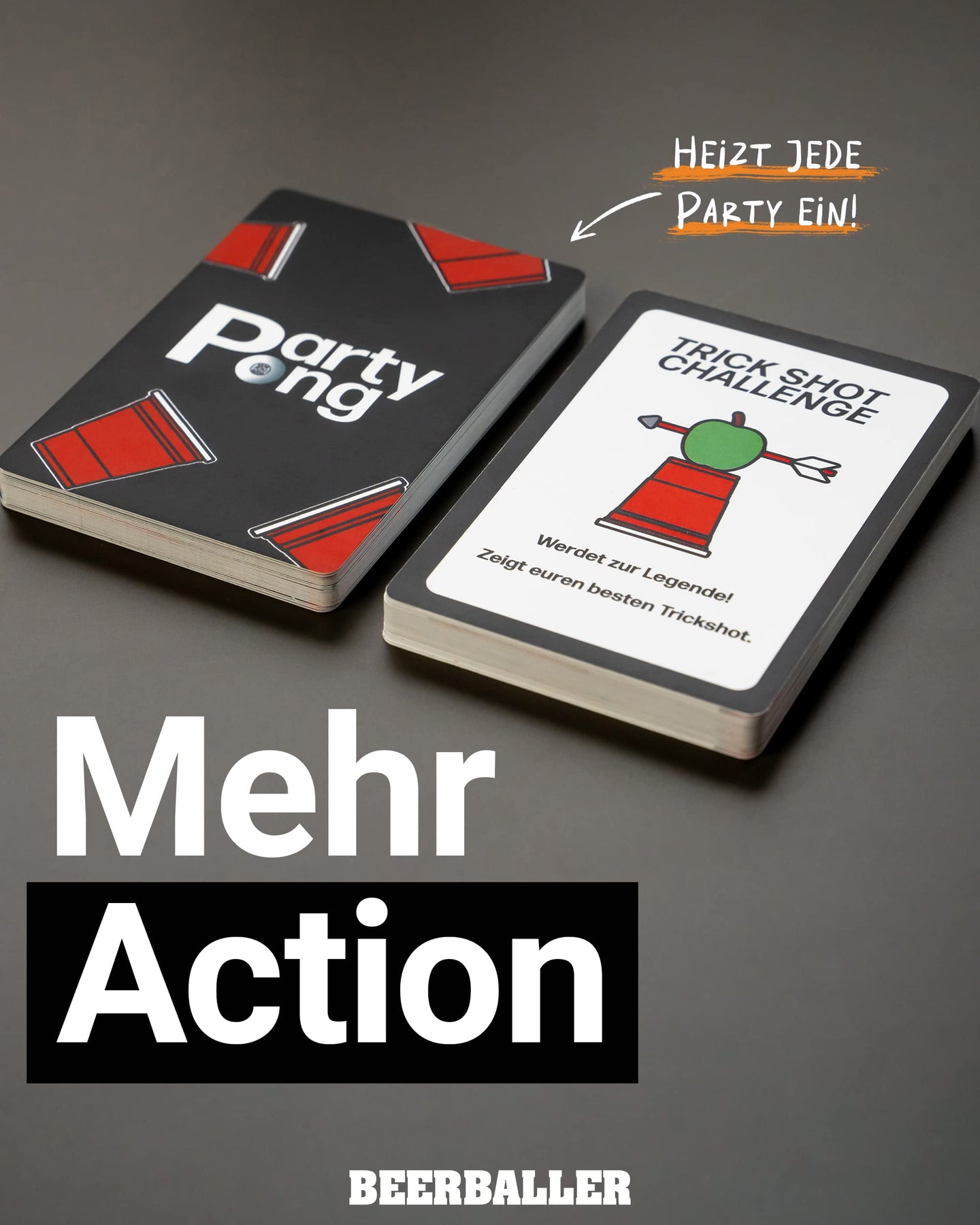 - ✔️ 56 KARTEN - 28 ABWECHSLUNGSREICHE AUFGABEN - Ob eine spontane Runde Flip Cup, Kleidungstausch, Trickshot Challenges oder der berühmte Celebrity Shot aus dem Publikum - mit Party Pong wird das wohl beste Partyspiel der Welt noch legendärer!
