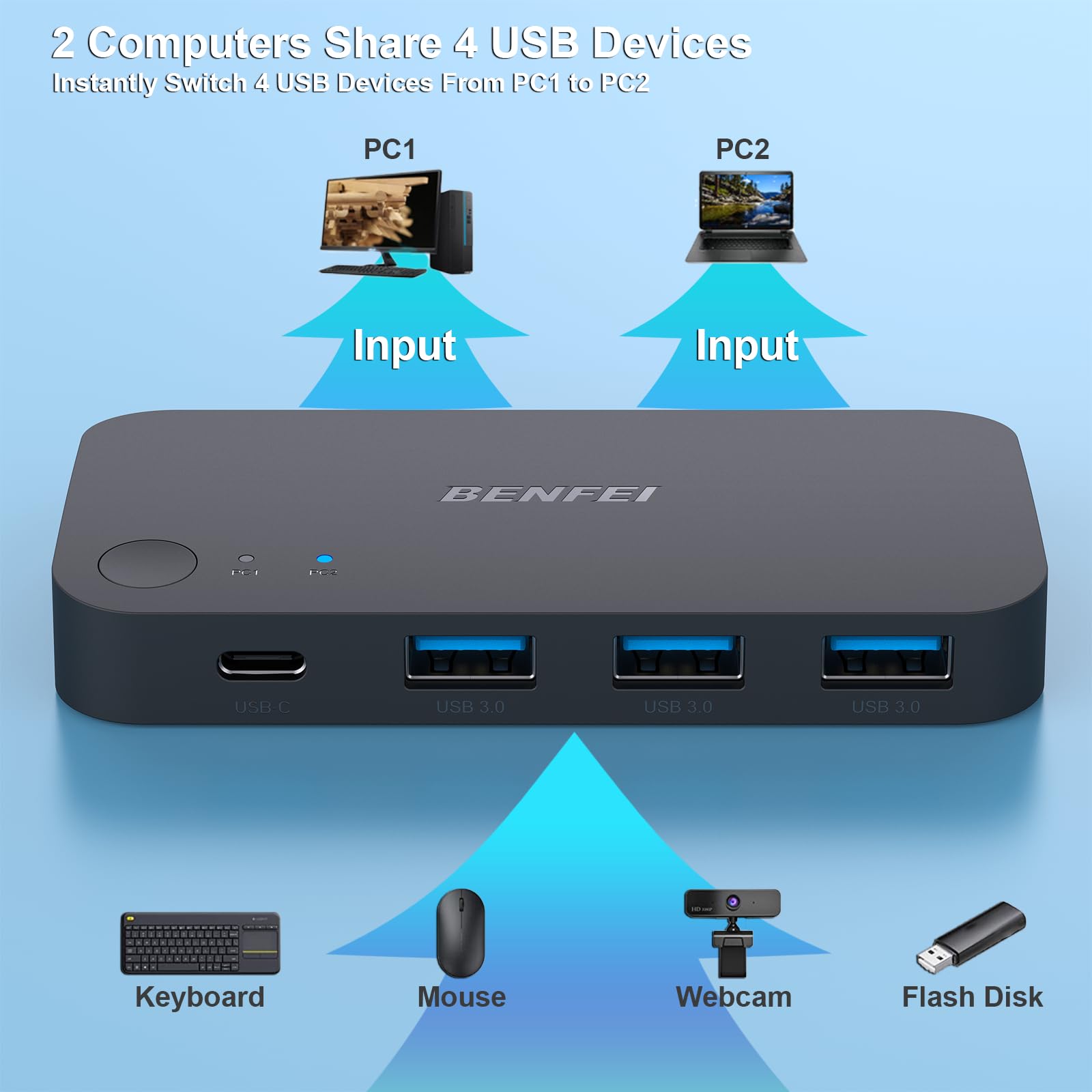 BENFEI USB 3.0 Switch, USB Switcher 2 Computer mit 1xUSB C Port und 3xUSB A Ports, 2 In 4 Out USB 3.0 Switcher mit Desktop-Kontroller, USB KVM Switch Selector kompatibel mit Windows Mac Linux