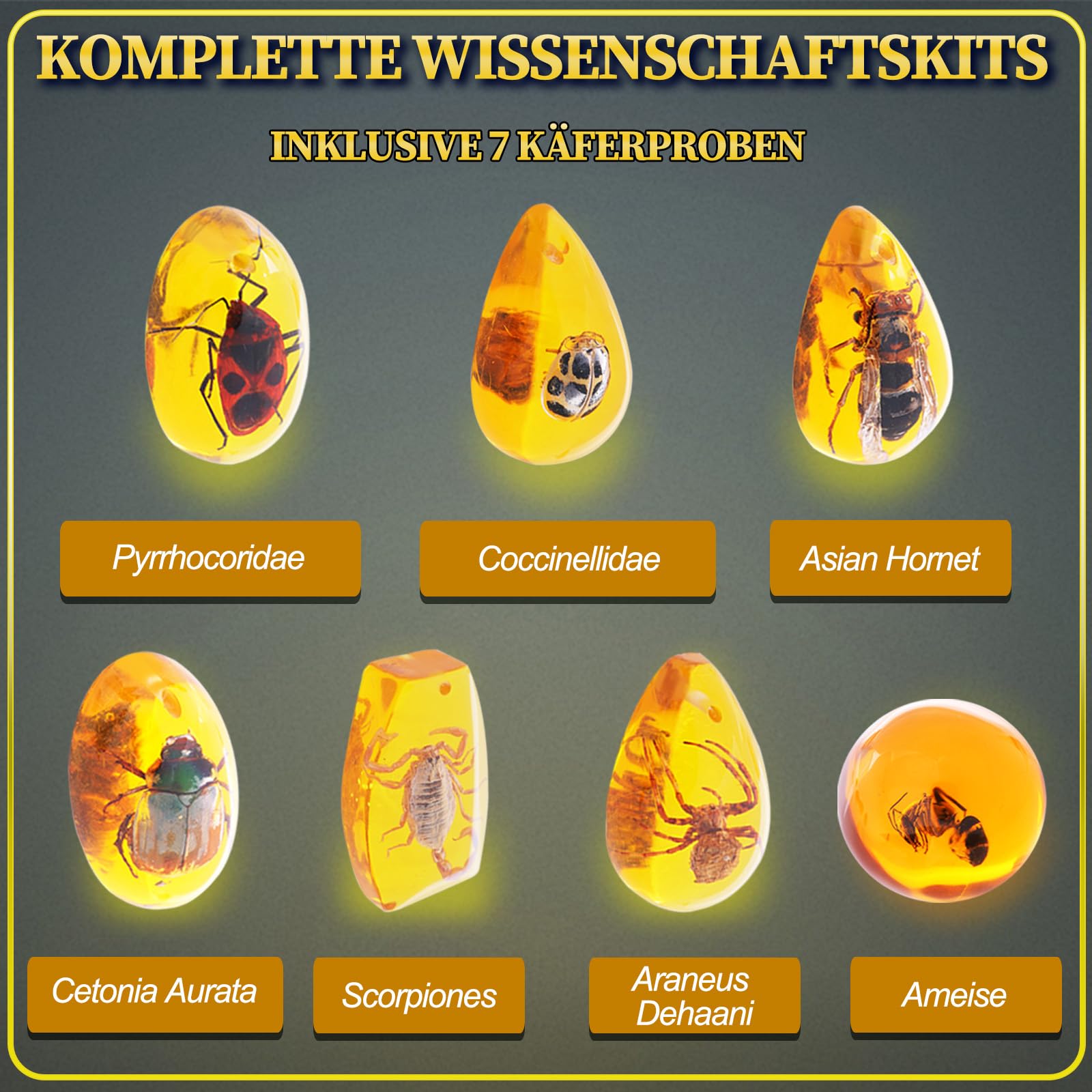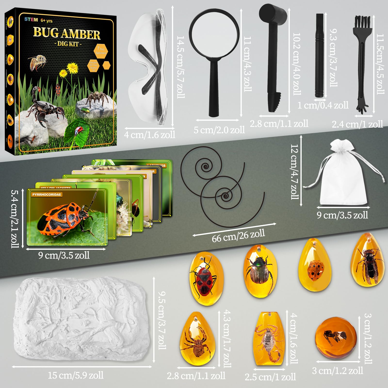 - 【Fähigkeit Erweitern】Exemplare sind in transparentem, bernsteinfarbenem Harz konserviert, sodass Kinder die Muster und Merkmale von Insekten mithilfe einer Lupe genauer beobachten können, und kann die Konzentration, Geduld und Hand-Auge-Koordination von Kindern während des Grabvorgangs fördern.