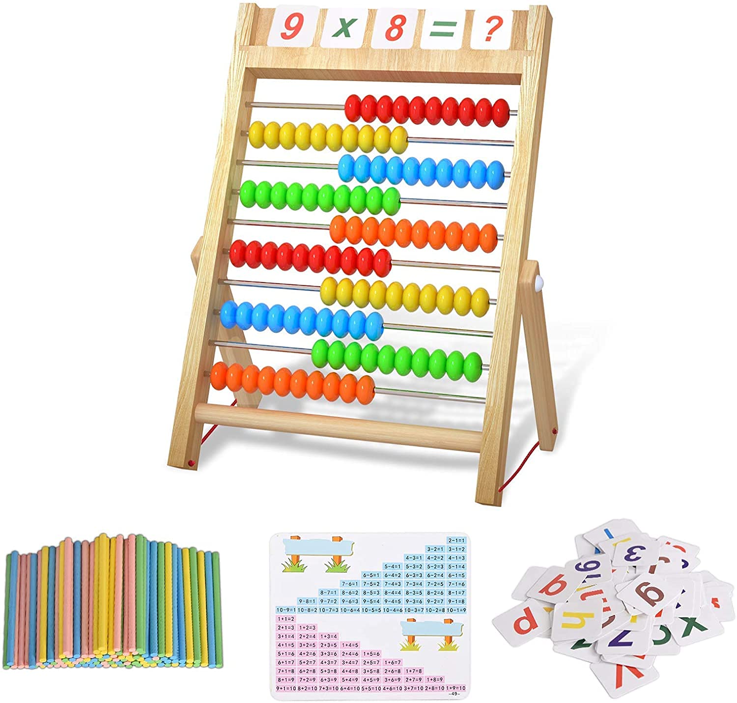 • Was Sie bekommen: (1) 1 * Holzrahmen-Abakus; (2) 52 * Alphabet Card (einschließlich Groß- und Kleinbuchstaben); (3) 21 * Zahlenkarte (0-20); (4) 7 * Symbol; (5) 100 * Zählstab; (6) 1 * Addition / Subtraktion / Multiplikation / Divisionstabelle.