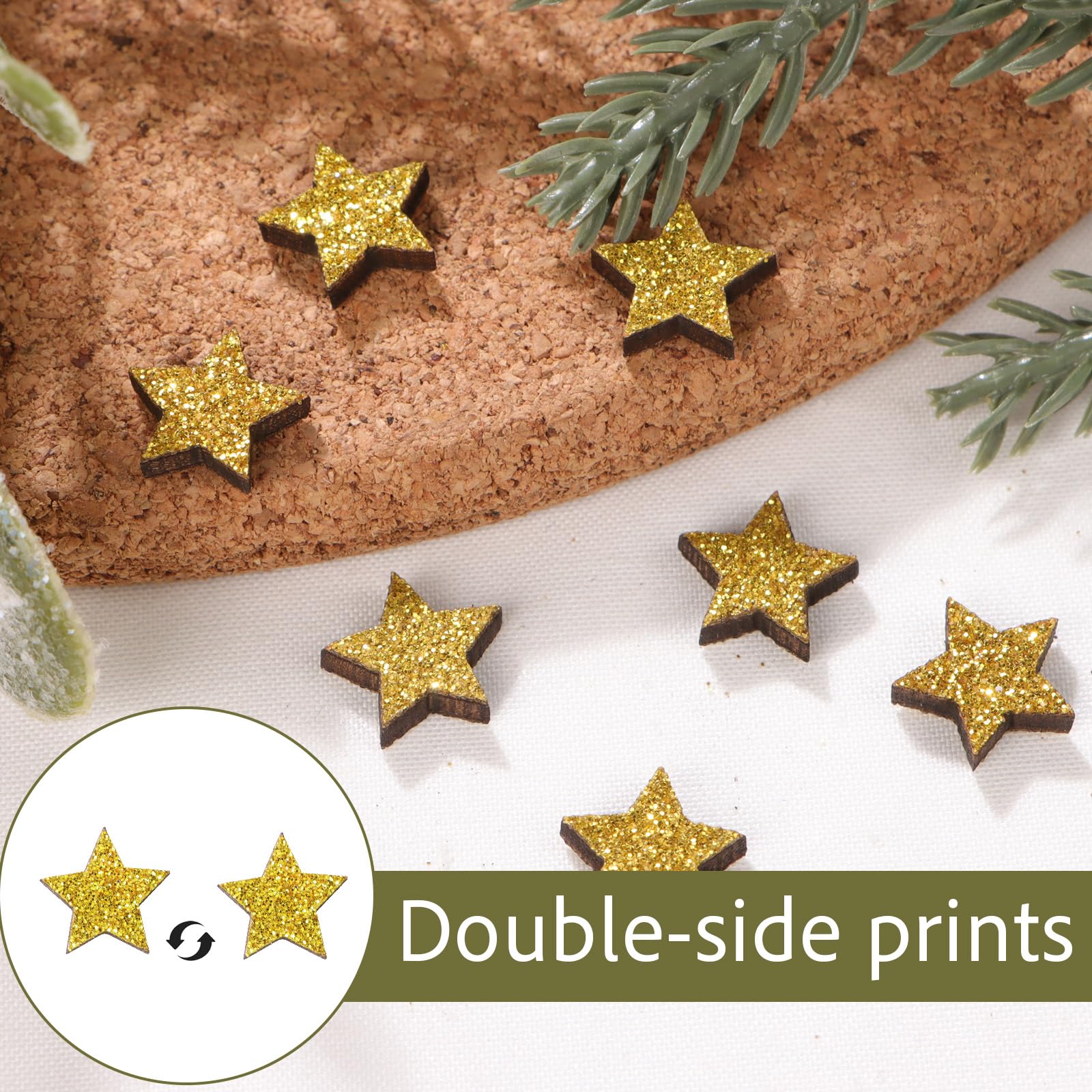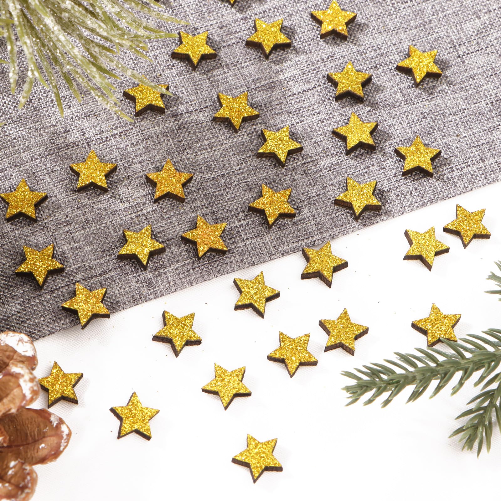 Unsere 150 Holzsterne in Gold mit Glitzer sind die perfekte Streudeko für Weihnachten und Winter. Mit ihrem funkelnden Glanz verwandeln sie jeden Tisch, jedes Regal und jede Bastelidee in eine festliche Augenweide.