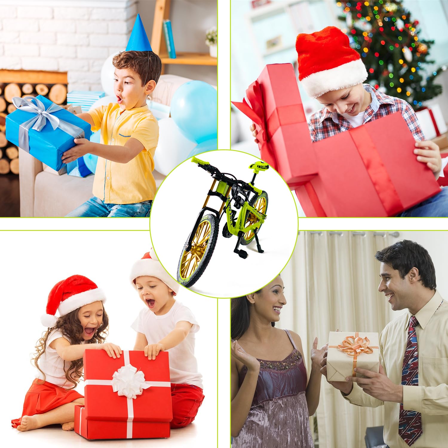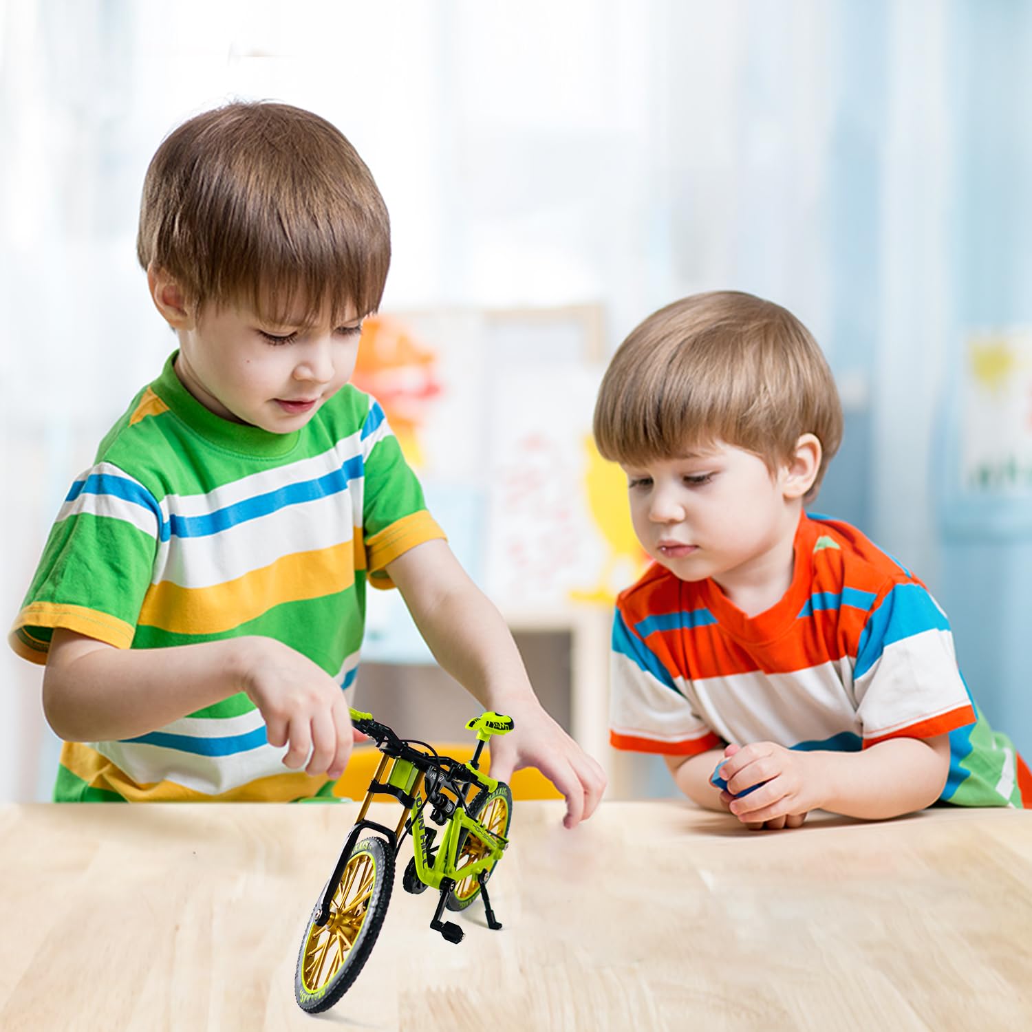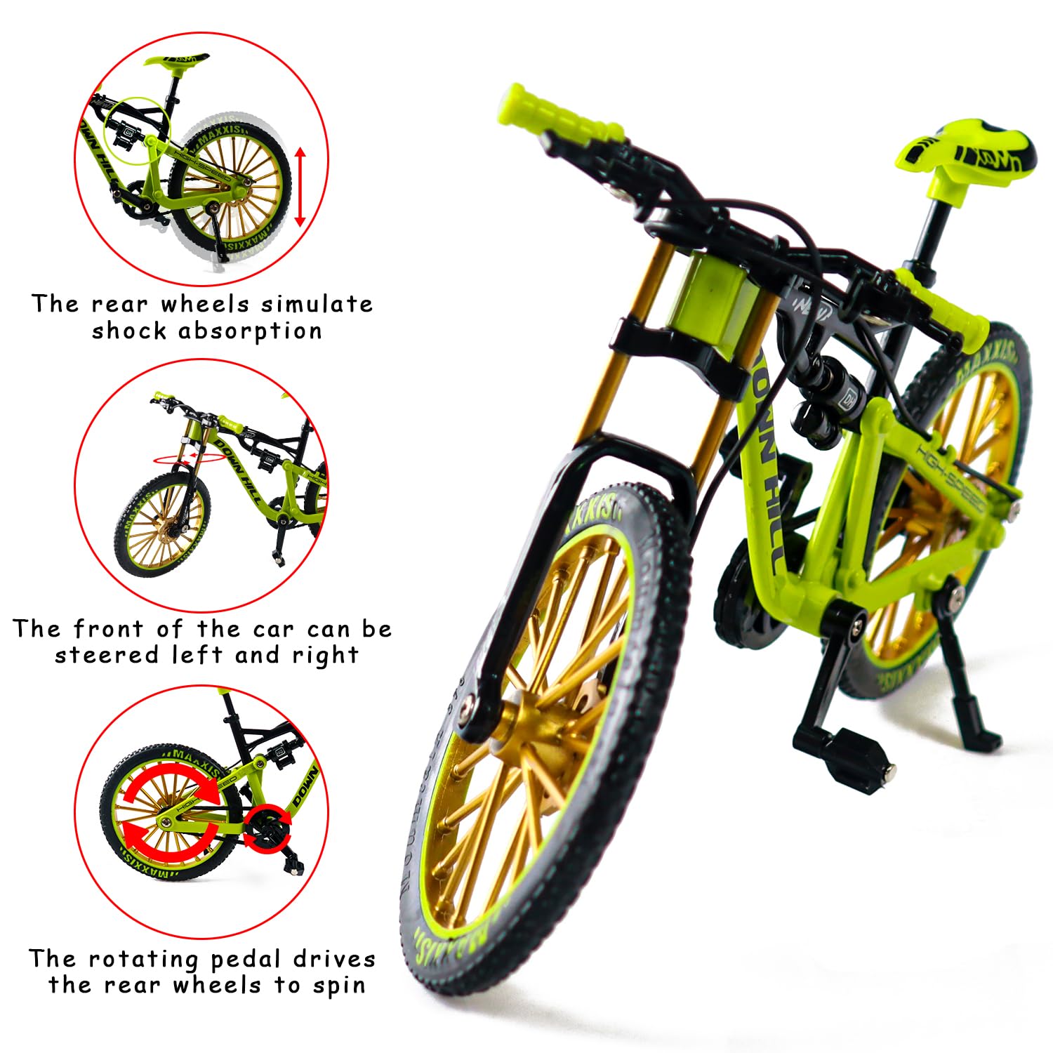 • Der vordere Kopf des finger fahrrad mountainbike ornamente kann nach links und rechts gedreht werden und die Pedale können gedreht werden, um das Fahren zu simulieren. Die simulierte Form ermöglicht es den Kindern auch, die Struktur des Fahrrads zu verstehen, so dass die Kinder spielerisch lernen können.