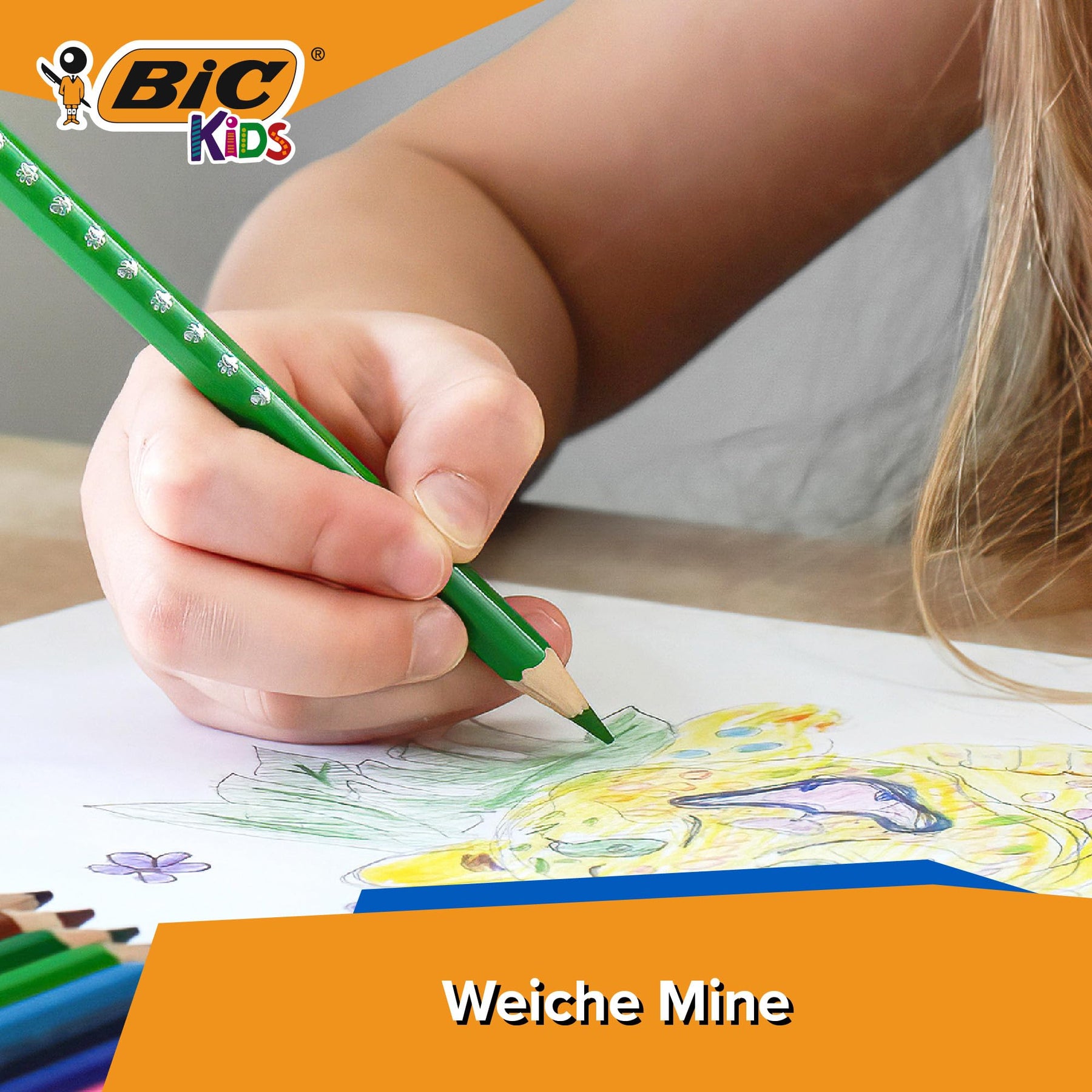 Einzelheiten: Eine Box mit 36 BIC Kids Buntstiften in leuchtenden Farben, die höchste Benutzerfreundlichkeit versprechen. Sie bestehen aus zu 100 % verantwortungsvoll angebautem Holz. Kinder lieben die Tatsache, dass sie sich einfach anspitzen lassen, und Eltern wissen, dass dadurch stundenlanger Malspaß garantiert ist. Diese Buntstifte sind ideal für Kinder ab 5 Jahren. Sie haben eine sechseckige Form, die einen festen Halt gewährleistet und verhindert, dass sie vom Tisch rollen. BIC hat die BIC Kids Produktlinie speziell für Kinder entwickelt, um ihnen Werkzeuge in die Hand zu geben, die Spaß machen und ihre Entwicklung fördern.