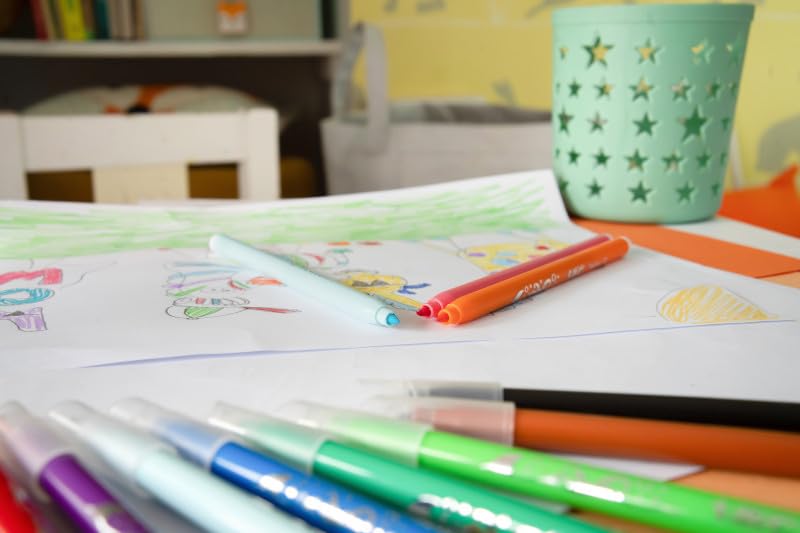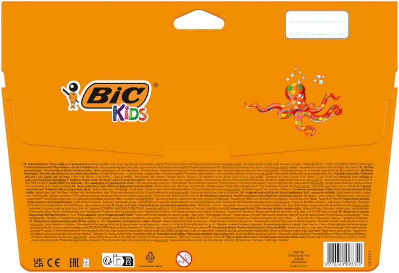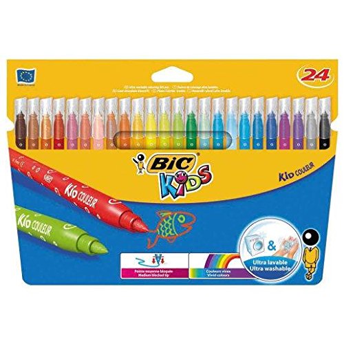 Einzelheiten: Die Produktlinie BIC Kids bietet Malutensilien, die speziell für die einfache und sichere Handhabung durch Kinder entwickelt wurden. Die BIC Kids Kid Couleur Buntstifte in der 24er Packung sind für Kinder ab 5 Jahren zum täglichen Malen geeignet. Die Packung enthält 24 leuchtende Farben für kräftige, kontrastreiche Zeichnungen. Sie haben eine stabile Spitze in der Mitte, die auch unter Druck nicht nachgibt, und können sowohl für feine Konturen als auch für großflächiges Ausmalen verwendet werden. Seien Sie nicht böse, wenn die Kinder sich selbst bemalen: Die farbigen Faserstifte sind leicht von der Haut und den meisten Textilien zu entfernen. Die zuverlässigen und langlebigen BIC Kids Kid Couleur Filzstifte werden in den BIC-Werken auf der Grundlage langjähriger Erfahrung hergestellt. Sie können den BIC Kids Kid Couleur Filzstiften danken.