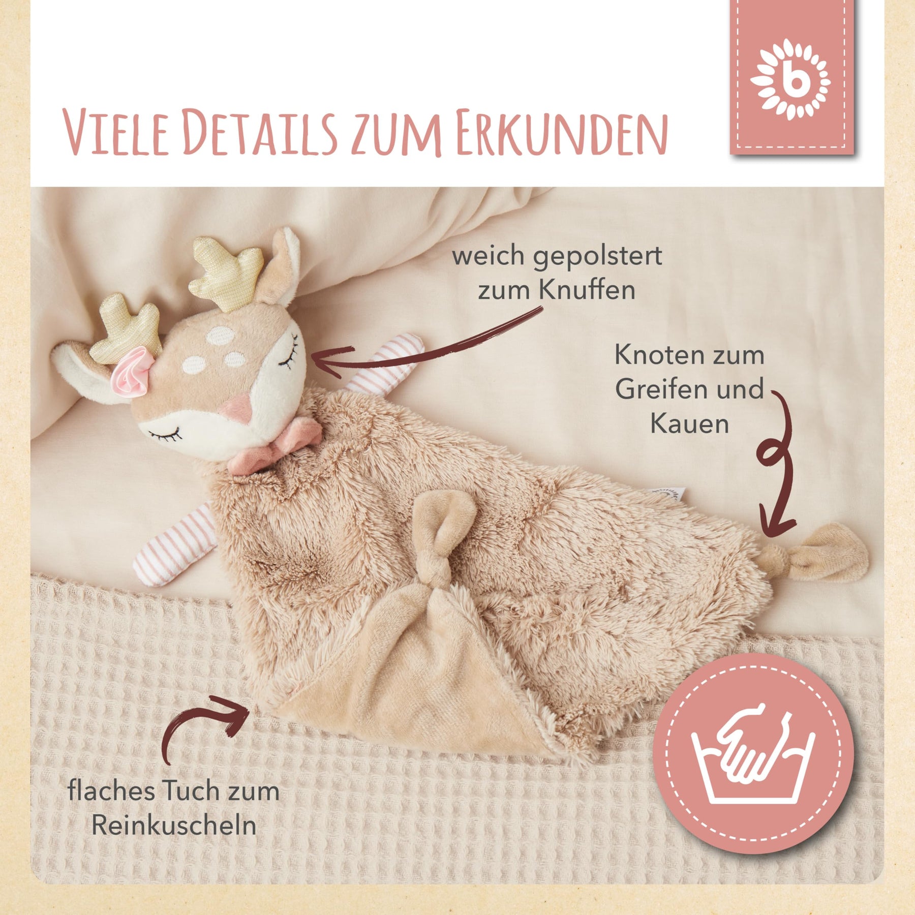 - LIEFERUMFANG: 1x Schmusetuch Reh. Größe: ca. 36x28x3 cm; Gewicht ca. 70 g. Material: 100 % Polyester; Füllung: 100 % Polyester. Babyspielzeug ab 0 Monate