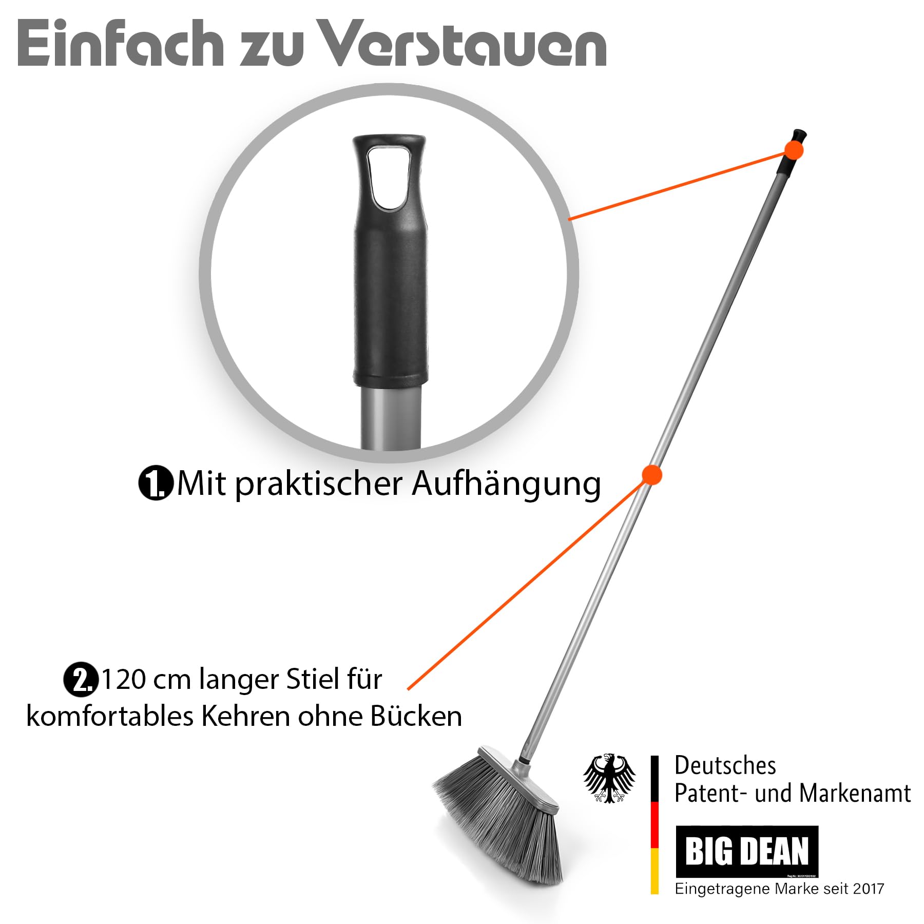 • PLATZSPARENDES DESIGN: Dank seines schlanken Designs kann dieser Besen problemlos in jedem Haushalt verstaut werden, ohne viel Platz einzunehmen. Dank seiner Aufhänge Vorrichtung kann der Outdoor-Besen bequem aufgehängt werden.