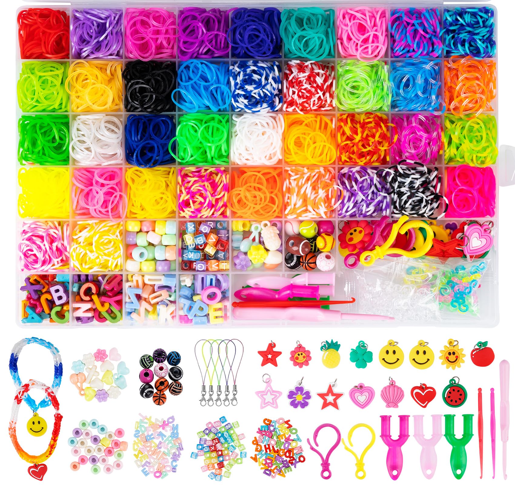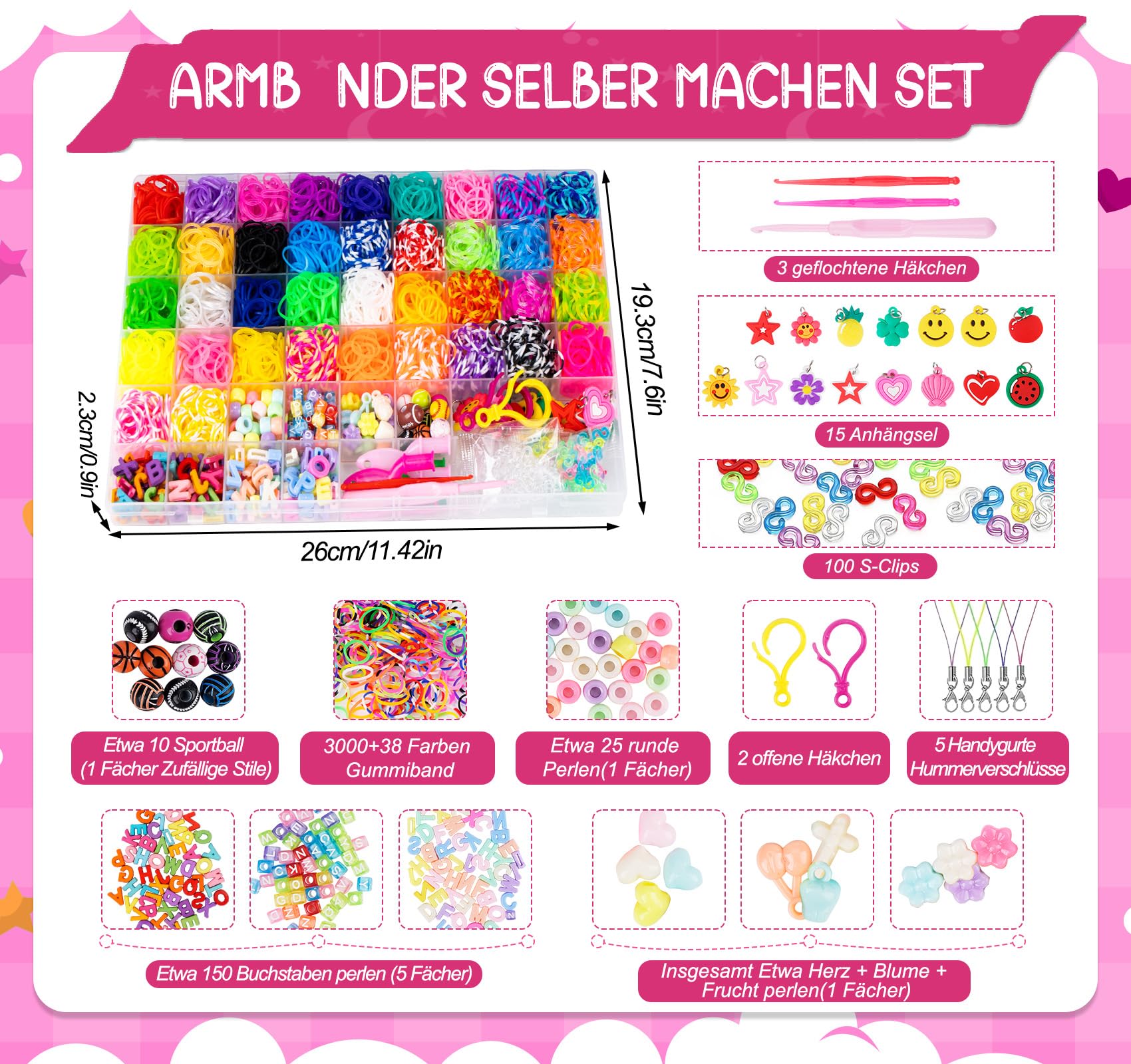 - Bracelet Making Kit: 3000+ gummis einschließlich 38 Farbe loom bänder, 15 Charms, Sportball Perlen(Zufälliger Stil), 150 Buchstaben Perlen, 25 rundePerlen, 25 Blumen, Früchte und herzförmige Perlen insgesamt, 5 Hummerklammern, 3 Häkelnadeln, 3 Y-Loom, 2 Haken, 100 S-Clips (klar und farbig) und 1 Schwarzer Organzabeutel