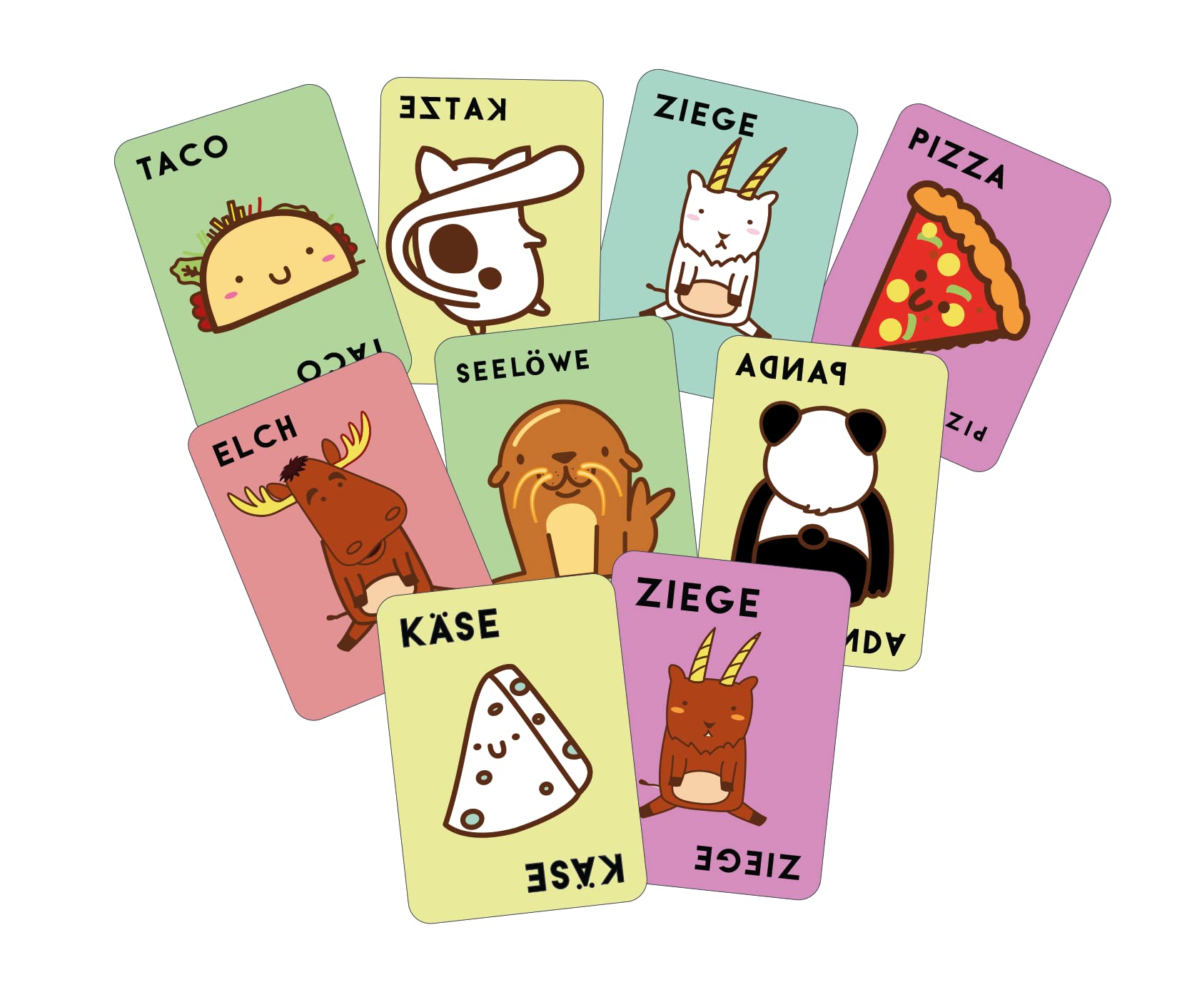 - In diesem kompetitiven Partyspiel musst du dir nur die 5 Begriffe und deren Reihenfolge Taco Katze Ziege Käse Pizza merken. Diese Begriffe sagst du auf, während du deine Karten in die Mitte ablegst