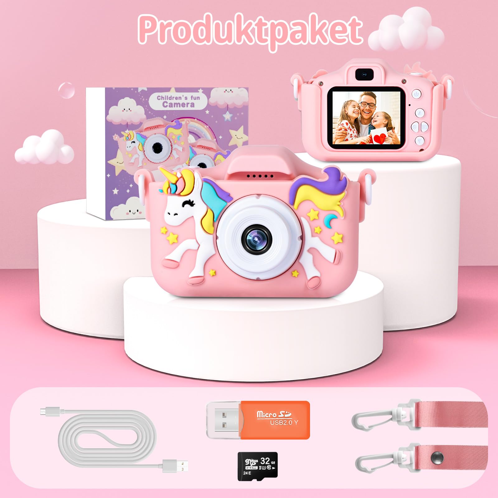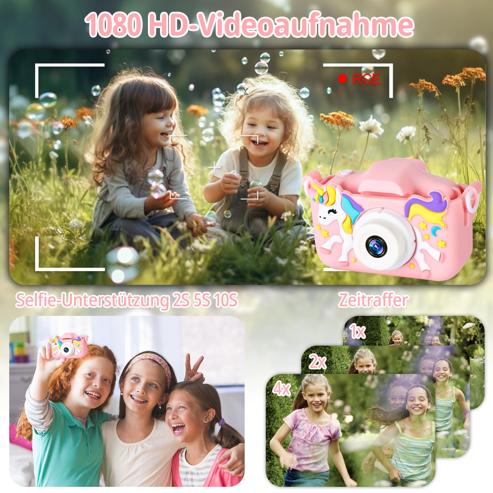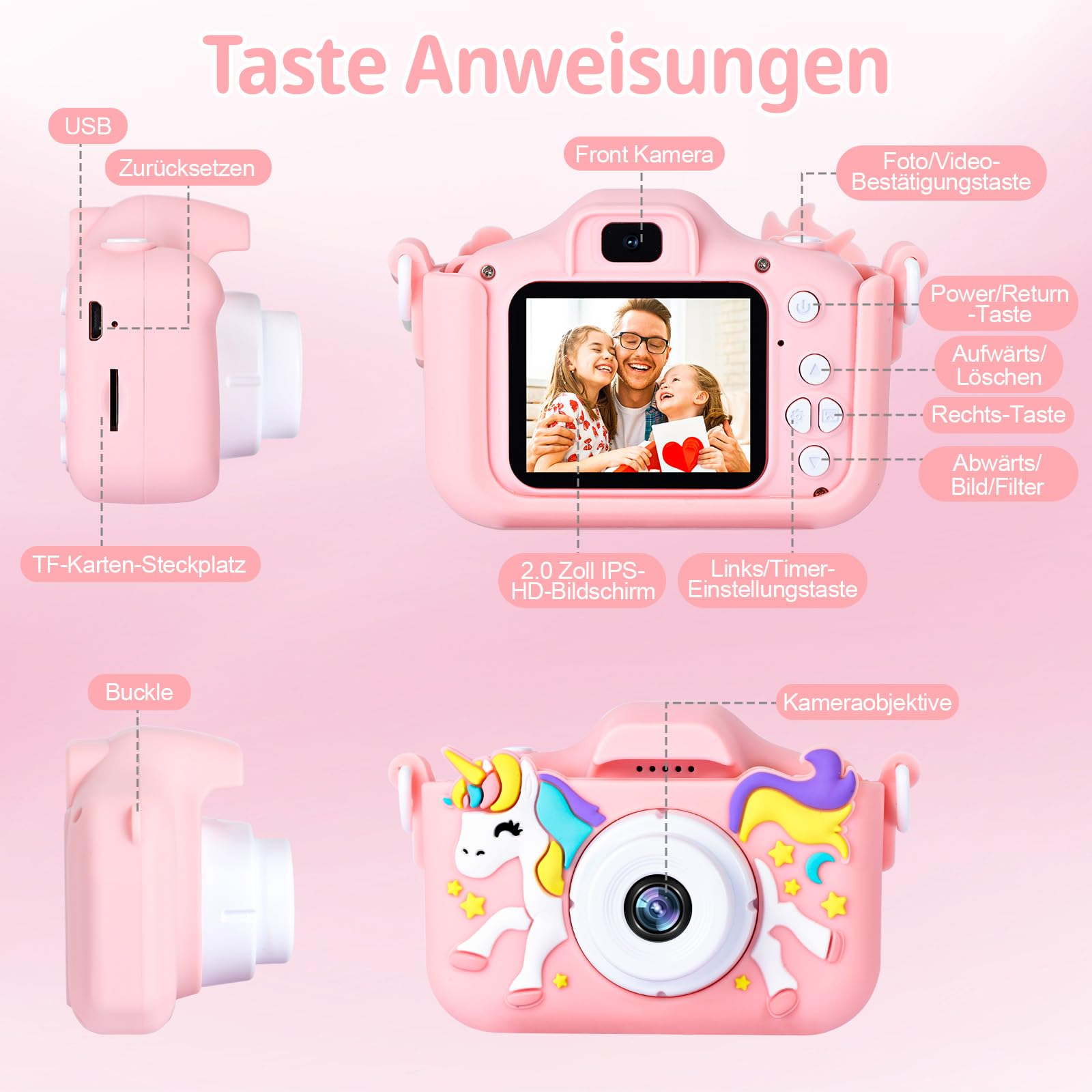 - 【Sicheres Einhorn-Design mit Schutzfunktion】Diese Einhorn fotoapparat kinder unterstützt die Aufnahme von Fotos mit einer maximalen Größe von 48 Megapixeln und HD-Videos mit 1080p, damit Kinder noch mehr wertvolle Momente festhalten können. Der 2,0-Zoll-IPS-Bildschirm sorgt für klare Darstellung und schützt die Augen. Mit verbesserten Kameras auf der Vorder- und Rückseite erfüllt es den Wunsch der Kinder, ganz einfach Selfies zu machen und ihre schönsten Momente festzuhalten.