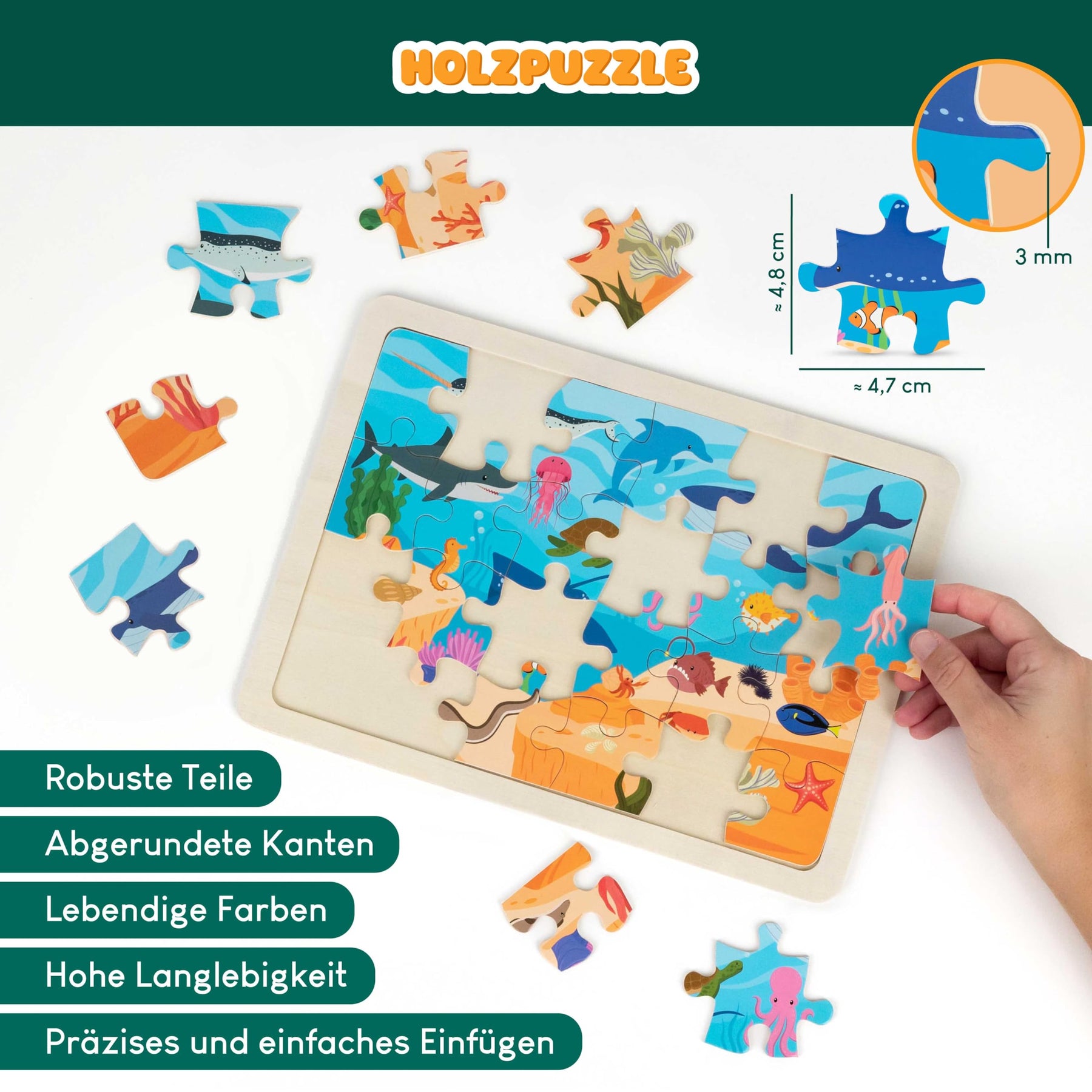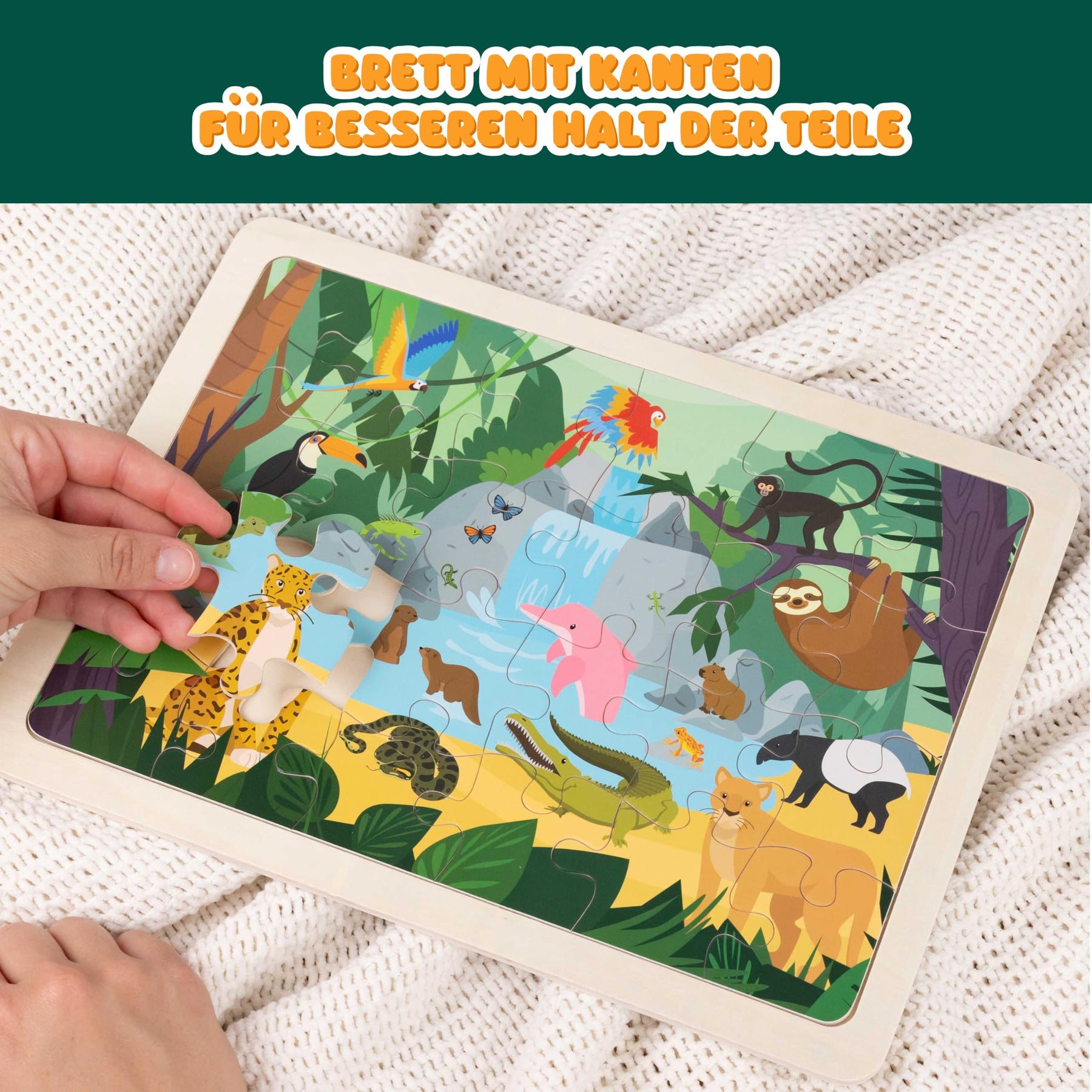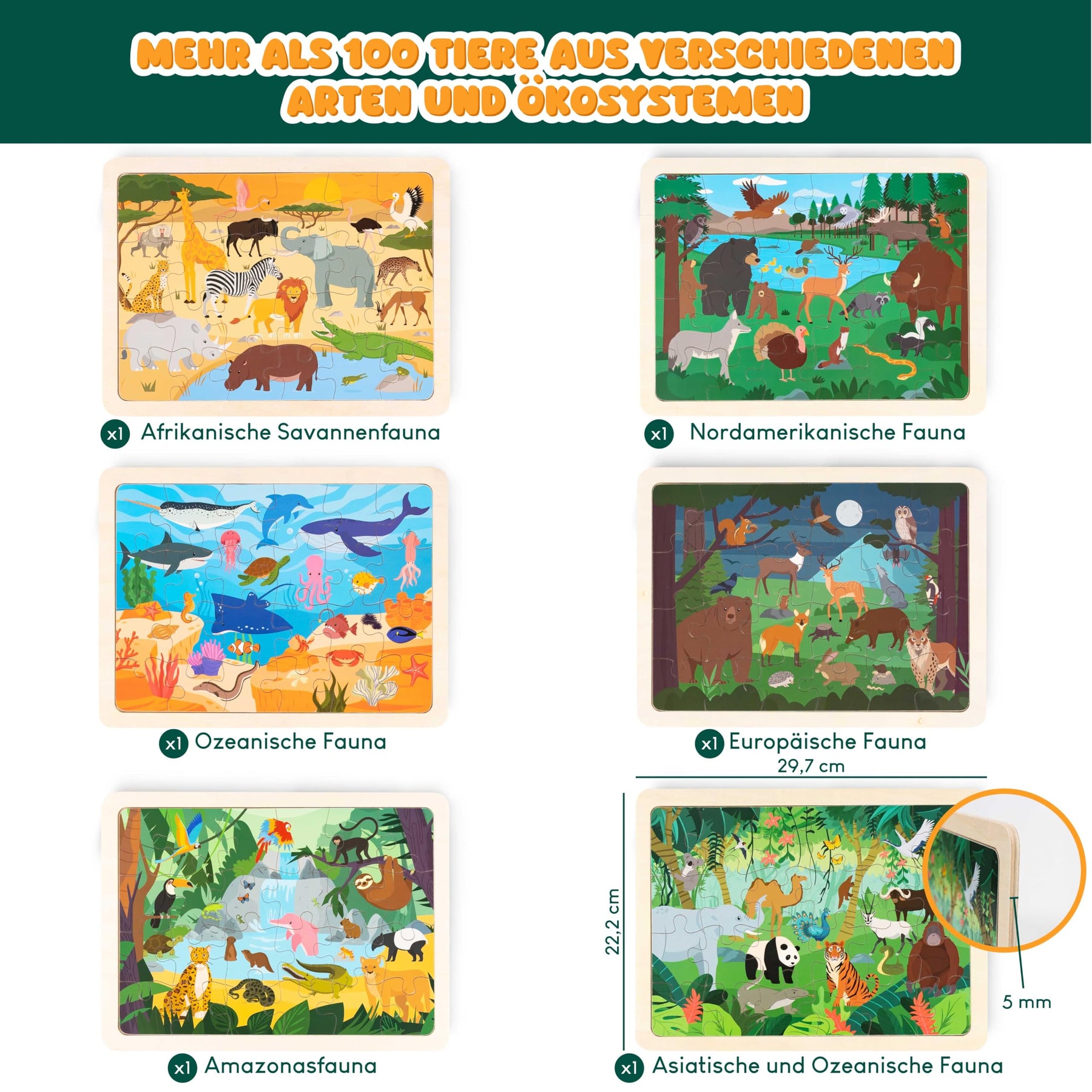 • 6 HOLZ PUZZLE FÜR KINDER - Enthält 6 kinderpuzzle mit verschiedenen Tieren, jeweils mit 24 Teilen: Fauna der afrikanischen Savanne, Nordamerikanische Fauna, Ozeanfauna, Europäische Fauna, Amazonas Fauna, Asiatiche und Ozeanische Fauna