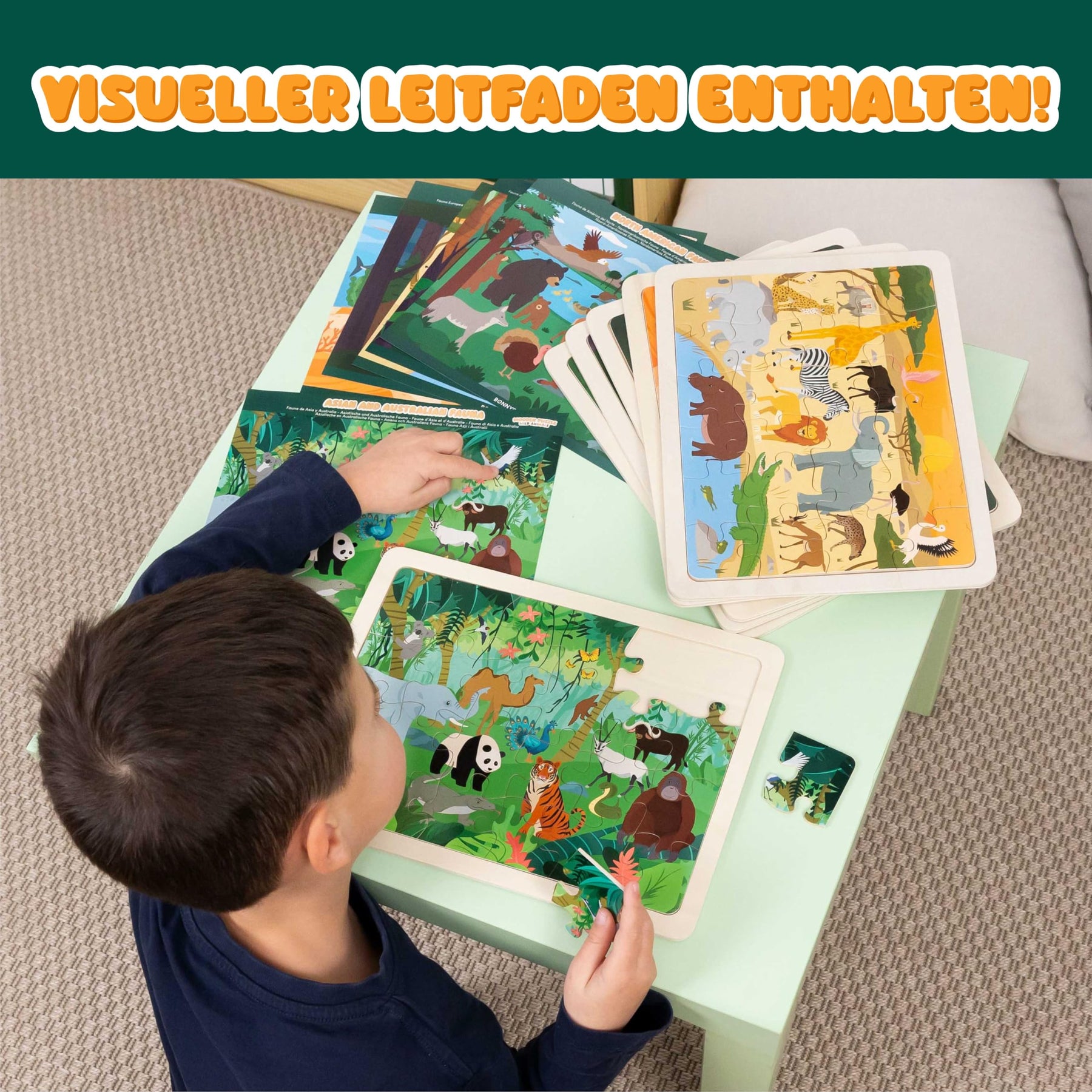 • PUZZLEBRETT MIT RAND - Jedes Tierpuzzle enthält ein Brett mit Umrandung, das Kindern hilft, die Teile korrekt zu platzieren und ein Verrutschen verhindert. Montessori Kinder Spielzeug, leicht zu verstauen