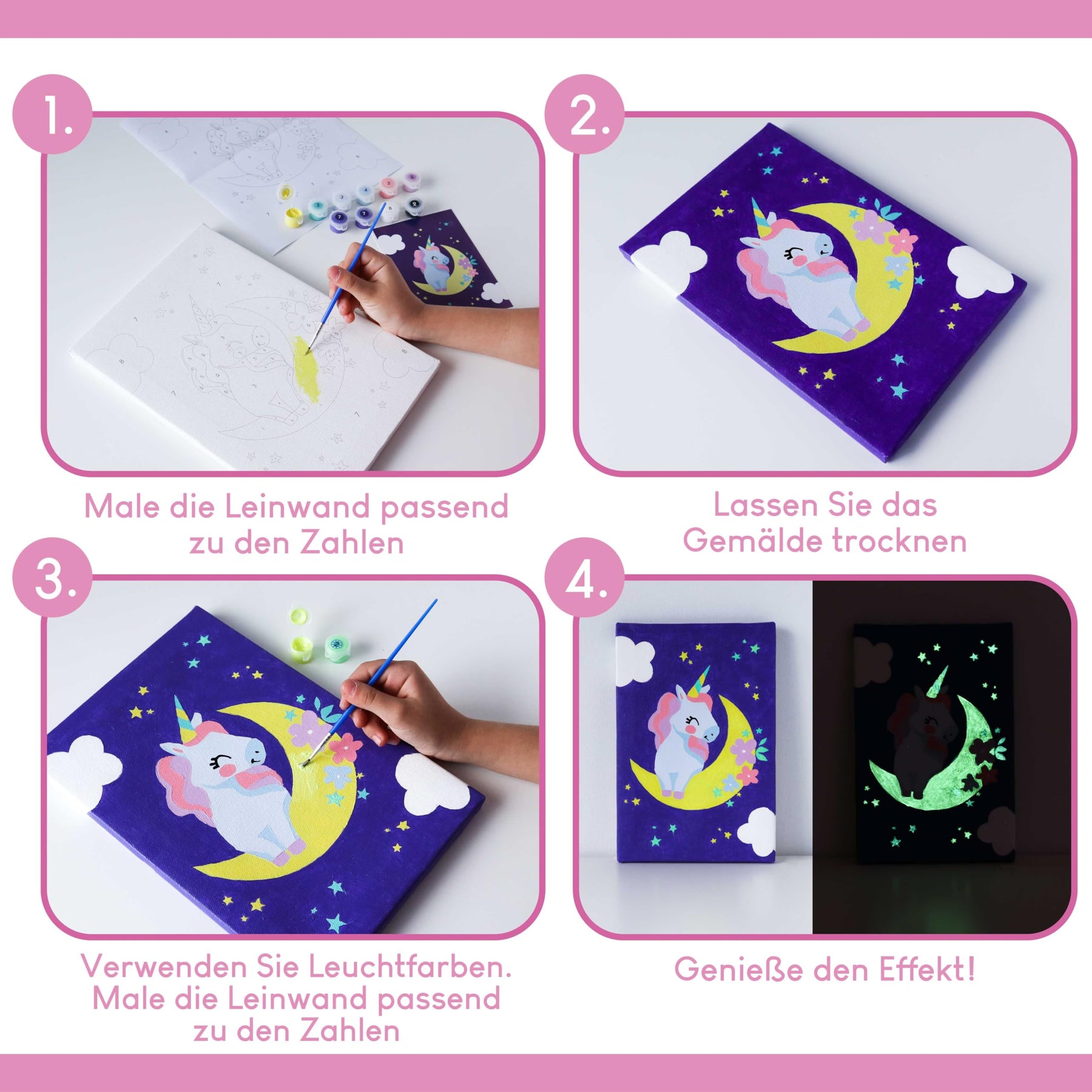 - MALEN NACH ZAHLEN EINHORN - Diese 3er-Packung Malen nach Zahlen Kinder Leinwände enthält für jedes Set folgendes: 1 Leinwand (29,5*19,5 cm) , 10 Farben, 2 nachleuchtende Farben, 3 Pinsel, 2 Klebehaken, 2 Aufhänger, 1 Übungsblatt und 1 Anleitungskarte mit dem endgültigen Bild der Leinwand. Außerdem enthält die Packung eine Gebrauchsanweisung für die richtige Verwendung des Produkt