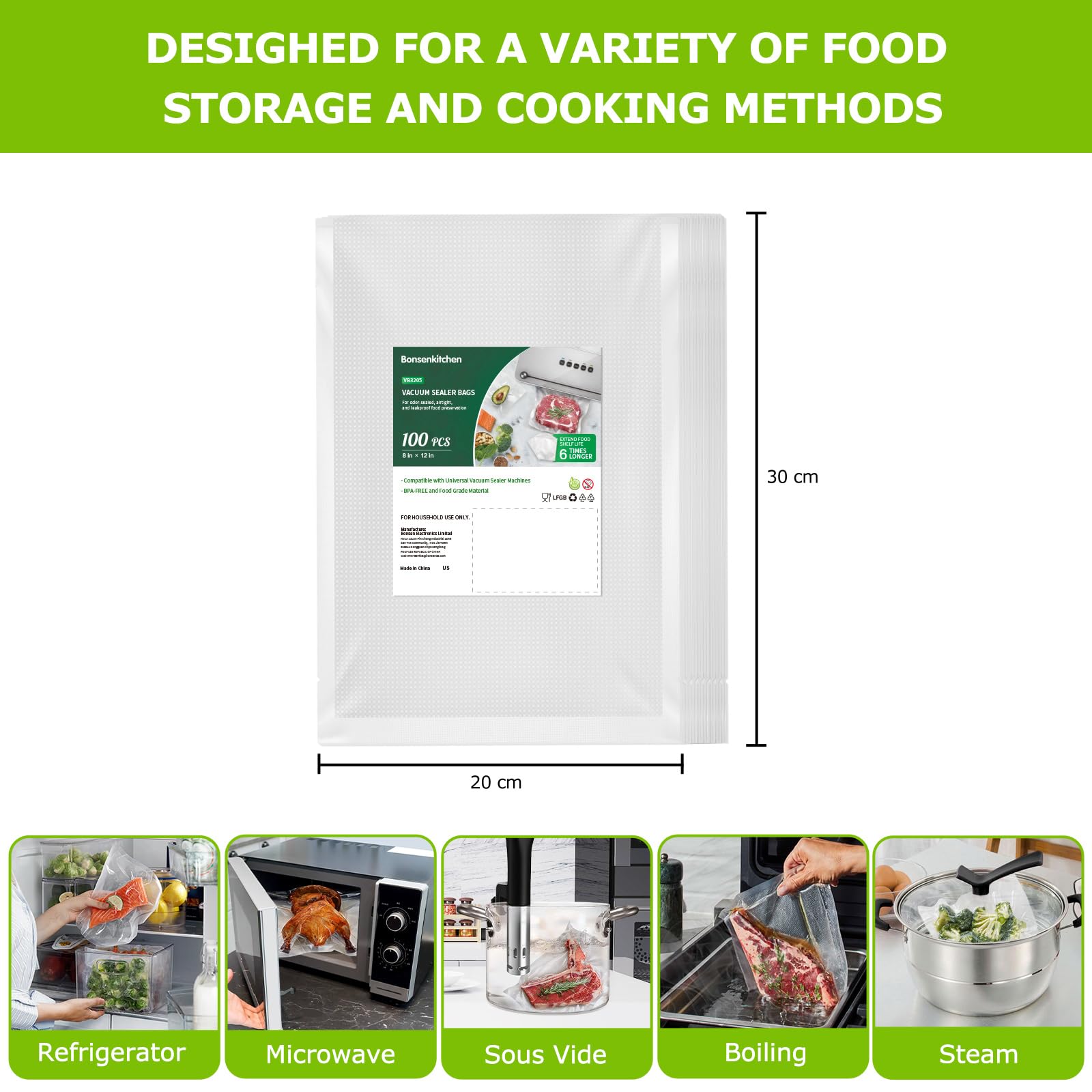 - UNIVERSAL SIZE Food Saver-Verpackungsbeutel: Der Bonsenkitchen 100 20x30cm Vakuumbeutel ist kompatibel mit allen vakuumierer mit einer Siegelbreite von mehr als 20 cm. Fast alle Lebensmittel folienschweißgerät haben Dichtungen von mehr als 20cm. Mit unseren professionellen Vakuumbeuteln können Sie Rindfleisch, Lachs, Garnelen, Hühnchen und anderes Fleisch sowie Snacks, Nüsse, Obst und Gemüse vakuumieren.
