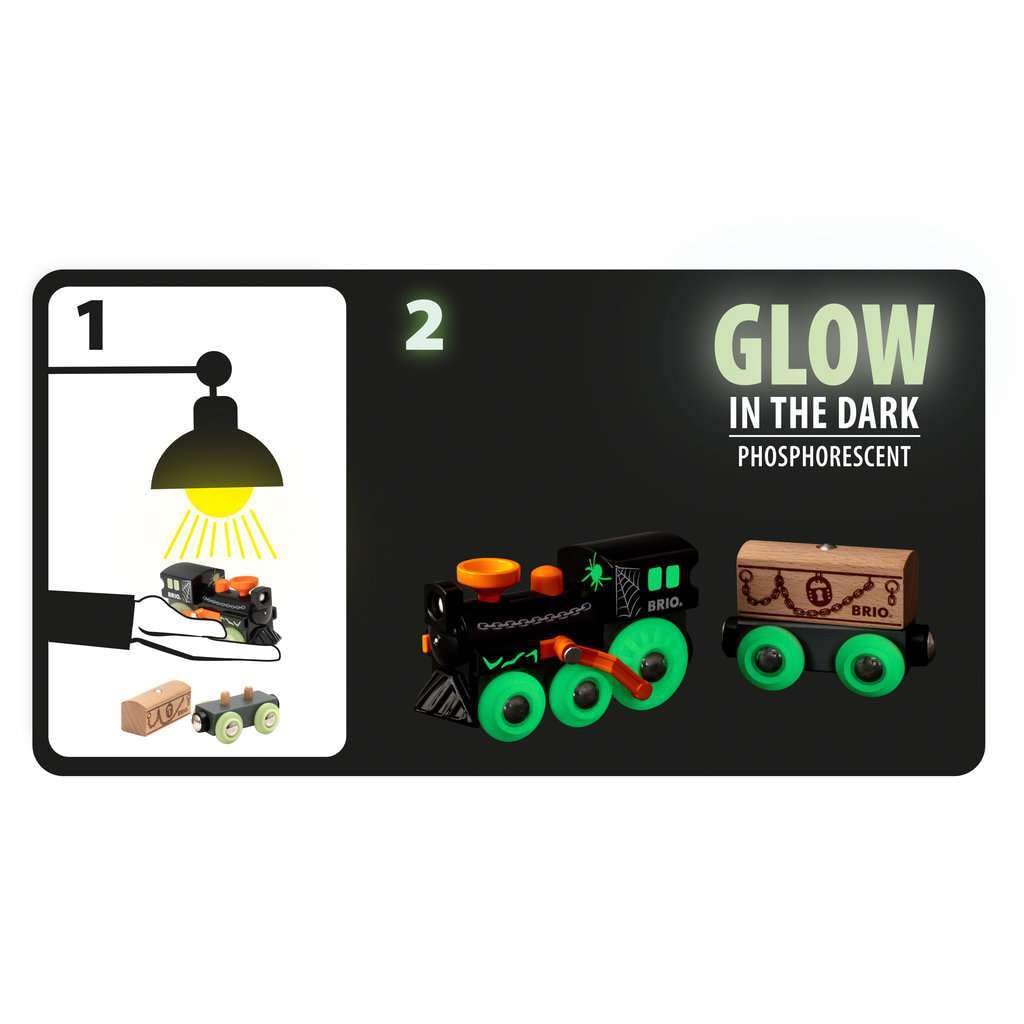 Huh-huh-huuuh! Etwas Unheimliches kriecht die Schienen entlang. Der Geisterzug leuchtet im Dunkeln und hat eine Holzkassette im Schlepptau – was da wohl drin ist? Mit den bekannten BRIO Magnetverbindungen kann diese gespenstische Dampflok mit allen anderen Loks und Waggons verbunden werden und die BRIO World erschrecken.