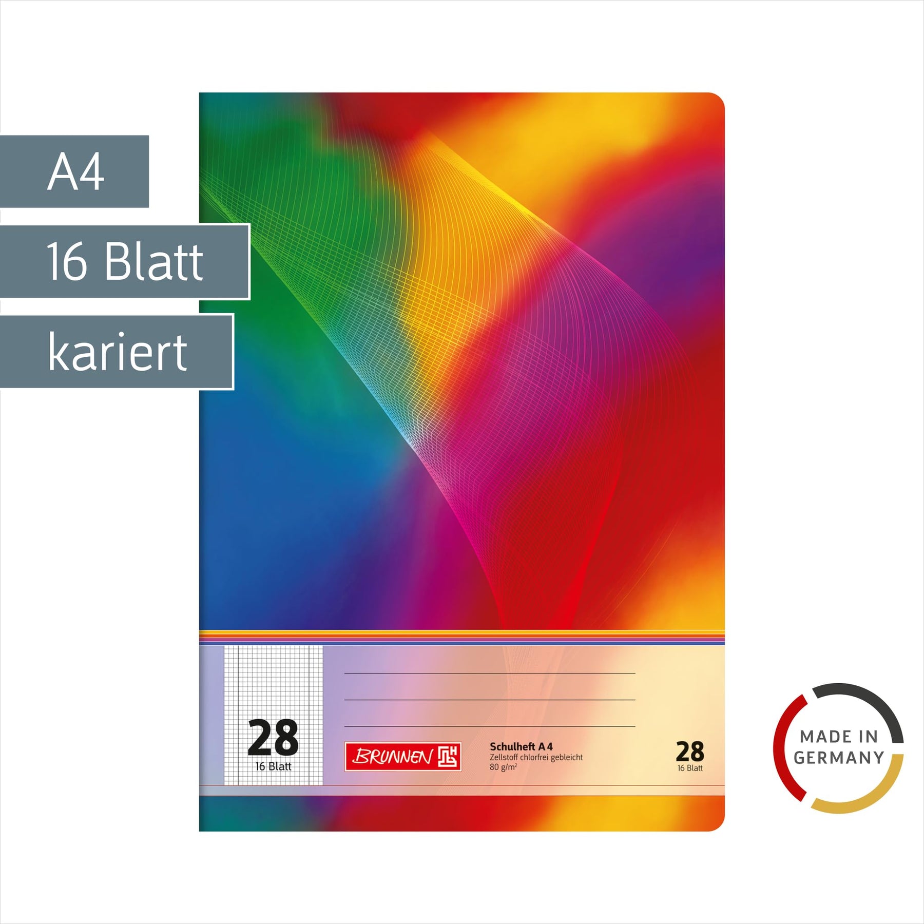 Einzelheiten: Schulheft A4 Inhalt: 16 Blatt 5 mm kariert, Lineatur durchlaufend, mit Randlinie innen und außen, Lin. 28 80 g/m²
