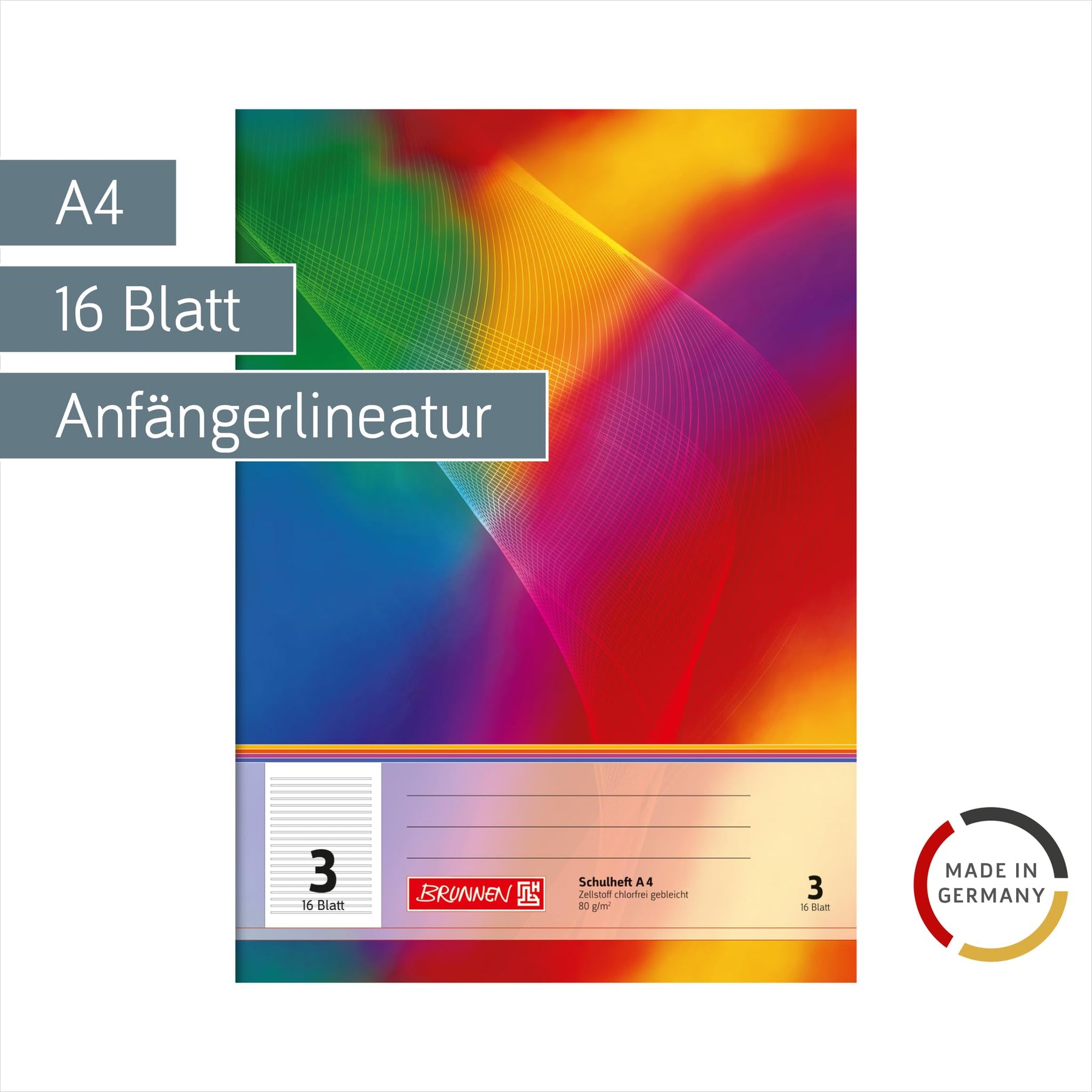 BRUNNEN Schulheft | A4, Lineatur 3, 16 Blatt, mehrfarbig