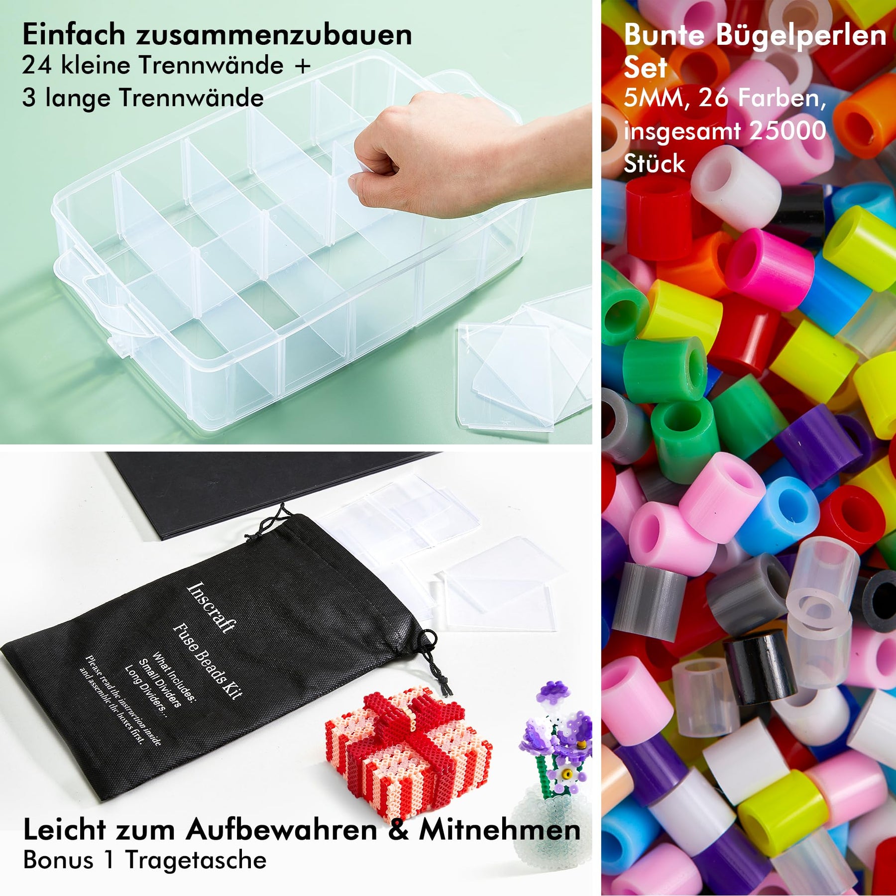 Bügelperlen, Inscraft 25000 teiliges Bügelperlen Set 26 Farben 5 MM, mit 4 großen Steckplatten, 1 Steckplatte in Herz Form, 1 Steckplatten in Blumen Form, Bügelpapier, Pinzette, bügelperlen weihnachte