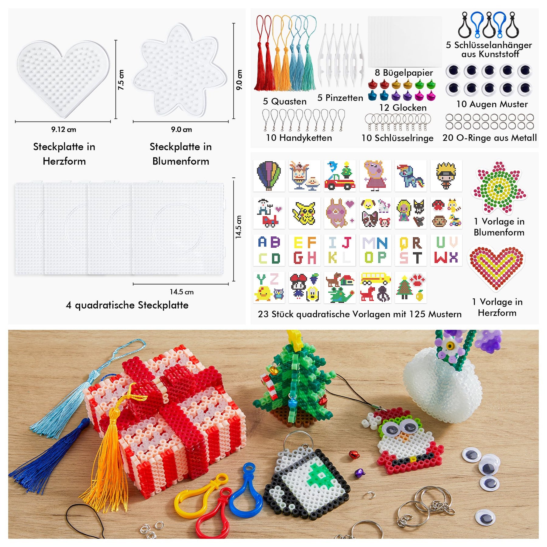 • Alle Werkzeuge und Zubehör, die Sie brauchen: Das Bügelperlen Set enthält 4 große Steckplatten, 1 Steckplatten in Herz Form, 1 Steckplatten in Blumen Form, 10 Bügelpapier, 127 komplette Vorlagen, 5 Pinzetten, 10 Augen Muster, 5 bunte Anhänger, 6 Jingle Bells, 5 Quasten, Schlüsselbänder and Schlüsselringe.