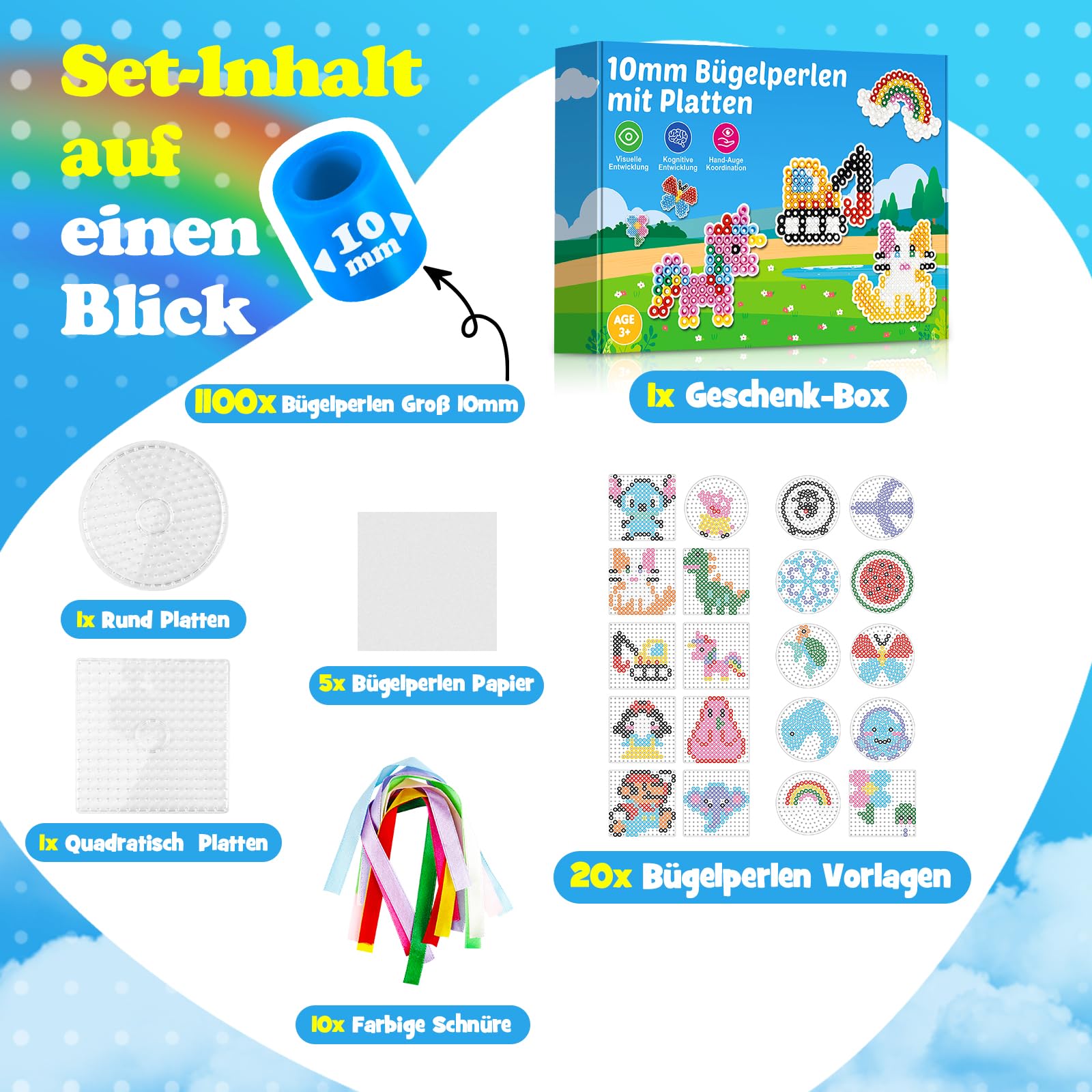 • Das Komplett-Set für Sofortigen Kreativspaß In einer Box: 1000 bunte Bügelperlen, 1 RUNDE und 1 VIERECKIGE Bügelplatte für verschiedene Formen, 20 coole Vorlagen, 5 Bügelpapiere und 10 bunte Schnüre. Alles sicher verpackt in einer schönen Geschenkbox.