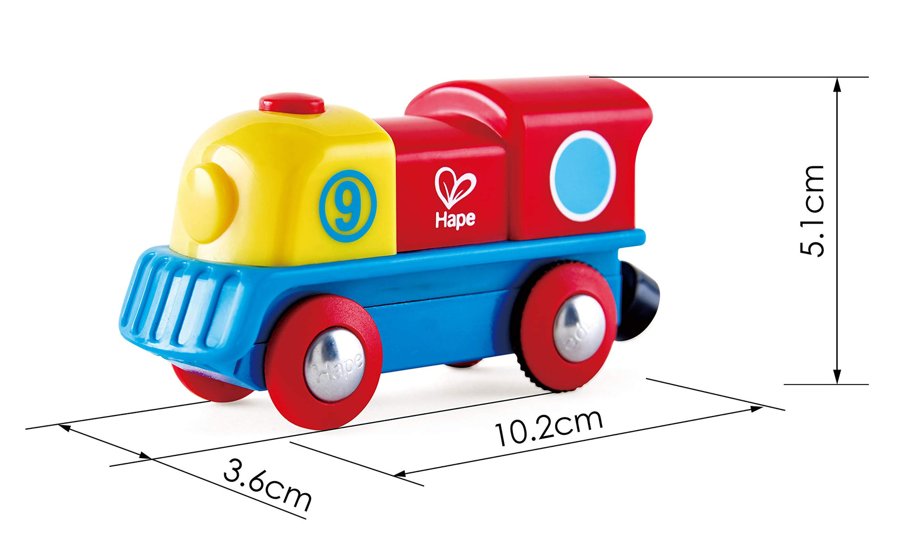Die bunte Lokomotive von Hape ist super kraftvoll und kann schwere Lasten Hügel hinaufziehen oder lange Strecken zurücklegen. Die leuchtend bunte Lok ist kompatibel mit anderen Zug-Sets und verfügt über eine magnetische Kupplung am Heck. Außerdem hat die tapfere kleine Lokomotive auch einen Bedienknopf, der sich auf der Oberseite befindet. Sie verfügt auch über Vorwärts- und Stopp-Positionen, die einfach von Kinderfingern gedrückt werden können. Die tapfere kleine Lokomotive von Hape bringt eine ideale Spieldimension ins Kinderzimmer. Mit der Batterie ist sie kraftvoller als andere Loks und ermöglicht so, dass Hügel und Rampen erklommen werden können. Wenn die Bewegung der Lok über die Knöpfe auf der Oberseite gesteuert wird, dann erwacht das Zug-Set zum Leben. Unterstützt die feinmotorische Entwicklung Der bunte Zug ist außerdem sehr ideal geeignet, um koordinative Fähigkeiten bei Kleinkindern zu entwickeln. Nach der Lokomotive zu greifen, sie hochzuheben und zu rollen kann die Hand-Auge-Koordination und die Gelenkigkeit der Finger fördern. Die Kinder werden sich daran erfreuen, die Lok vor- und zurückzurollen. Was Hape bietet Spielzeug von Hape fördert Kinder in jeder Entwicklungsphase und hilft ihnen, ihre natürlichen Fähigkeiten zu entfalten und weiterzuentwickeln. Alle von Hape vertriebenen Produkte erfüllen sämtliche geltenden Sicherheitsstandards und übertreffen diese sogar häufig. Unsere Spielzeuge sollen zum Spielen, Lernen und Erforschen der Welt, in der wir leben, anregen. Durch verantwortungsvolle Geschäftspraktiken wollen wir dazu beitragen, die Welt in einem besseren Zustand zu hinterlassen, als wir sie vorgefunden haben.