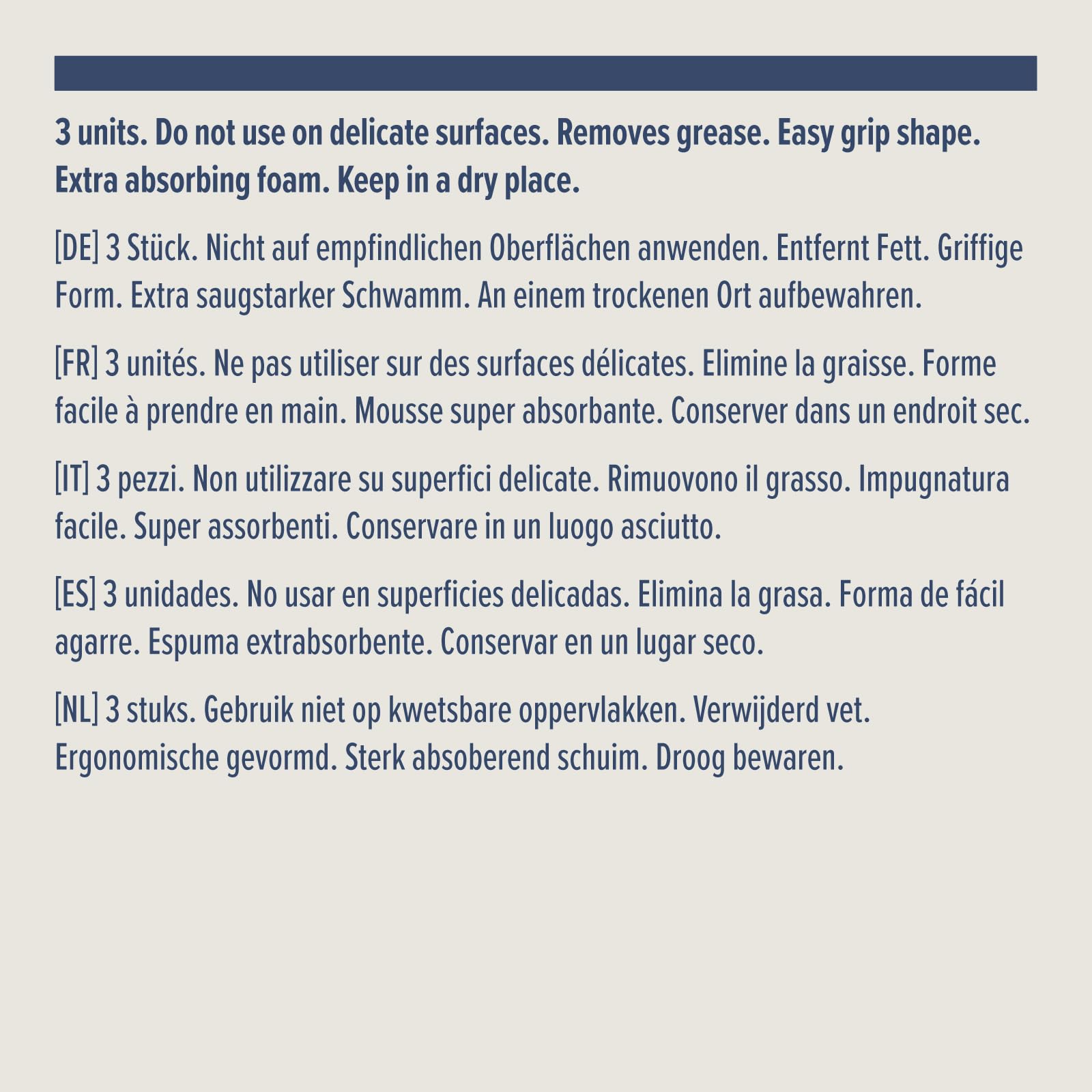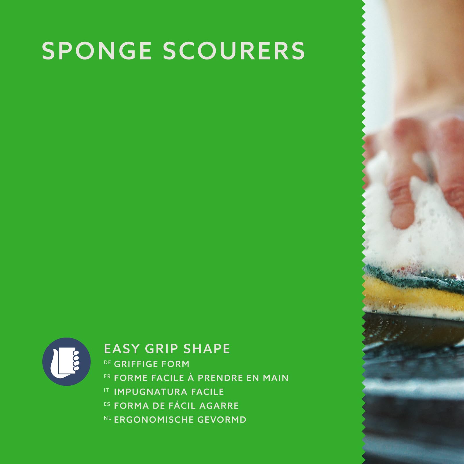 Einzelheiten: Scheuerschwämme. Für diverse hartnäckige Aufgaben. Griffige Form. Ergonomisches Design. Verpackung mit Aufreißsystem und einzelnen Hüllen. Stark bei hartnäckigen Flecken. Besonders saugstarker Schaum. Nicht für empfindliche Oberflächen geeignet.