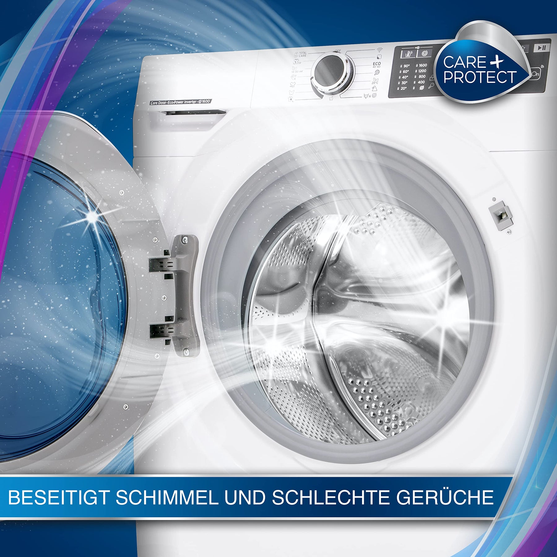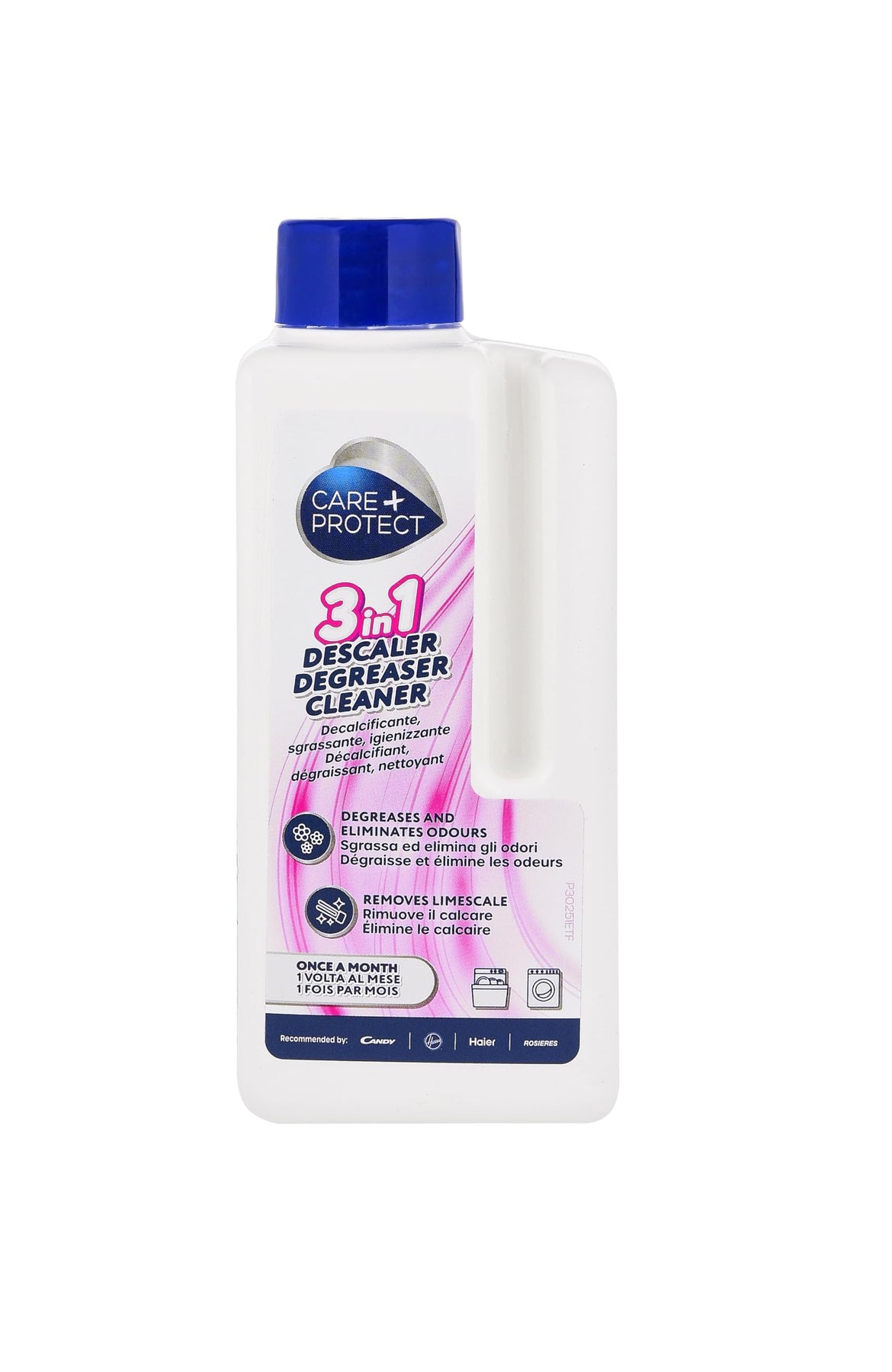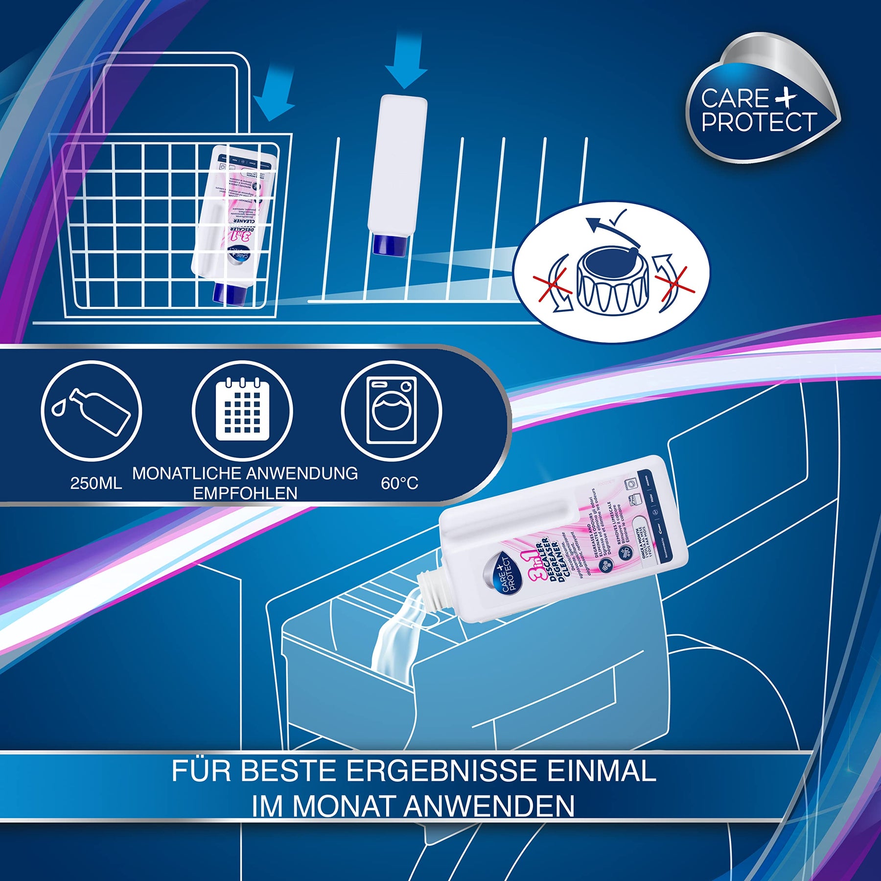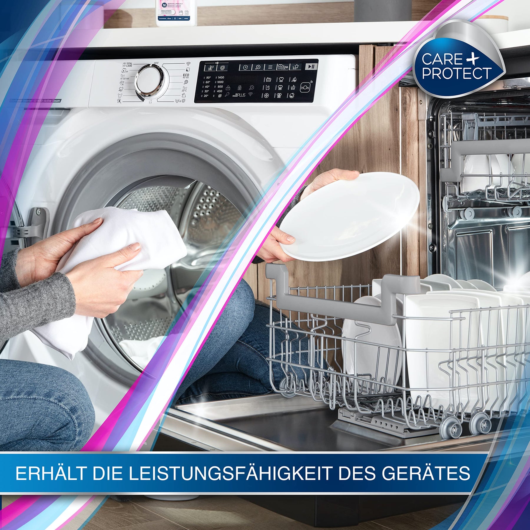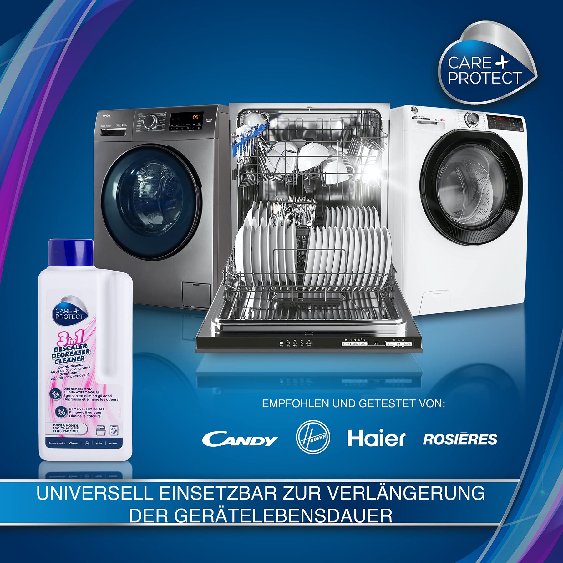 - LIEFERUMFANG: 1x CARE+PROTECT 3-in-1 Entkalker, Fettlöser und Reiniger für Waschmaschine und Geschirrspülmaschine. Menge: 250 ml