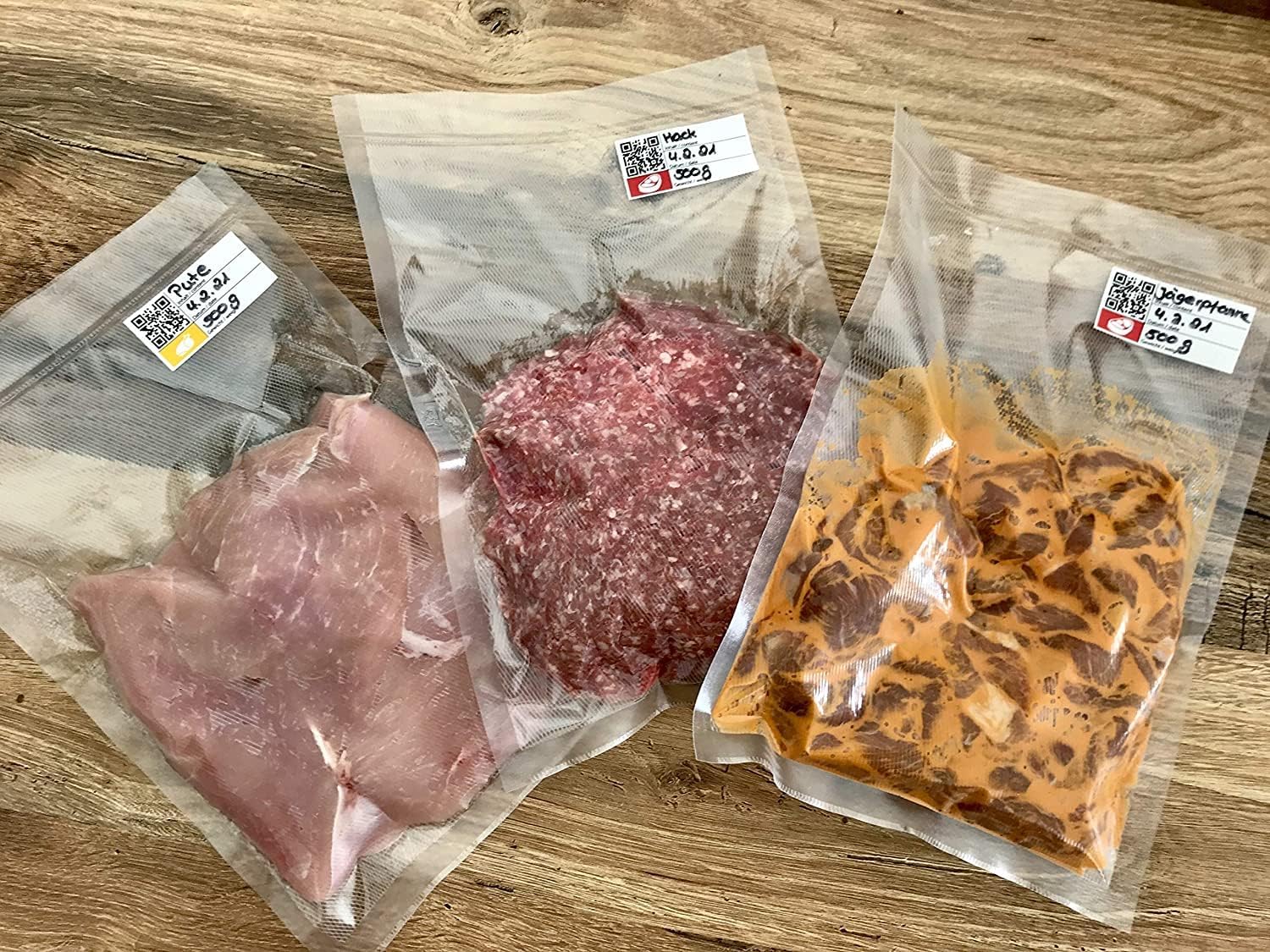 Einzelheiten: CASO ProfiFolien für Ihren Vakuumierer: 6SterneQualität für lang anhaltende Frische und natürliches Aufbewahren ohne Konservierungsstoffe Ihrer Lebensmittel Damit alles lange frisch und fest verschlossen bleibt, ist die Qualität der Vakuumierfolien besonders wichtig. Die speziellen CASO Vakuumierfolien sind für ein optimales und gleichmäßiges Vakuum mit einer Rippenstruktur versehen. Vitamine und Mineralstoffe bleiben enthalten. Das Material der CASO ProfiFolien ist BPAfrei und sehr stark & reißfest (Materialstärke ca. 160 µm). Somit wird das Durchstoßen von spitzen Gegenständen, wie z.B. Knochen oder Gräten verhindert. Die CASO ProfiFolien sind für die Verwendung in der Mikrowelle geeignet (bis max. 70C). Unser Tipp: Scheiden Sie eine Ecke des Vakuumbeutels ab, damit der beim Erhitzen entstehende Wasserdampf entweichen kann. Zudem sind die CASO ProfiFolien kochfest (im Wasser bei 100 C für max. 4 Stunden) und für SousVide garen geeignet. Neben den vielen Verwendungsmöglichkeiten bieten die CASO ProfiFolien auch die Möglichkeit, Ihre Lebensmittel optimal und lange, z.B. im Gefrierschrank, zu lagern. Natürlich lassen sich nicht nur frische Lebensmittel vakuumieren: Tiefgekühlte Lebensmittel werden so vor Gefrierbrand und Aromaverlust geschützt. Die CASO ProfiFolien sind spülmaschinenfest und wiederverwendbar und geeignet für alle BalkenVakuumierer von CASO Germany und auch für die Marken: Ellrona, Rommelsbacher, LAICA, Gastroback, Foodsaver, Genio, Solis u.v.m. Genießen Sie einfach länger und kochen Sie bewusst größere Mengen mehr vor. Das spart Zubereitungszeit und bares Geld ein Beispiel für Vakuumiervorgang Geben Sie die Lebensmittel in den Folienbeutel. Reinigen und glätten Sie das offene Ende des Beutels . Vergewissern Sie sich, dass das offene Ende vollständig und glatt in der Vakuumkammer platziert ist. Schließen Sie den Deckel und drücken Sie ihn nun auf beiden Seiten fest nach unten. Starten Sie den Vakuumiervorgang. Der Beutel wird nach dem Vakuumieren automatisch verschweißt. Drücken Sie nach diesem Vorgang auf die beiden Entriegelungsknöpfe Anwendungstipp: Verschweißen und Vakuumieren von Folienrollen oder –beuteln, die breiter sind als Ihr Gerät: Eine Seite schräg verschweißen. Anschließend die überschüssige Folie über der schrägen Schweißnaht abschneiden und den Rest der Folie wie gewohnt vakuumieren und verschweißen.