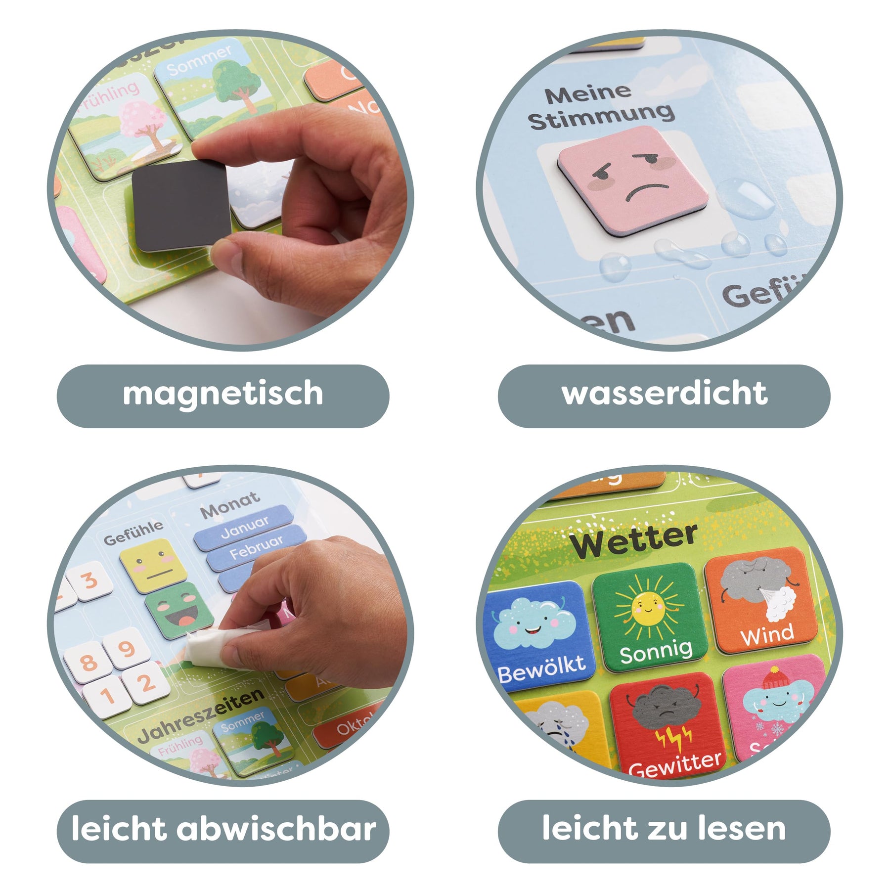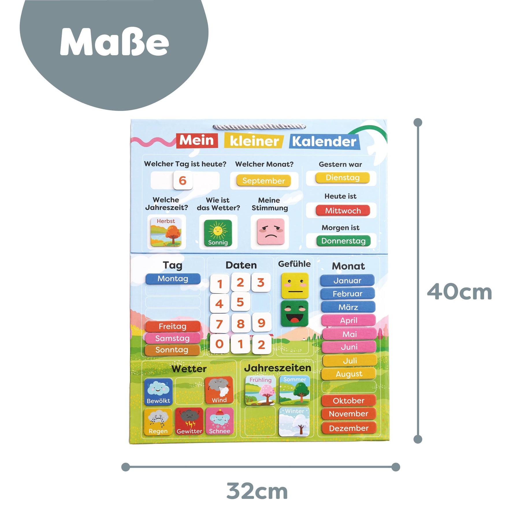 - 📚 Spricht mehrere Sinne an - Durch die Einbindung visueller Elemente für Wochentage und Wetter sowie die taktile Interaktion mit magnetischen Teilen spricht der Kalender mehrere Sinne für effektives Lernen an.