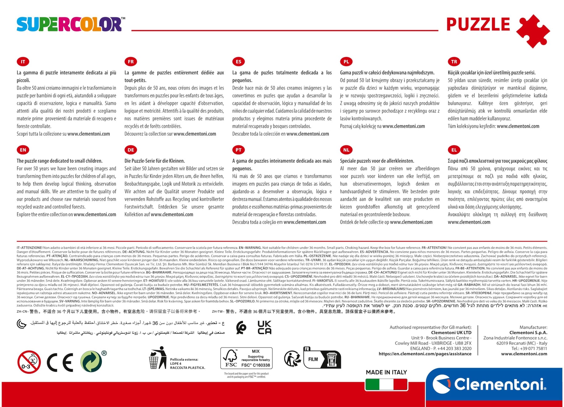 Clementoni Super Color Puzzle ist eine Produktlinie von farbenfrohen und detailreichen Puzzlespielen von Clementoni. Die Puzzleteile sind hochwertig bedruckt und erleichtern das Lösen des Puzzles, da die Farben und Muster als Hilfestellung dienen. Die Motive reichen von Cartoons bis zu Landschaften. Es ist eine unterhaltsame Möglichkeit, Puzzles zu lösen, besonders für Kinder und Anfänger.