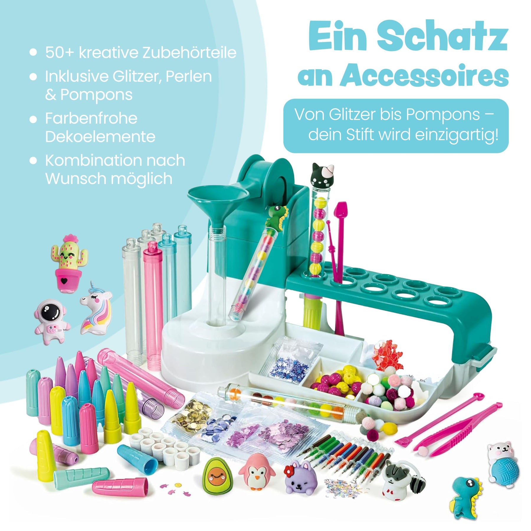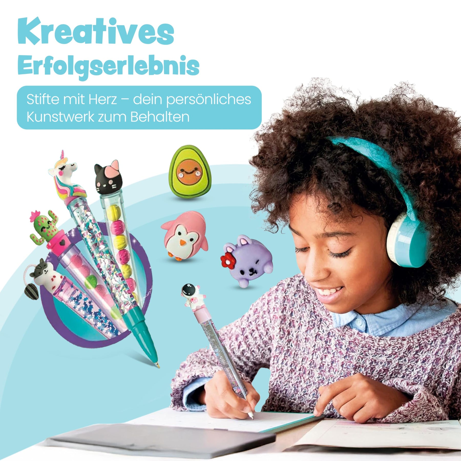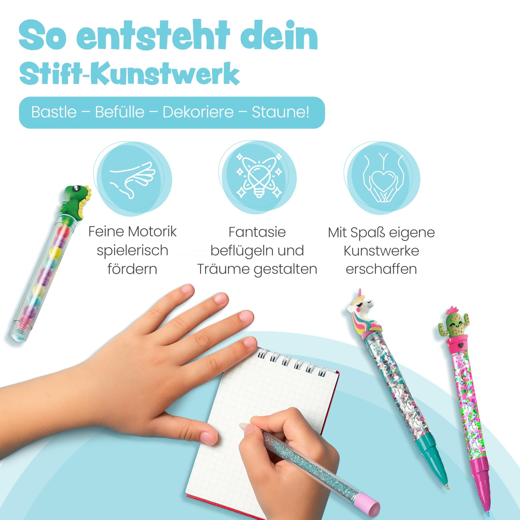 • Lieferumfang: Werkzeuge, Kugelschreiberkörper, Glitterpulverfarben, Mini-Pompons, Kunststoffperlen, Gummifiguren und vieles mehr - Das ideale Kindergeschenk, zu Ostern, Weihnachten oder zum Geburtstag