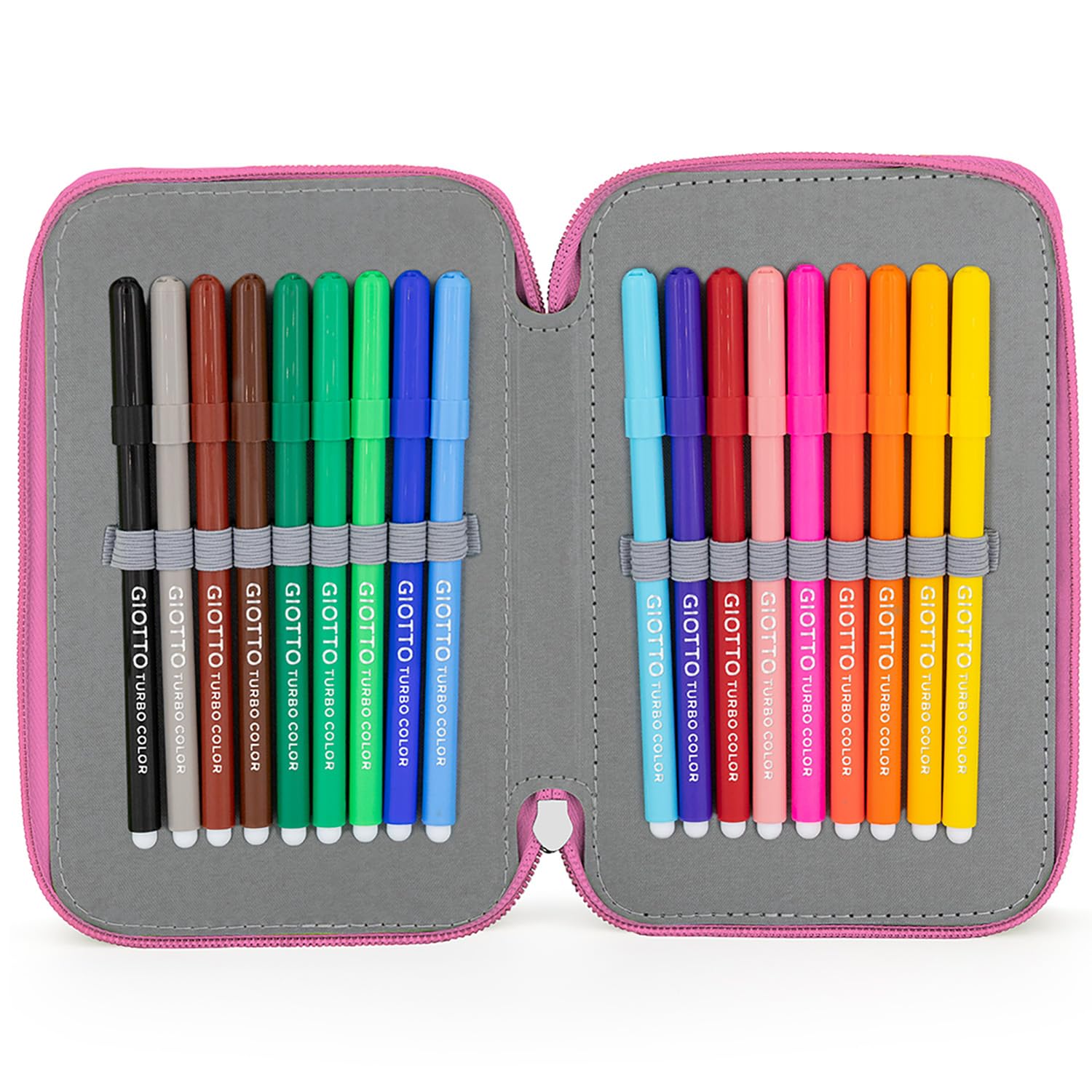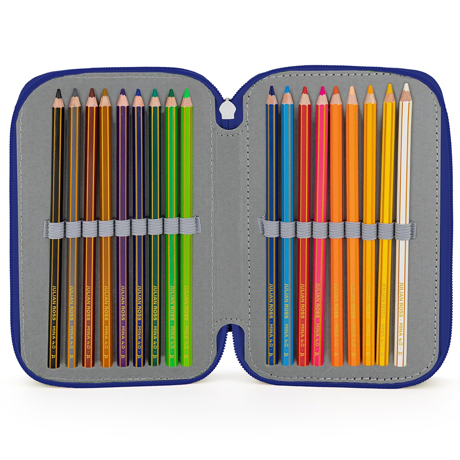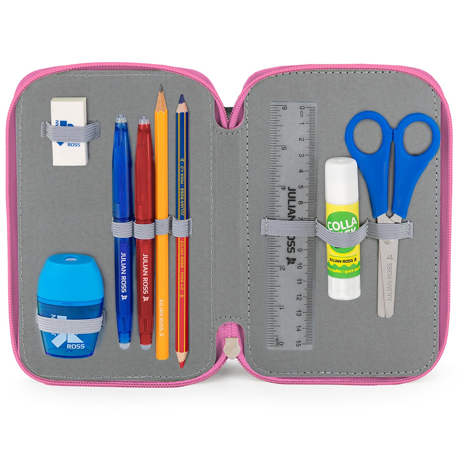- Inhalt des Etuis: dreifaches Fach, 1 blauer löschbarer Gelstift, 1 roter löschbarer Gelstift, 1 Bleistift, 1 roter/blauer Buntstift, 1 Radiergummi, 1 Anspitzer, 1 Lineal, 1 kleine Schere, 1 Klebestift, 18 Julian Ross Mina+ Buntstifte 4mm, 18 Giotto Filzstifte. Maße: 20 x 12 x 7 cm.