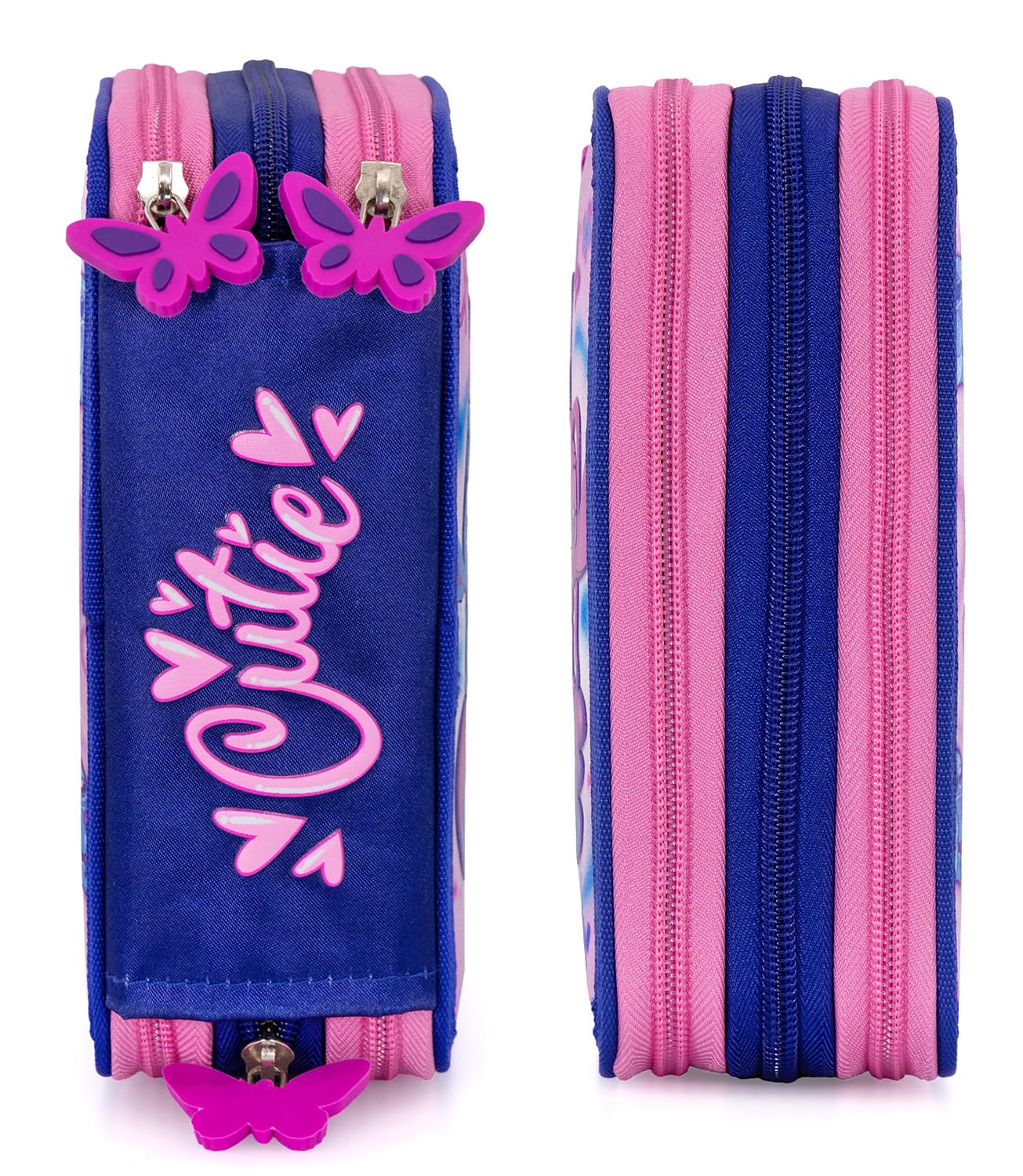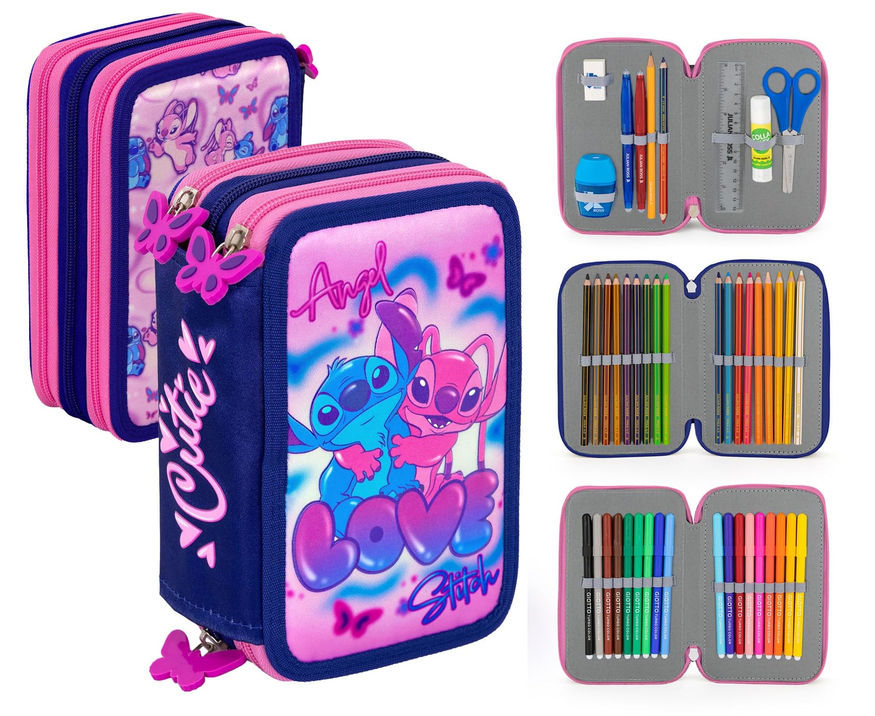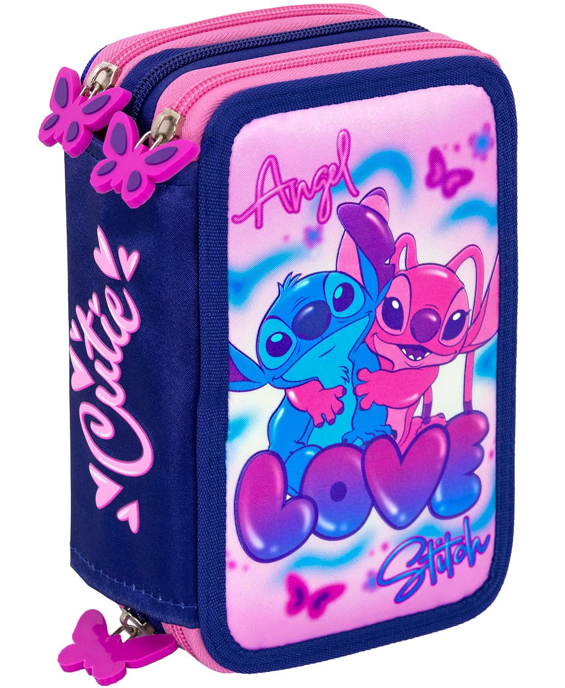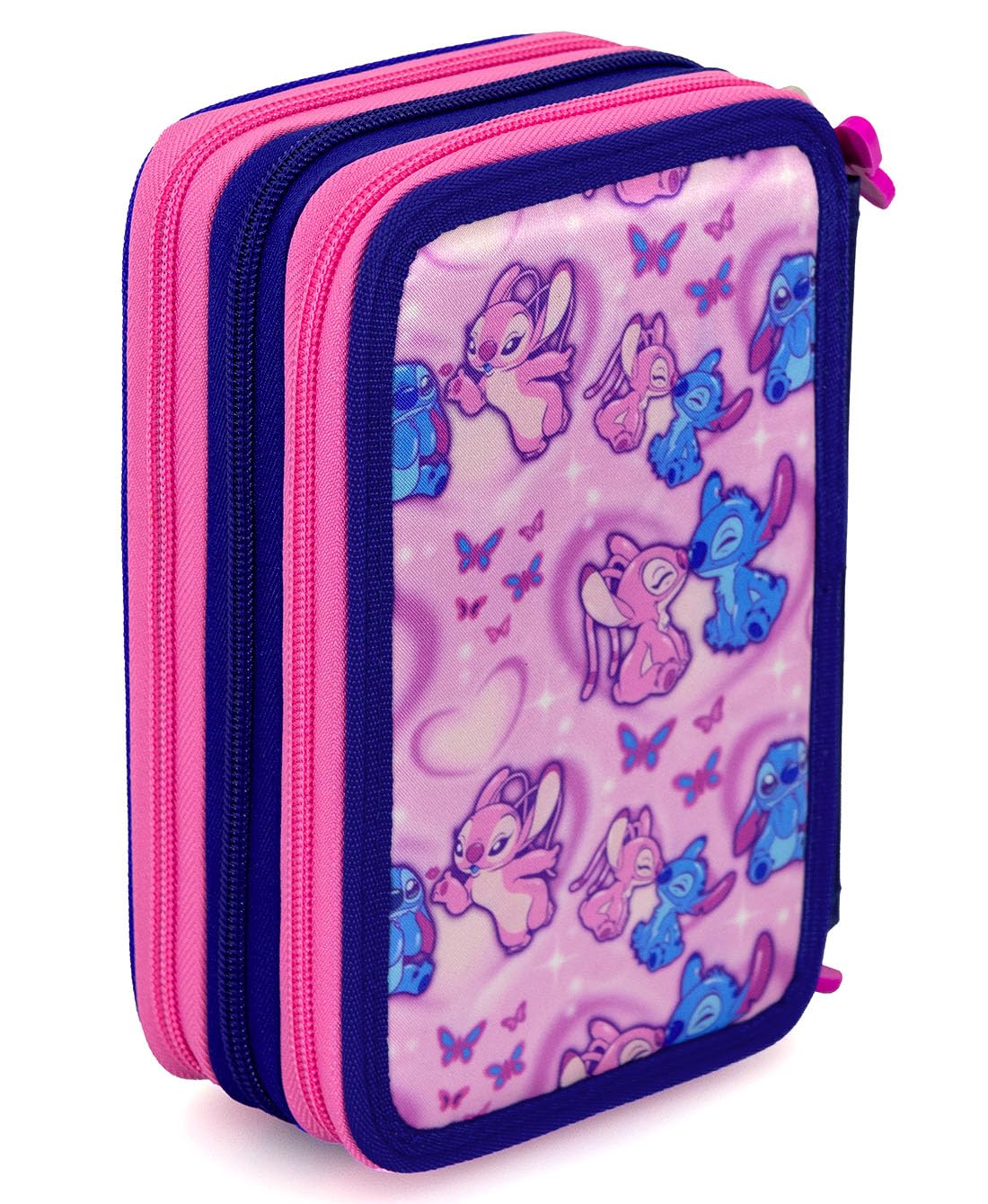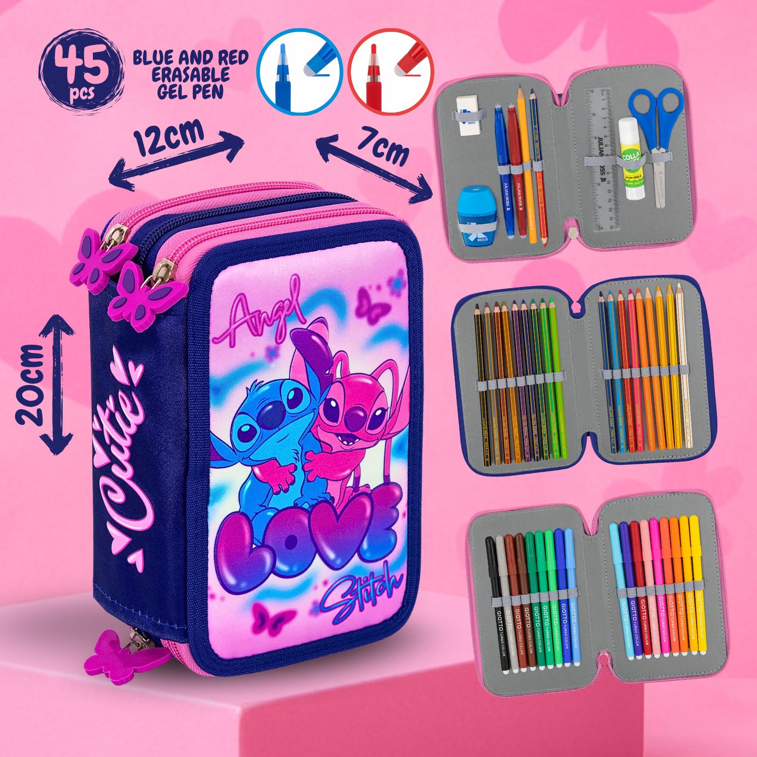 Clondo Dreifach gefülltes Federmäppchen für Mädchen, für Stitch Fan, 45 Schulzubehör, 3 Reißverschlüsse, organisierte Fächer, löschbarer Gelstift, Rosa, Angel
