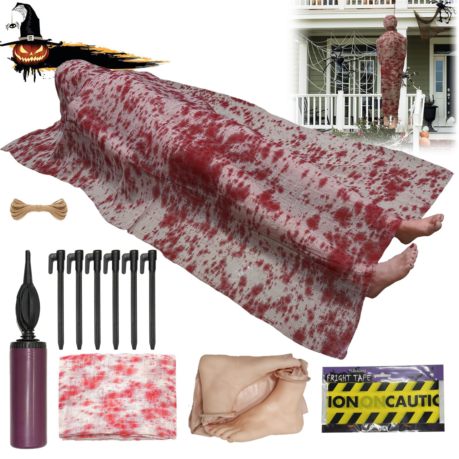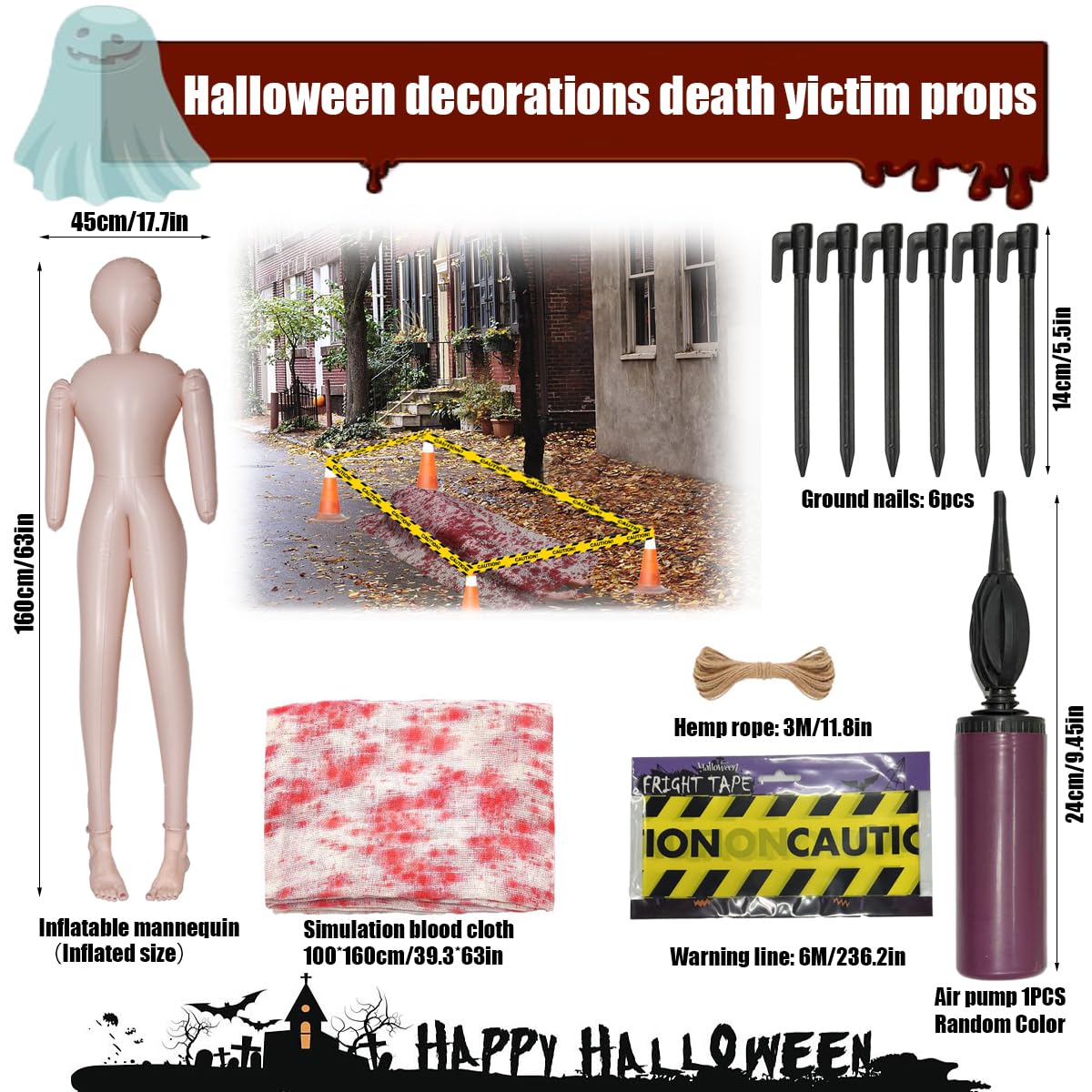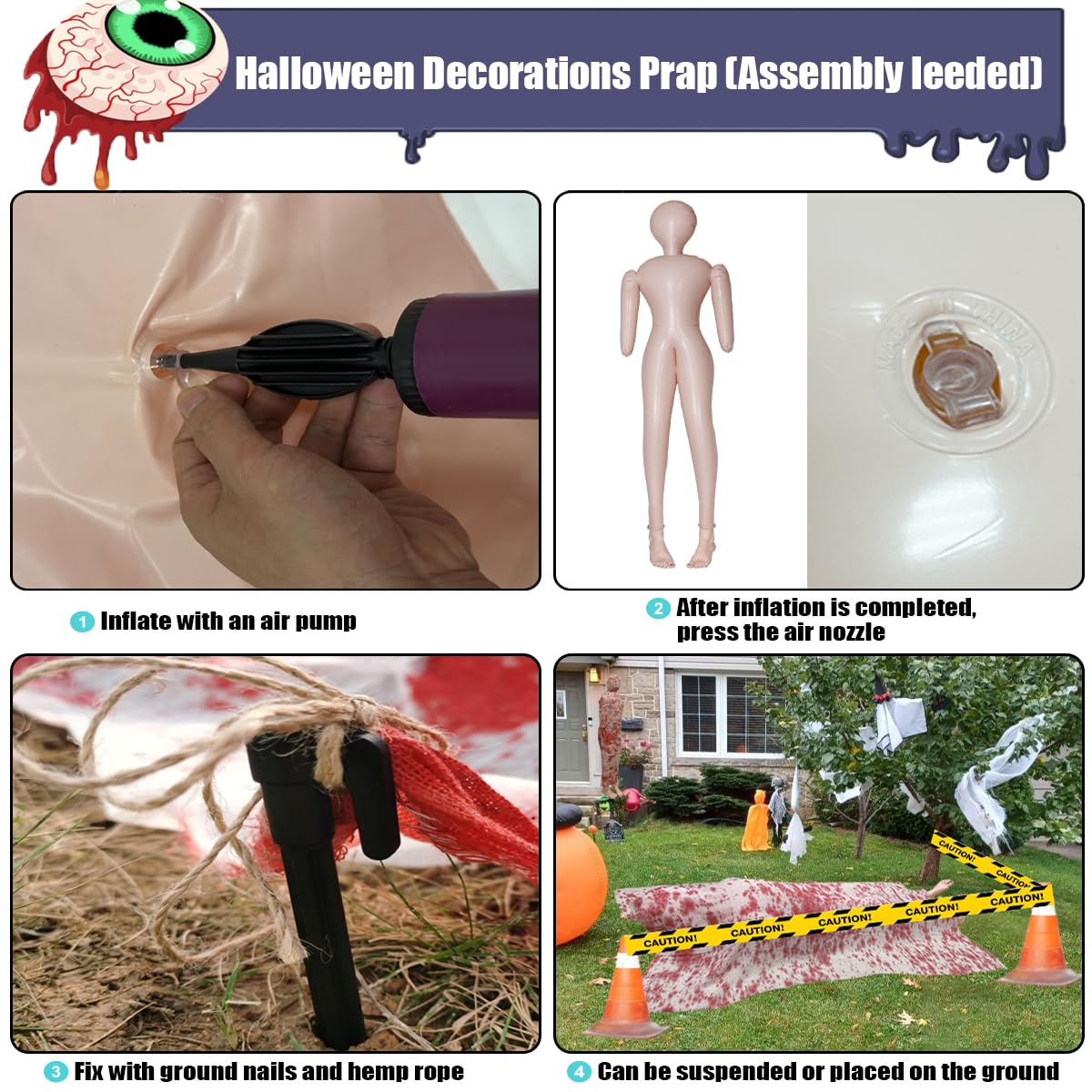 - 【Tote Opfer-Requisiten-Einfache Montage】1. Verwenden Sie einfach eine Luftpumpe, um die Halloween-Leichen-Requisite aufzublasen. 2. Decken Sie die Leiche der Halloween-Requisite mit dem blutigen Tuch ab und befestigen Sie sie mit Erdnägeln auf dem Rasen oder hängen Sie sie mit einem Hanfseil auf. 3. Trennen Sie den umliegenden Bereich mit Kordon ab.Fügen Sie Ihrer Halloween Friedhofsszene gruselige und reale Inhalte hinzu.