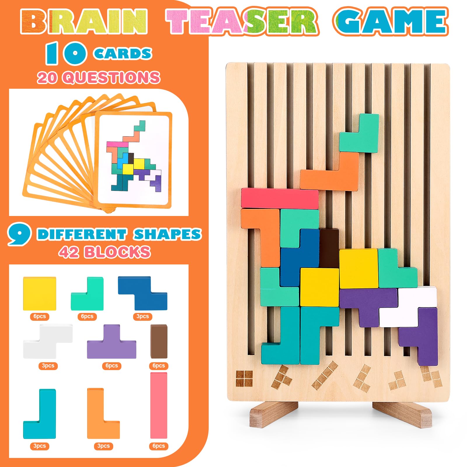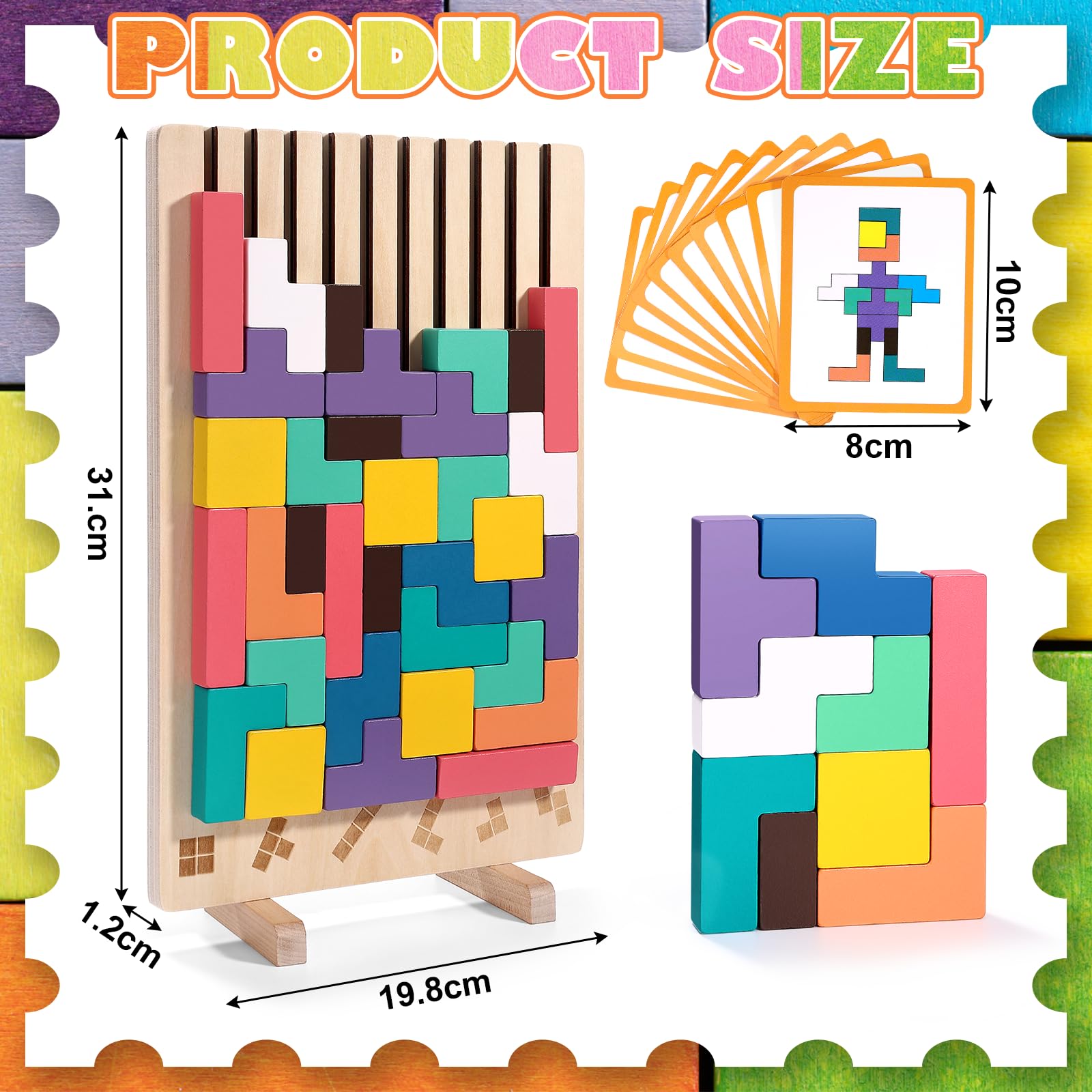 Entdecken Sie das faszinierende Tetris Holzspiel Montessori Spielzeug – ein pädagogisch wertvolles Sensorik-Bausteine-Puzzle, das Kinder in die Welt der Geometrie und Logik einführt! Dieses hochwertige Montessori Spielzeug besteht aus 42 bunten, geometrischen Holzblöcken in verschiedenen Formen und 10 anspruchsvollen Herausforderungskarten.