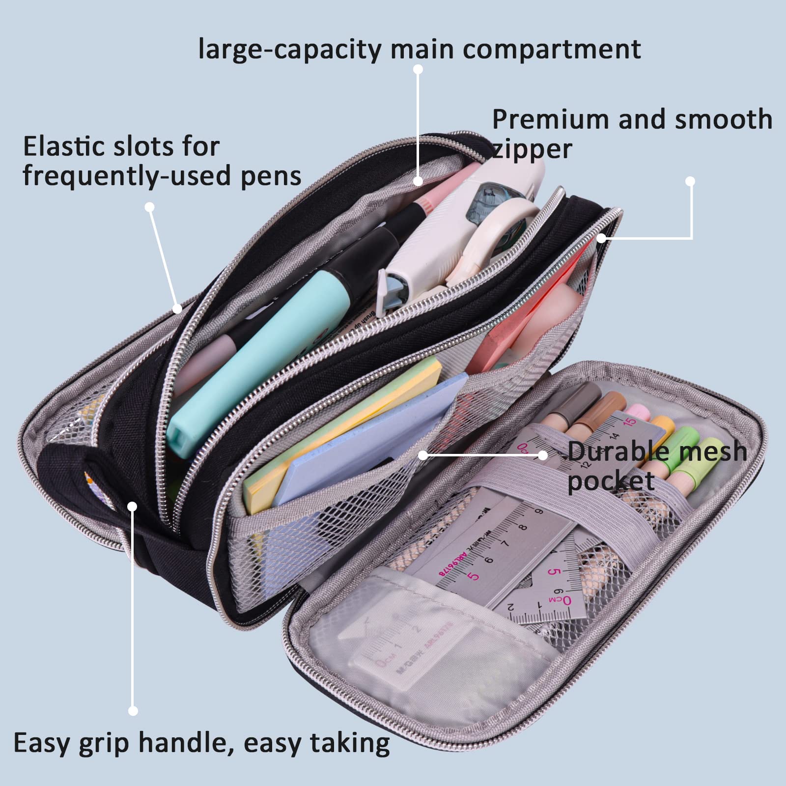 • ✏️[PRAKTISCHES DESIGN] Das Federmäppchen groß ist mit 3 Fächern mit unterschiedlichen Aufbewahrungsfunktionen ausgestattet. Das mittlere Hauptfach bietet den größten Platz für die Aufbewahrung von bis zu 30 Stiften. In den beiden Seitenfächern können häufig verwendete Stifte, Bleistifte und Lineale untergebracht werden. In den Netztaschen lassen sich Haftnotizen, Radiergummis und andere Kleinigkeiten unterbringen. Behalten Sie Ordnung in Ihren Sachen. Einfach zu benutzen, einfach zu finden.