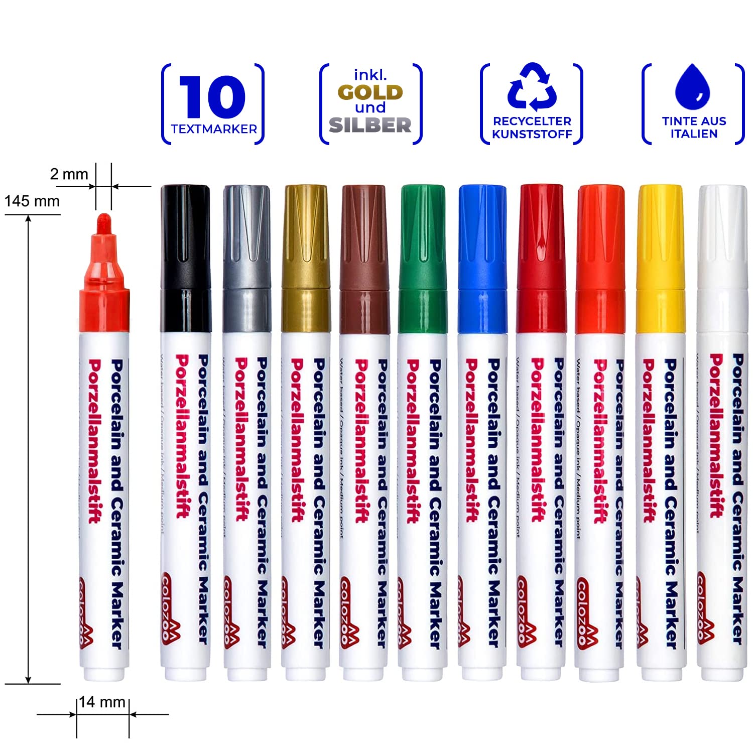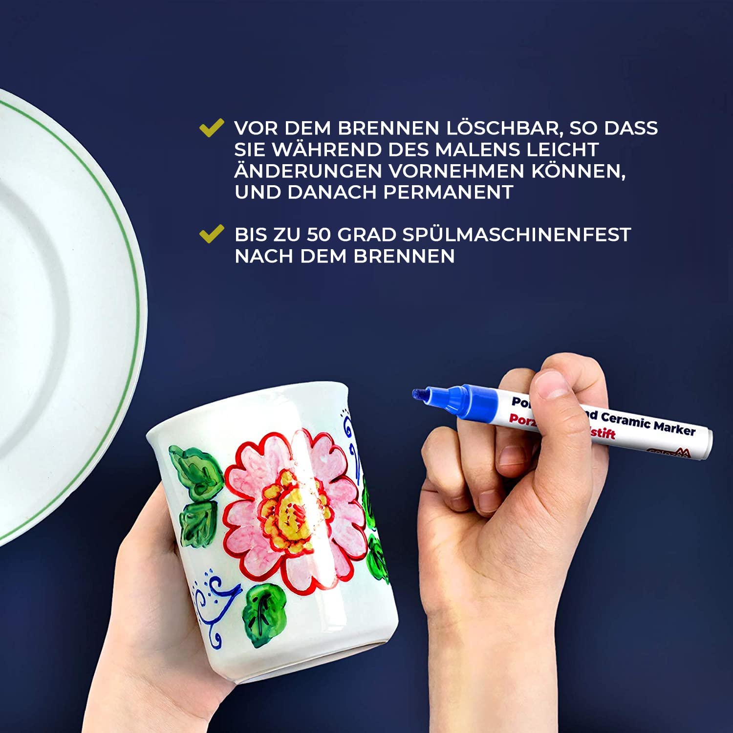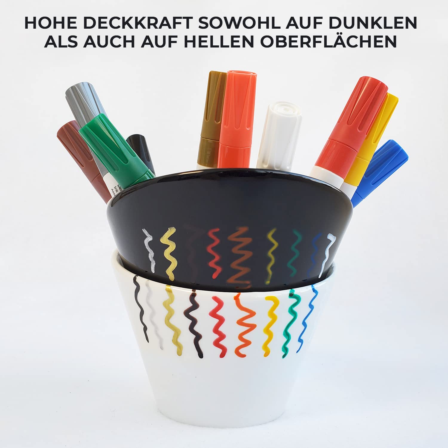 - ✏️ HOHE DECKKRAFT — Glasstifte wasserfest spülmaschinenfest können problemlos auch auf dunklen Oberflächen verwendet werden — Das Keramik Bemalen Set enthält 10 kräftige Farben, darunter: Rot, Grün, Blau, Gelb, Orange, Braun, Schwarz, Weiß und Metallic-Gold und Silber