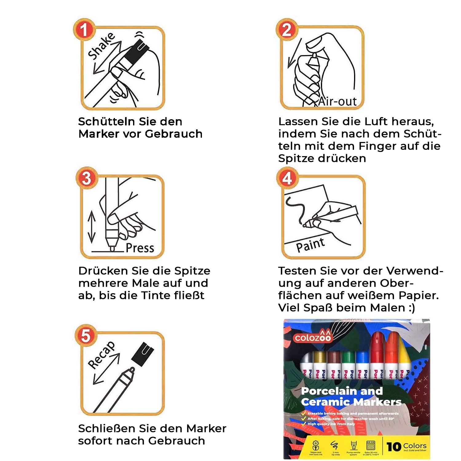 - ✏️ DIE MARKE COLOZOO — Keramik Stifte zum bemalen spülmaschinenfest geplant und entworfen in Deutschland, um den europäischen Marktstandards zu entsprechen.Das Colozoo Stift für Porzellan-malerei spülmaschinenfest Set enthält ein Malen-nach-Zahlen-Motiv, damit Sie Ihre neuen Farben sofort ausprobieren können.