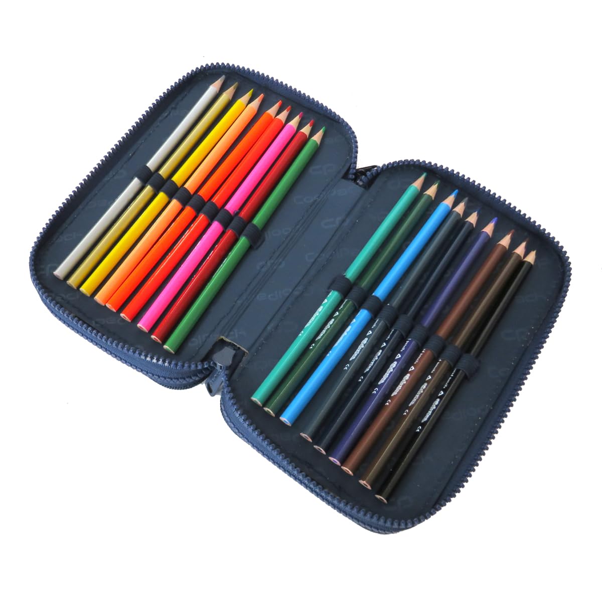 18 kolorów flamastrów 12 kolorów kredek trójkątnych 1 ołówek HB 3 długopisy 1 linijka 15 cm ekierka nożyczki gumka do ścierania temperówka