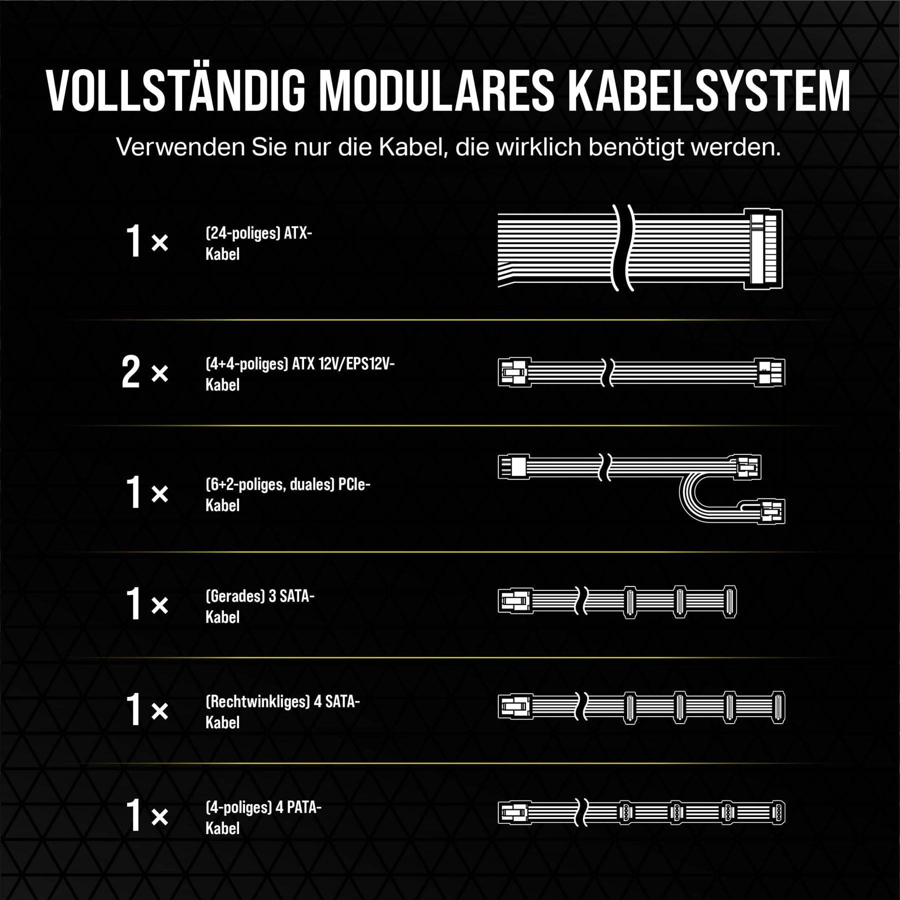- Vollmodulares Netzteil: Zuverlässiges, effizientes und geräuscharmes Netzteil mit vollständig modularen Kabeln, sodass Sie nur die Kabel anschließen müssen, die Ihr System benötigt.